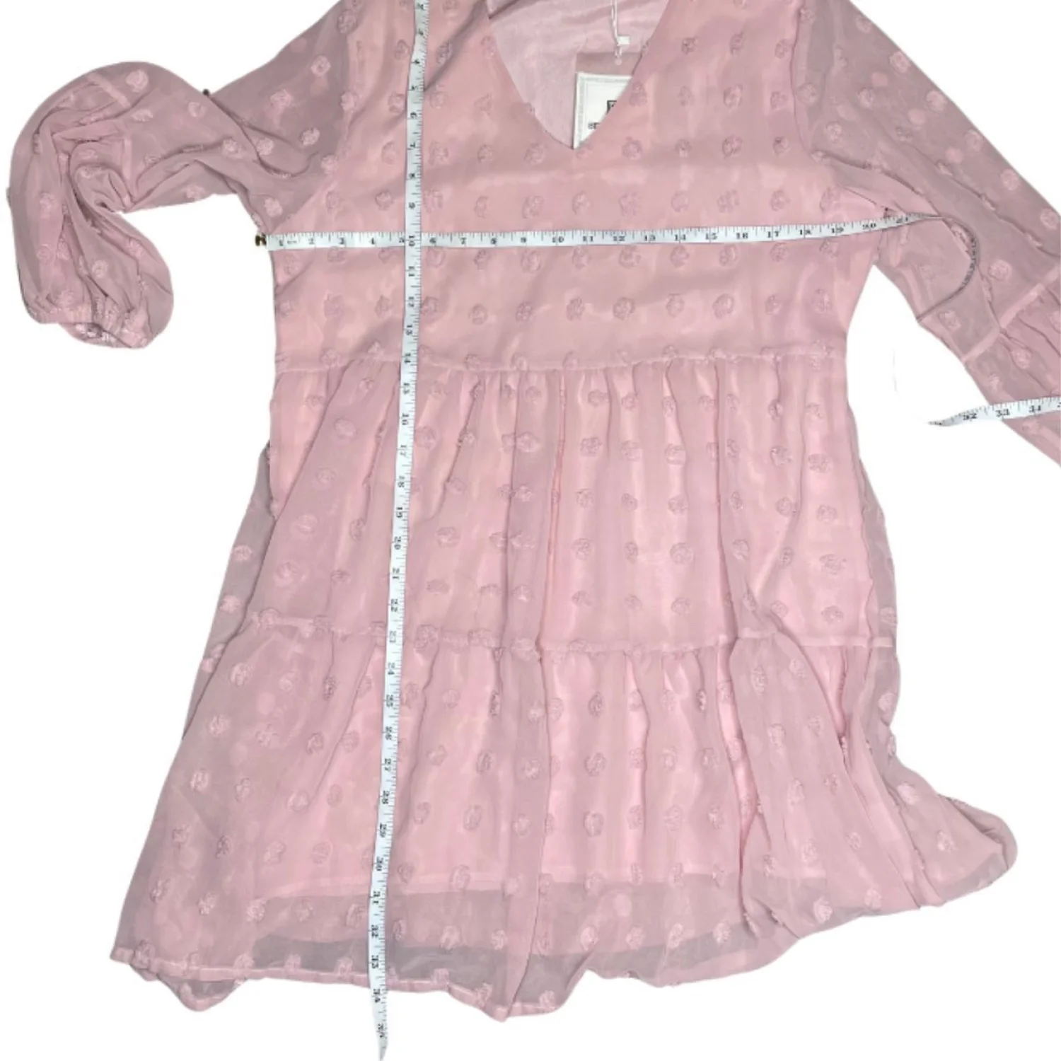 BELONGSCI Pink Coquette Swiss Dot Tiered Mini Dress Bell Sleeve M Features: Dainty pink mini featuring all-over 3D swiss dot texture. Designed with a V-neckline, a flowy tiered skirt, and dramatic flared bell sleeves. The sheer chiffon overlay is balanced by a matching interior lining for coverage. High-volume silhouette with a light, airy movement. • Style Profile: coquette, balletcore, dollette, soft girl, dainty, feminine, tiered, swiss dot, pastel, whimsical, cottagecore • Flaws: No Holes, stains, or tears • Please see photos for measurements (in inches). PTP: 20.5' Length: 34' • Happy to answer your questions! Super Fast Shipper!