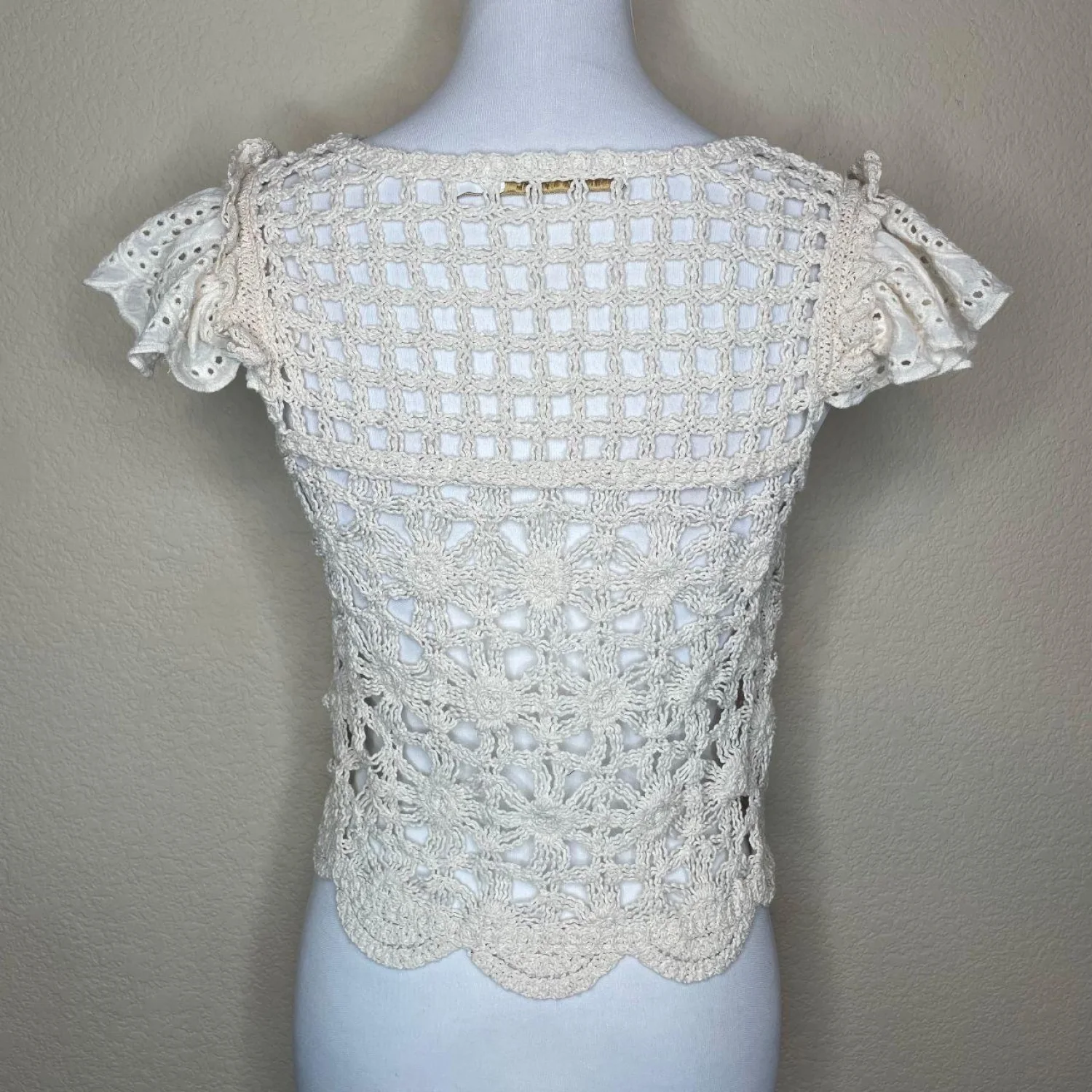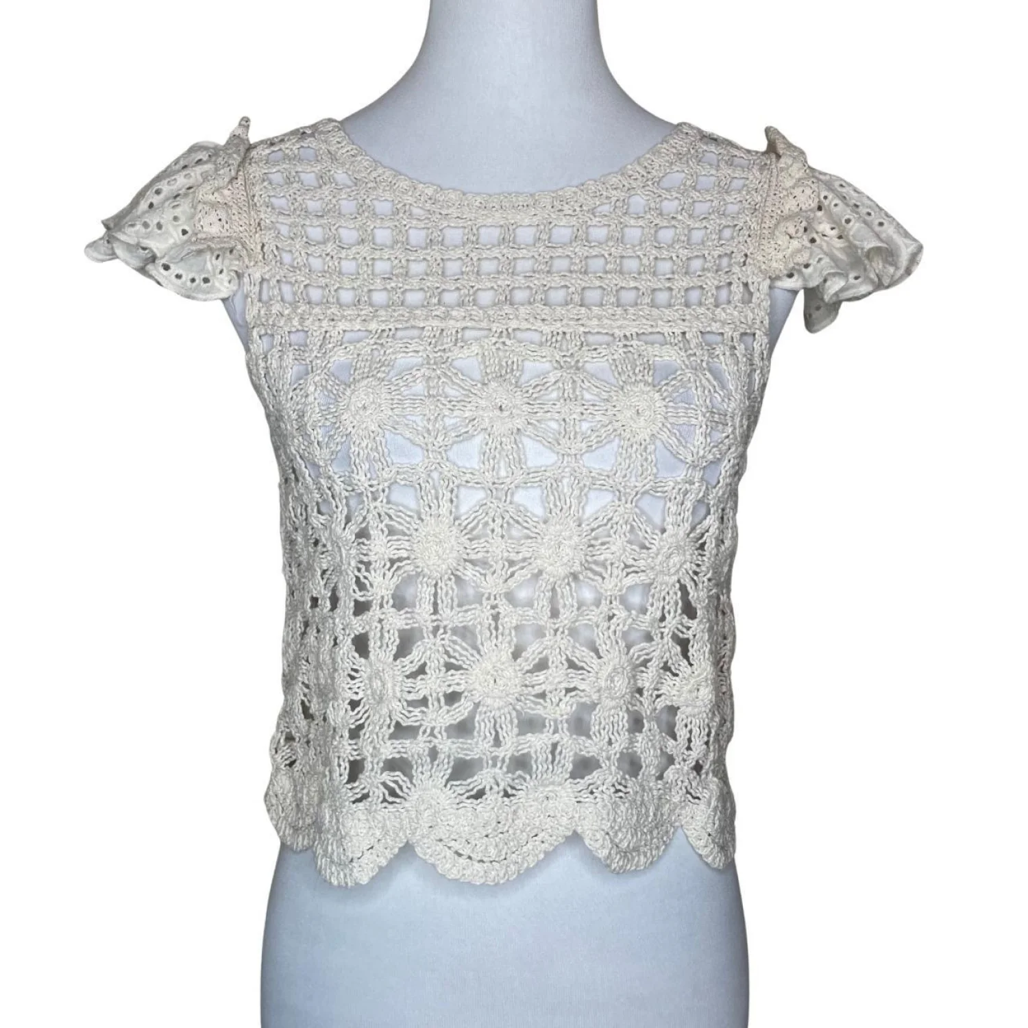 Bishop + Young Ivory 100% Cotton Crochet Eyelet Flutter Sleeve Crop Top XXS