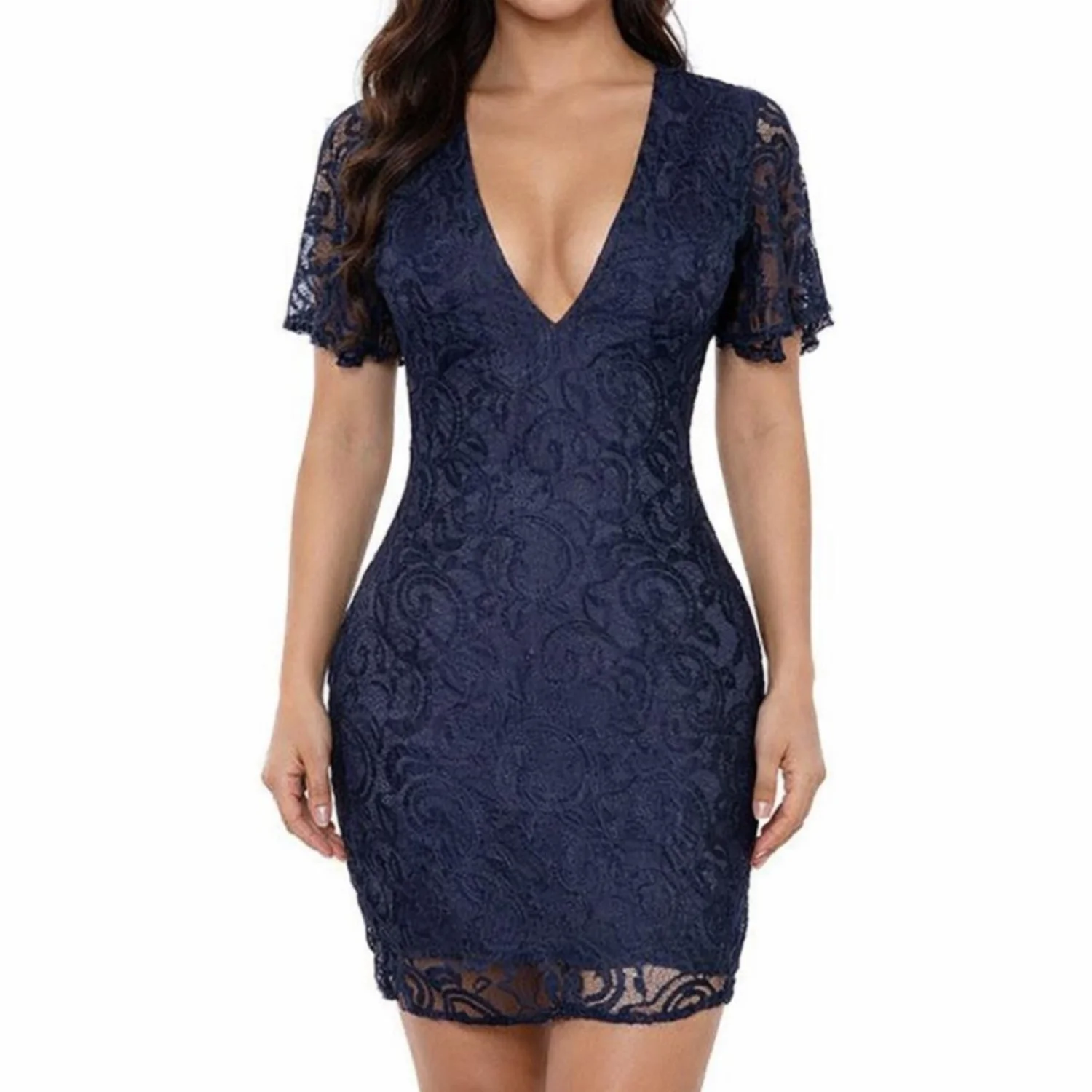 Boohoo Night Black Lace V-Neck Mini Dress Short Sleeve Size US 8 UK 12 Party