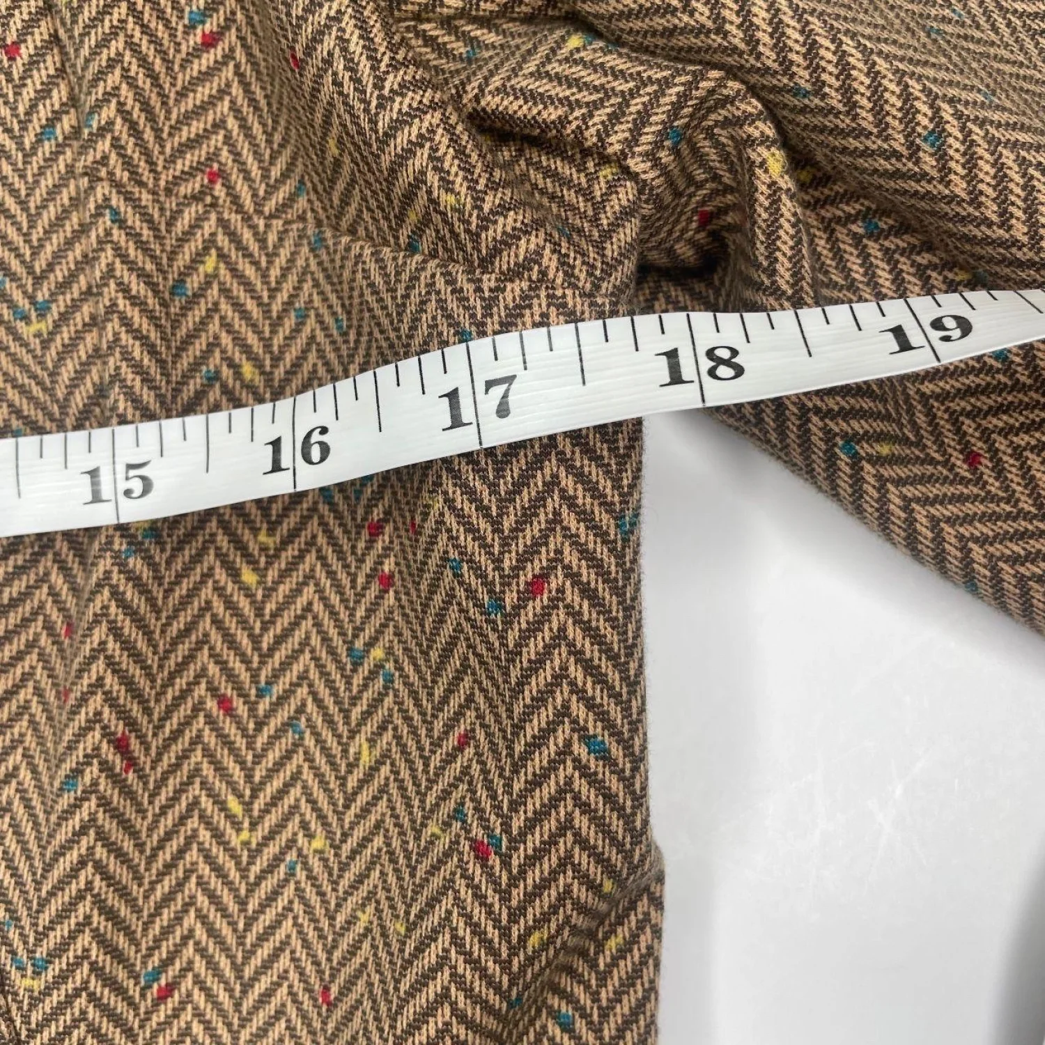 Cabi Penny Cotton Blend Blazer Jacket Herringbone Tweed Confetti Fleck Brown L Features: This sophisticated piece features a classic tan and brown herringbone pattern accented with vibrant multi-colored confetti flecks and darling bow details on the pockets. Crafted from a comfortable cotton-blend ponte knit with a hint of stretch, it offers a slim, tailored silhouette that transitions perfectly from the office to a weekend brunch. • Style Profile: Dark Academia, Grandmacore, Twee, Preppy, Careerwear, Quiet Luxury, Heritage, Collegiate, English Country, Vintage Inspired • Flaws: No Holes, stains, or tears (Excellent pre-owned condition) • All measurements are approximate PTP: 18" Length: 24.5" Sleeve Length: 22.5" Happy to answer your questions! Super Fast Shipper!
