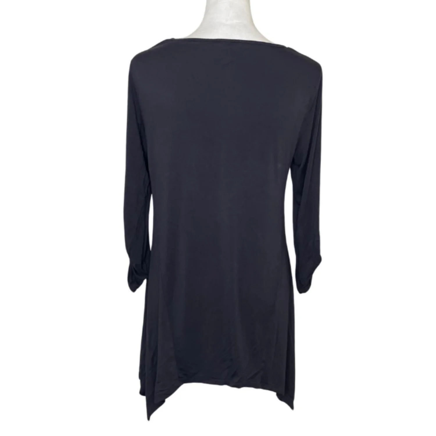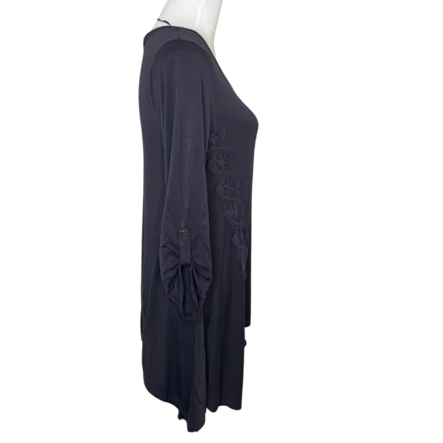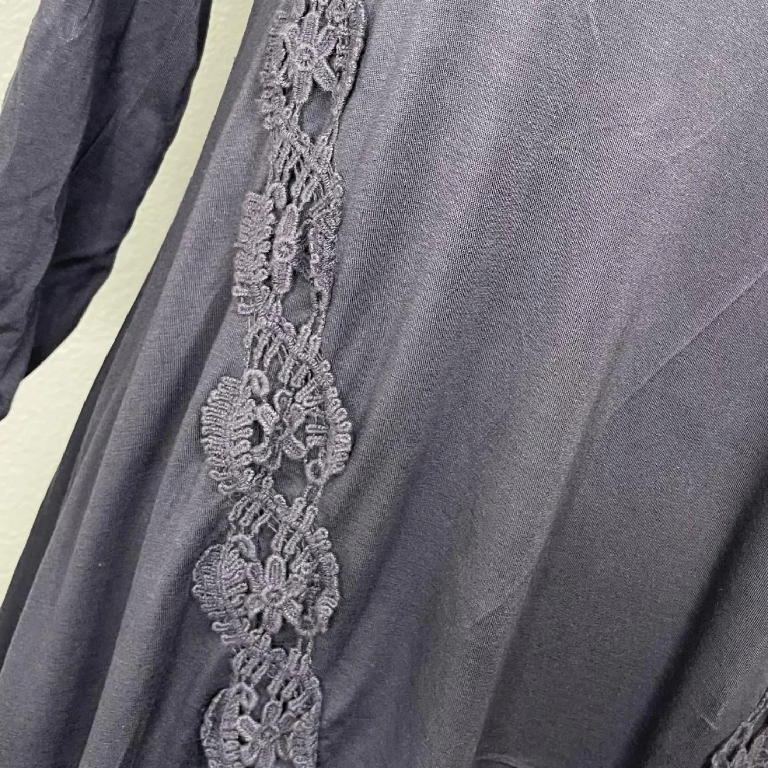 Cable & Gauge Whimsigoth Lace Inset Sharkbite Tunic L Features: This charcoal tunic is for the modern forest witch who needs movement and mystery. The viscose-spandex knit offers a heavy, liquid-like drape that flows into an asymmetrical sharkbite hem. Delicate floral lace insets run down the sides, creating a skeletal, ethereal silhouette. Finished with cinched button-detail sleeves for a gathered, romantic look. • Style Profile: whimsigoth, dark fairycore, forest witch, gothic boho, ethereal grunge, cottagegoth, asymmetrical, lace patchwork, moody academia, layering piece • Flaws: No Holes, stains, or tears • Please see photos for measurements (in inches). PTP: 17.5' Length: 29'-34' • Happy to answer your questions! Super Fast Shipper!