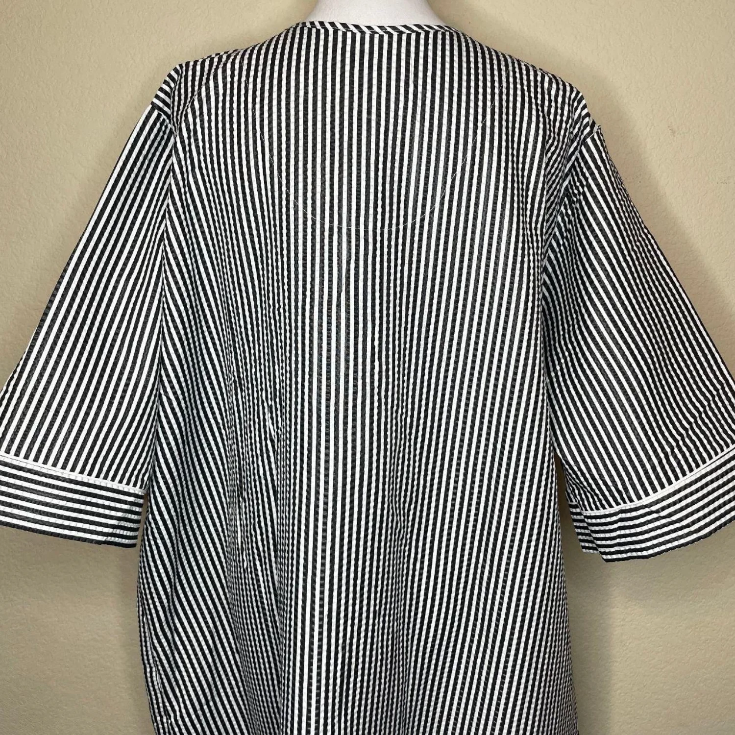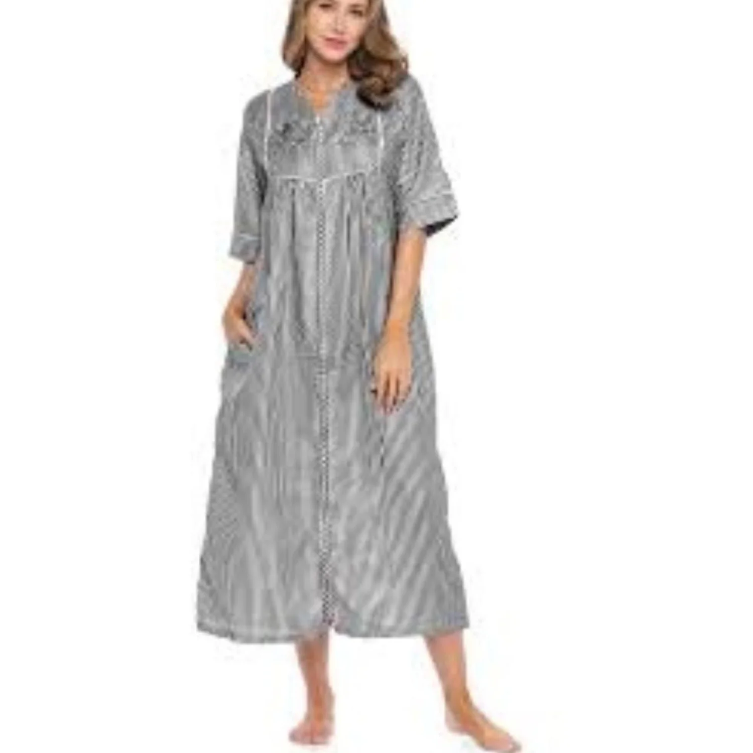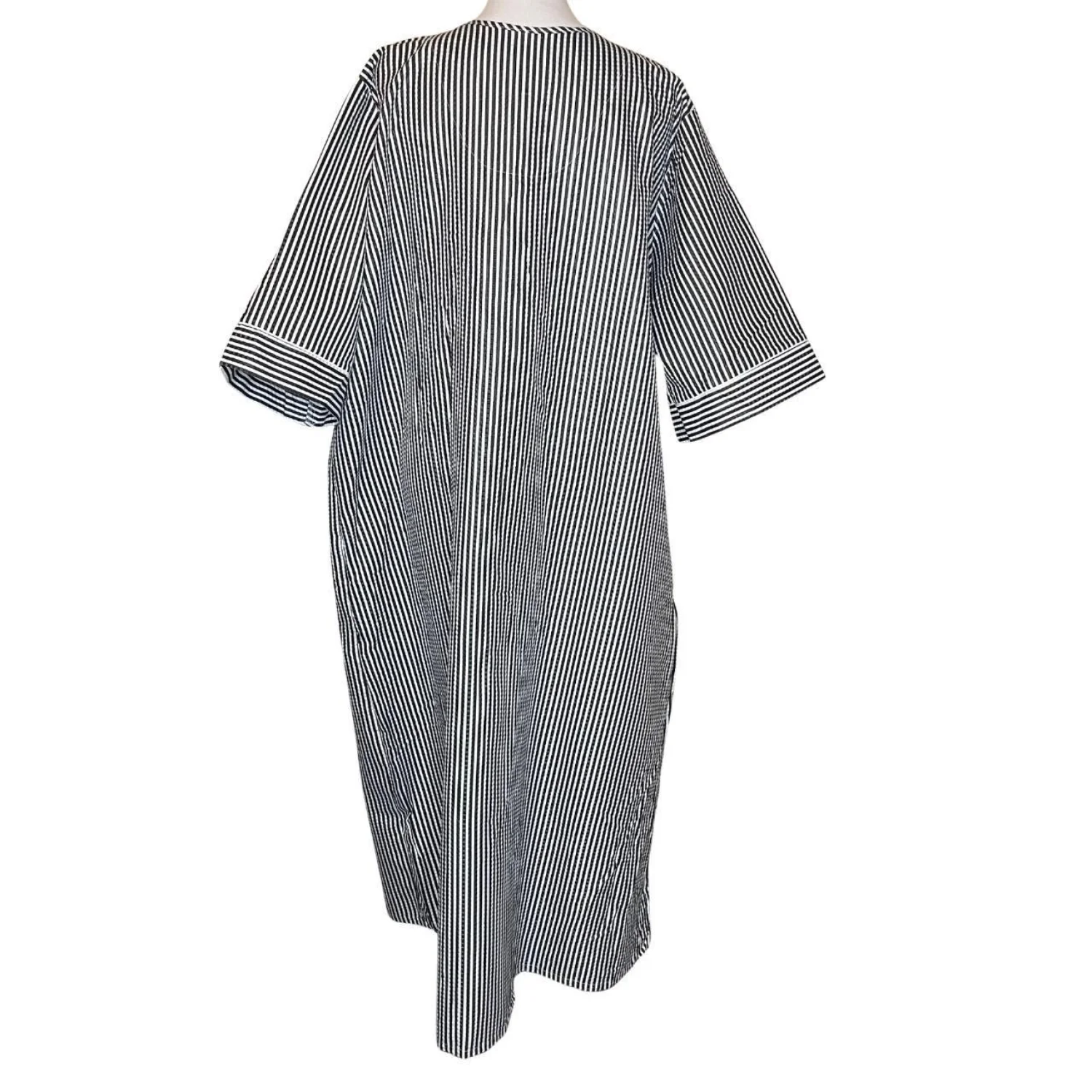 Offers Welcomed🎉 Features: Enjoy comfortable and modest lounging with this classic zip-front nightgown/housecoat by Casual Nights. Made from lightweight, breathable seersucker fabric in a charming black and white vertical stripe. The full-length zipper makes it easy to slip on and off, while the delicate floral embroidery on the yoke adds a charming touch. Perfect for wearing around the house, sleeping, or recovering. • Style Profile: Classic, Modest, Comfortable, Loungewear, Sleepwear. • Flaws: No Holes, stains, or tears • All measurements are approximate PTP: 28' Length: 52.5'