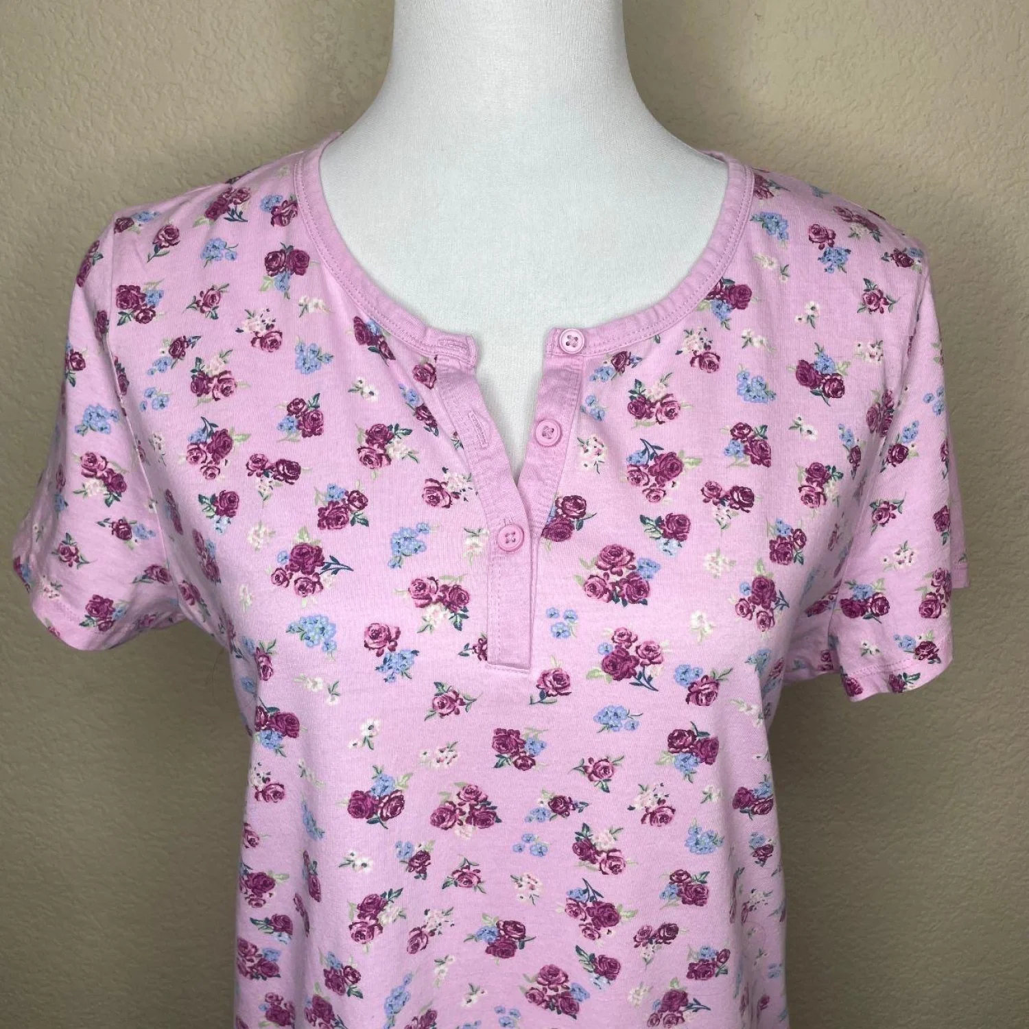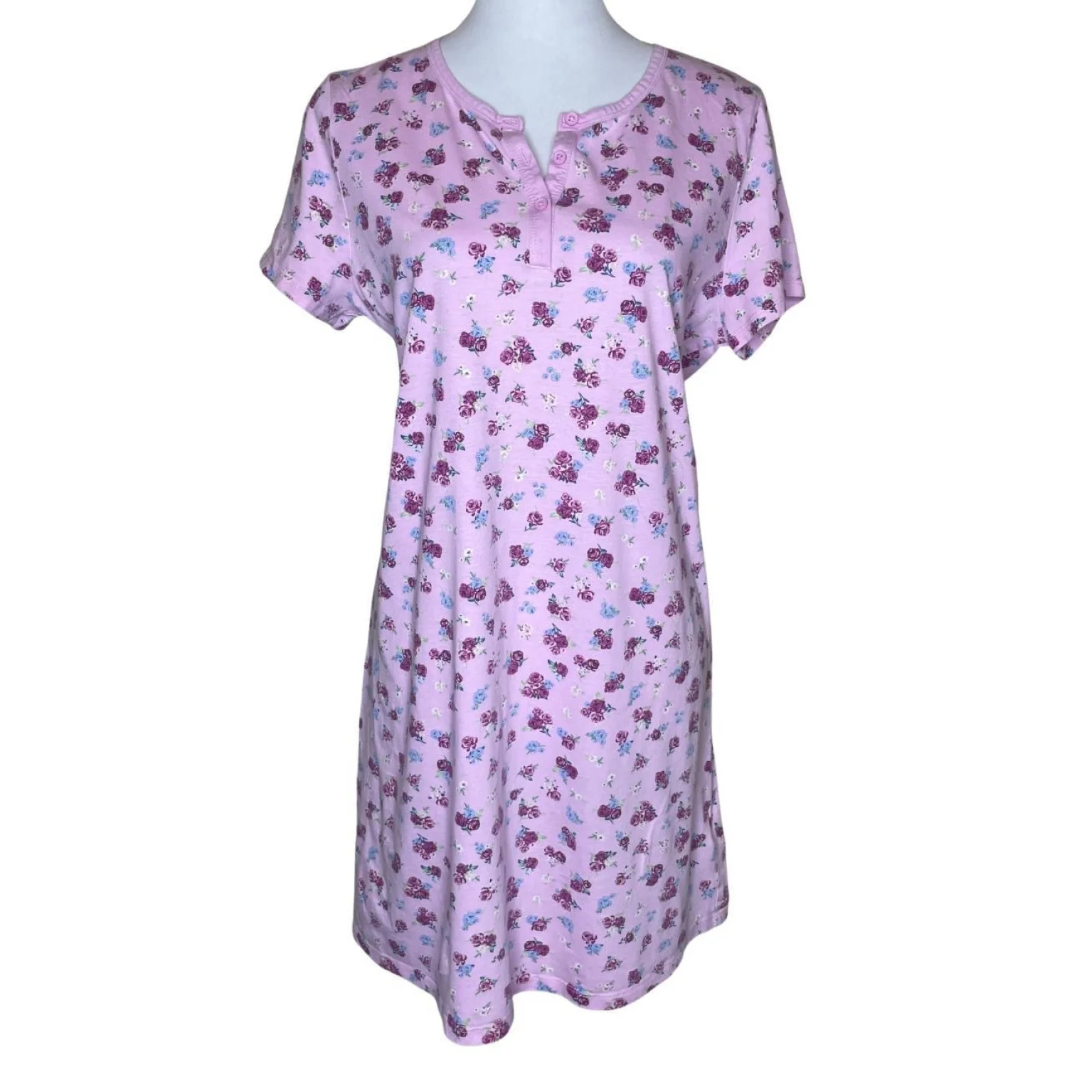 Charter Club Intimates Pink Floral Cotton Nightgown Henley Sleep Shirt Medium ✨ DEALS: I also have this exact nightgown available in BLUE! Check my closet to bundle both and save on shipping! Features: Stay cozy and classic in this Charter Club Intimates floral nightgown. Crafted from 100% breathable cotton, it features a charming pink rose ditsy print with subtle blue accents. The short-sleeve design and 3-button henley neckline make it perfect for year-round lounging. • Style Profile: Cottagecore, Grannycore, Shabby Chic, Coquette, Romantic, Floral, Loungewear, Traditional, Dainty, Breathable Cotton • Flaws: No Holes, stains, or tears (Excellent pre-owned condition) • All measurements are approximate PTP: 19.5" Length: 34" Happy to answer your questions! Super Fast Shipper!