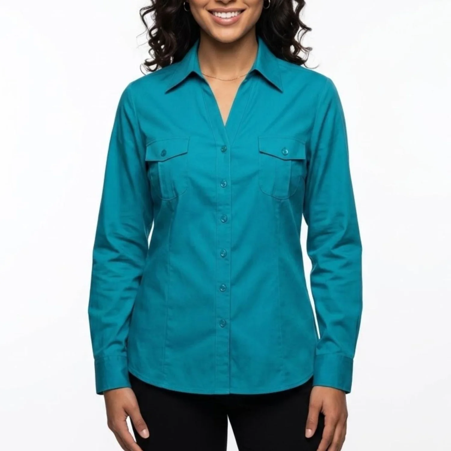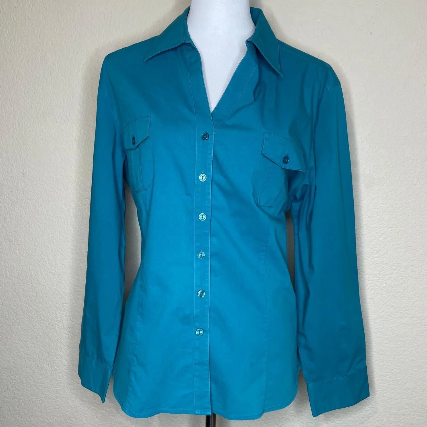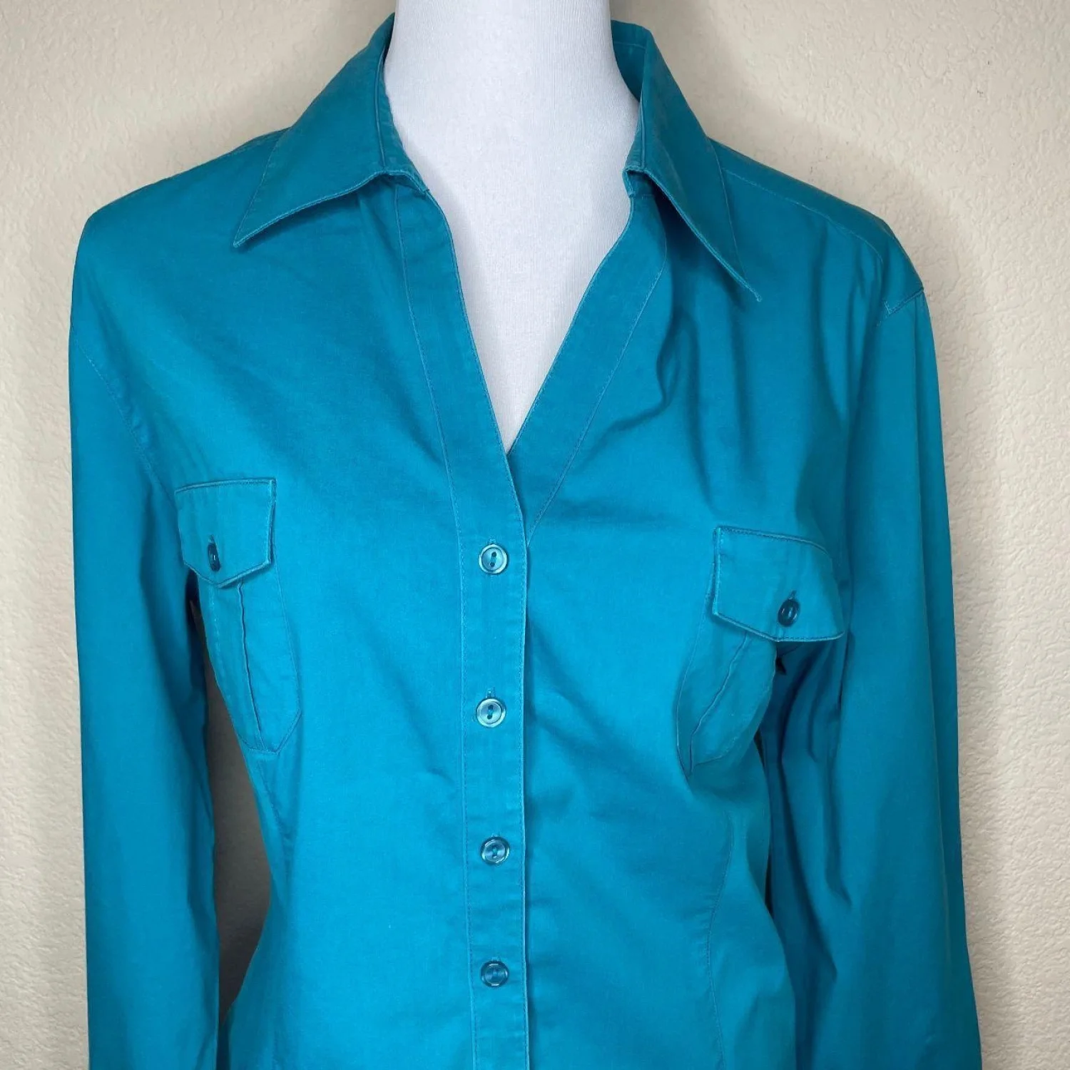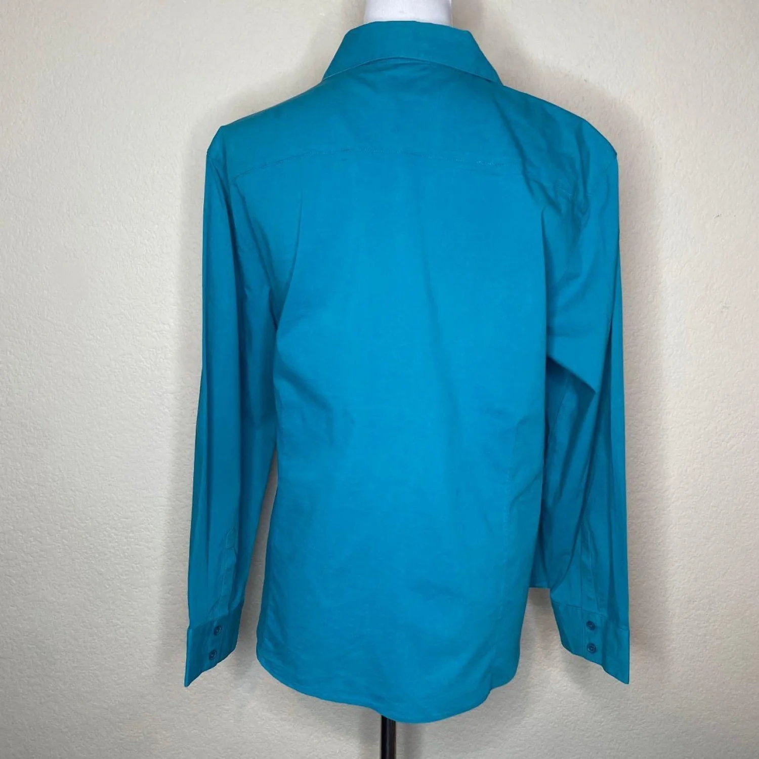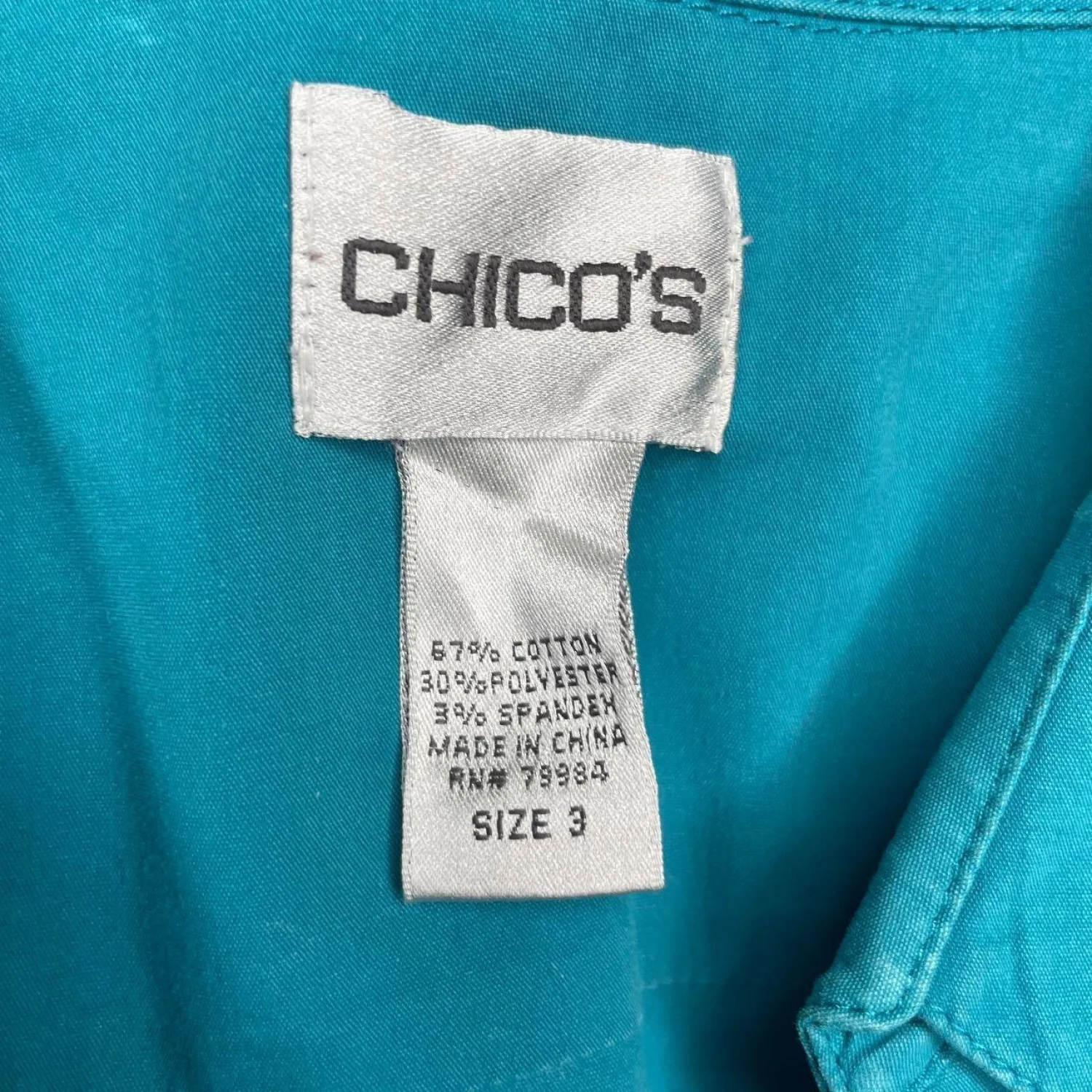 CHICO'S Coastal Grandma Turquoise Button Down Utility Shirt Size 3 XL Features: This vibrant turquoise piece features a structured pointed collar and double chest flap pockets for a crisp, utility-inspired silhouette. The stretch-cotton poplin offers a sharp, tailored drape that holds its shape while providing significant flex through the shoulders and arms. Tonal buttons and a curved hemline keep the profile clean and architectural. • Style Profile: coastal grandma, utility chic, preppy, bright summer, career wear, business casual, minimalist, tailored, turquoise, poplin • Flaws: No Holes, stains, or tears (Excellent pre-owned condition) • All measurements are approximate PTP: 21.5" Length: 25.5" Sleeve Length: 20.5" Happy to answer your questions! Super Fast Shipper!