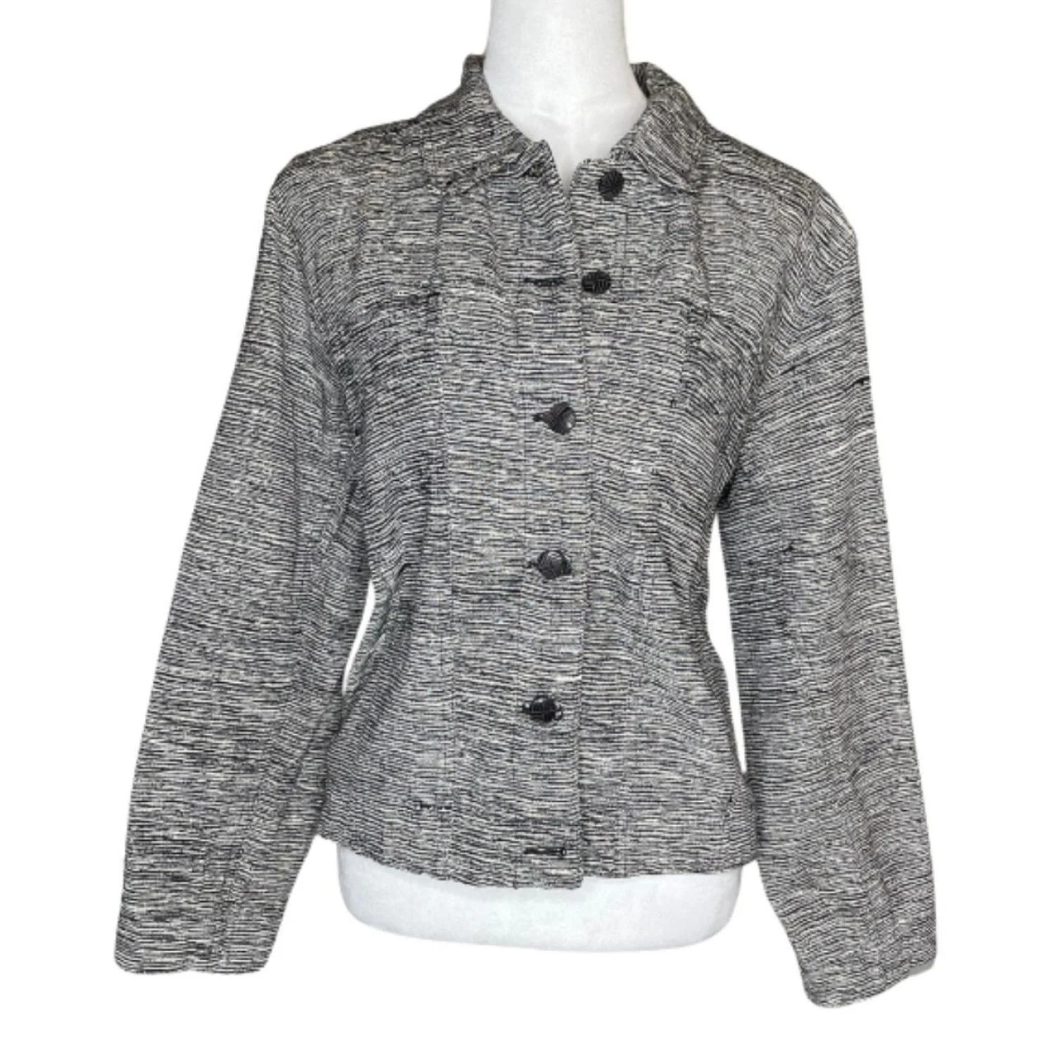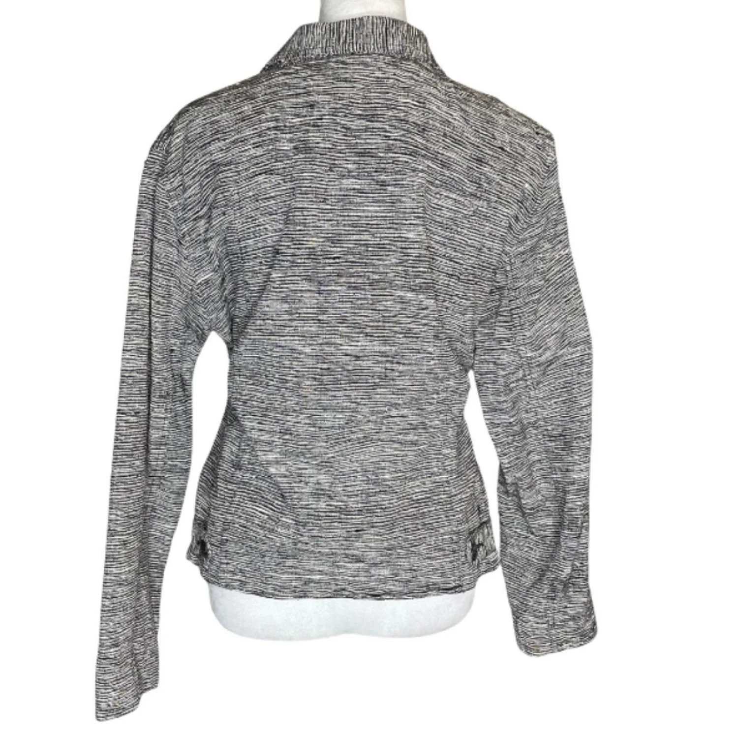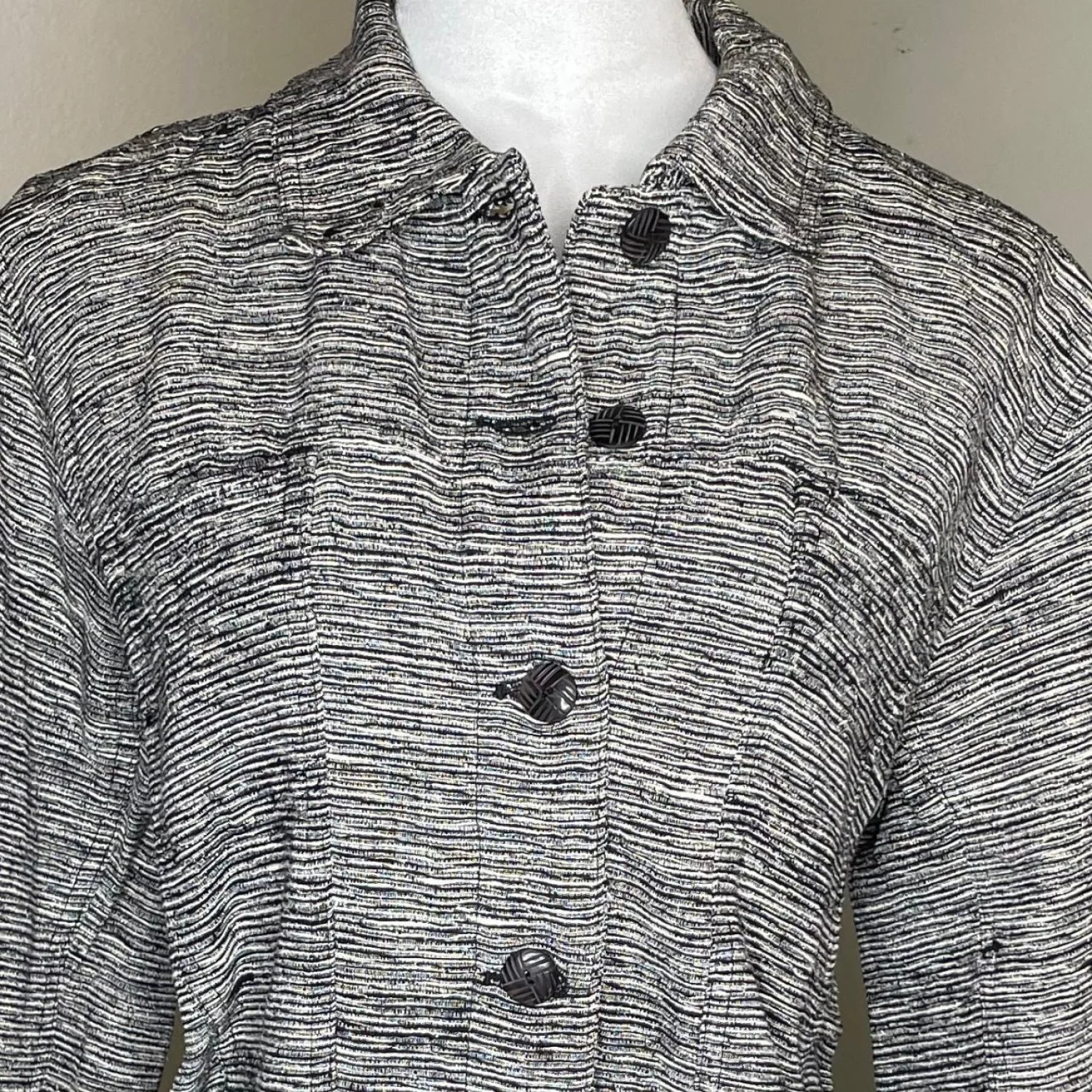 Chico's Design Vintage Silk Cotton Striped Jacket Size 1 M Black White Artsy Features: Chico's Design black and white horizontal stripe jacket. Heavyweight drape from an 80% silk and 20% cotton blend. Features a boxy, structured fit with a textured, ribbed weave. Sharp collar and clean button-down front. No linings, no fluff. Just a solid, architectural piece for a Dark Academia or Whimsigoth rotation. • Style Profile: Dark Academia, Artsy, Minimalist, Light Jacket, Silk Blend, Monochrome, Structured, Textured, 90s Vintage, Whimsigoth, Corporate Goth, Coastal Grandma, Sustainable Fashion, Mid-Century Modern, Neutral • Flaws: No Holes, stains, or tears • Size: 1 which is a Medium size 8 for the brand • Please see photos for measurements (in inches). PTP: 20.5' Length: 22' Sleeve Length: 22' • Happy to answer your questions! Super Fast Shipper!