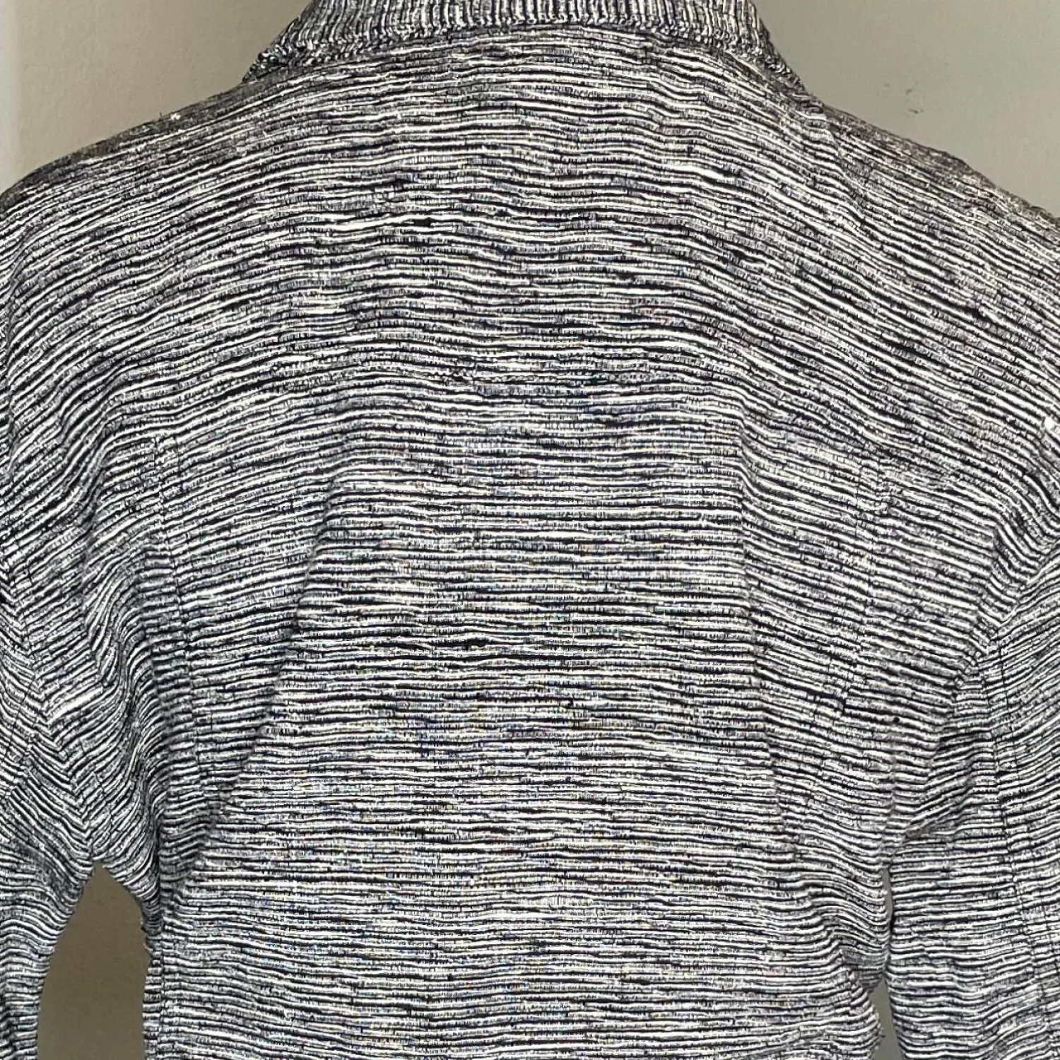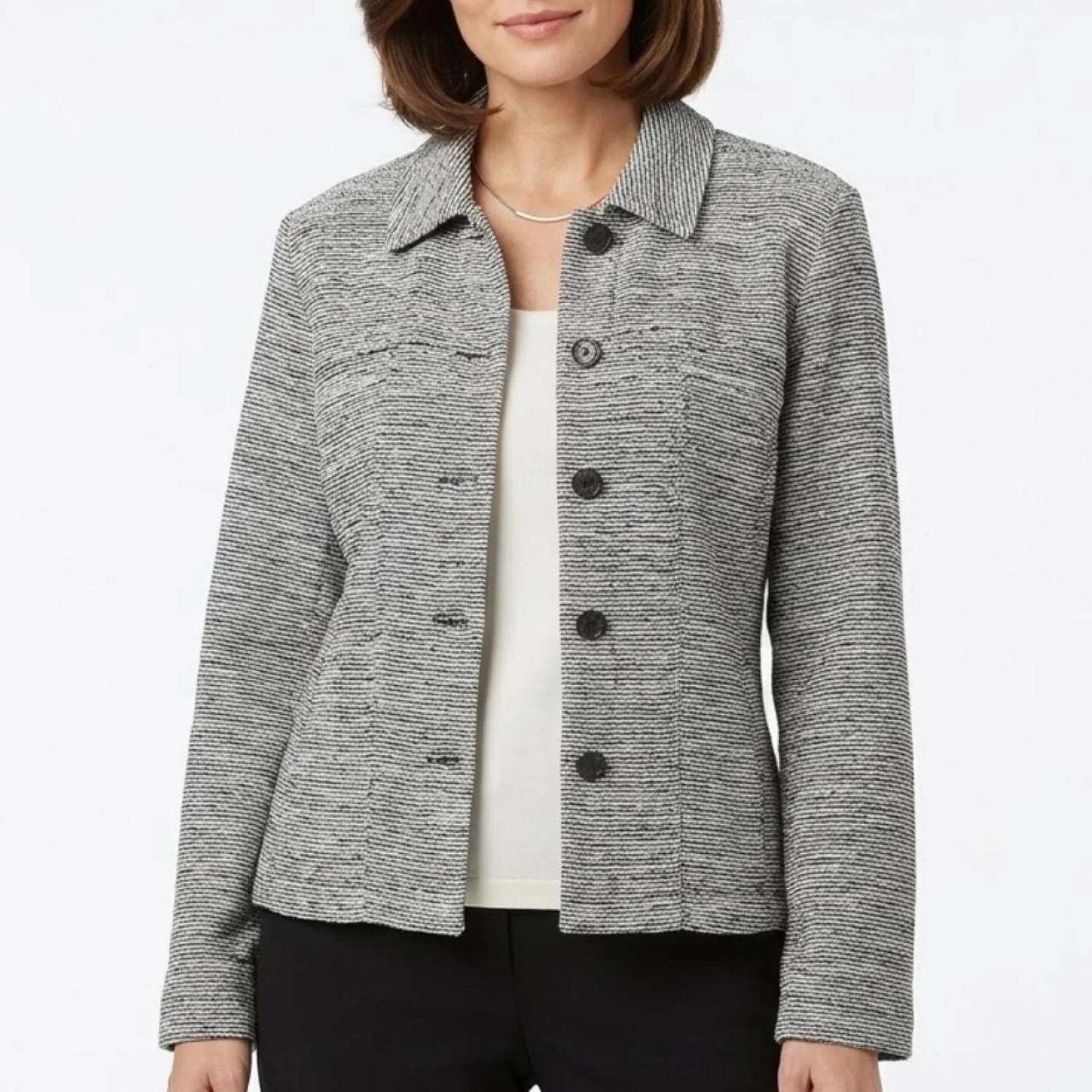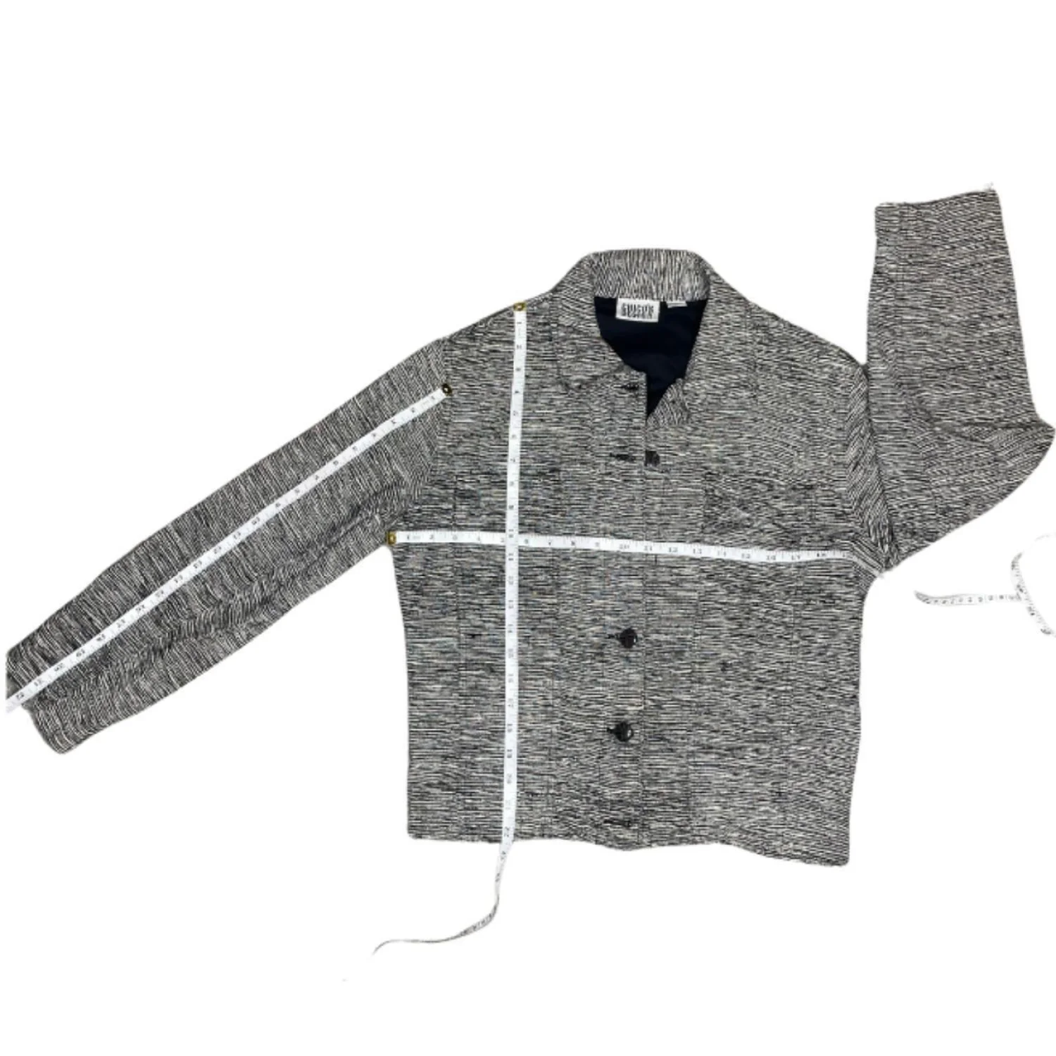 Chico's Design Vintage Silk Cotton Striped Jacket Size 1 M Black White Artsy Features: Chico's Design black and white horizontal stripe jacket. Heavyweight drape from an 80% silk and 20% cotton blend. Features a boxy, structured fit with a textured, ribbed weave. Sharp collar and clean button-down front. No linings, no fluff. Just a solid, architectural piece for a Dark Academia or Whimsigoth rotation. • Style Profile: Dark Academia, Artsy, Minimalist, Light Jacket, Silk Blend, Monochrome, Structured, Textured, 90s Vintage, Whimsigoth, Corporate Goth, Coastal Grandma, Sustainable Fashion, Mid-Century Modern, Neutral • Flaws: No Holes, stains, or tears • Size: 1 which is a Medium size 8 for the brand • Please see photos for measurements (in inches). PTP: 20.5' Length: 22' Sleeve Length: 22' • Happy to answer your questions! Super Fast Shipper!