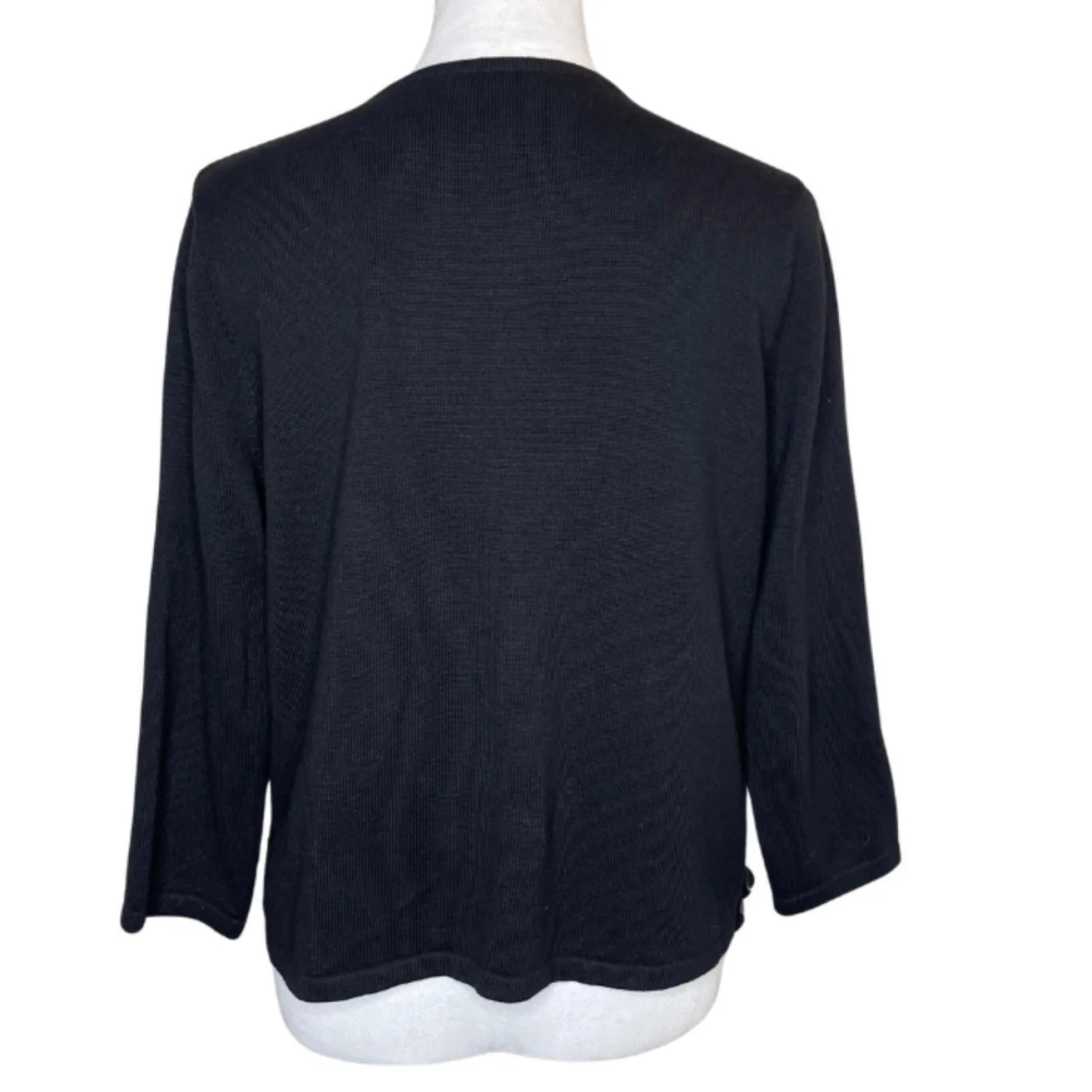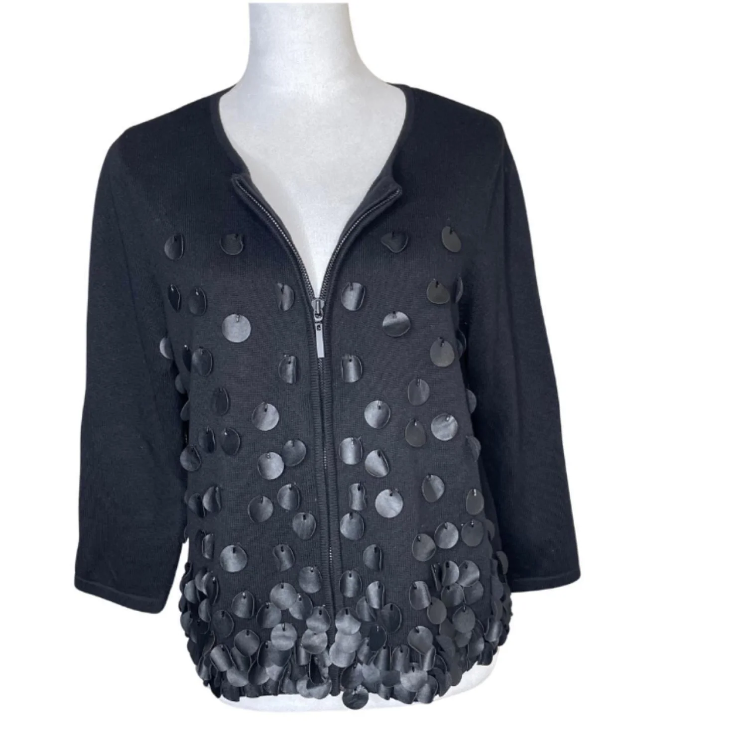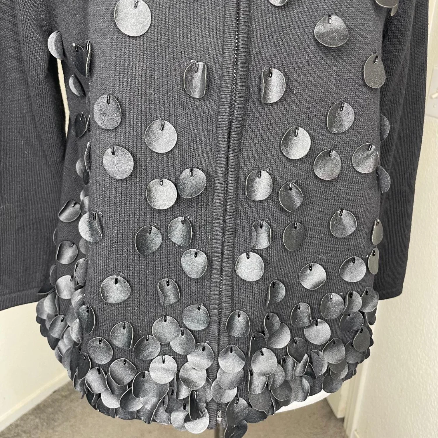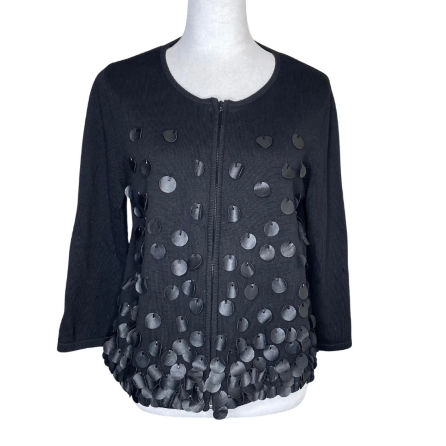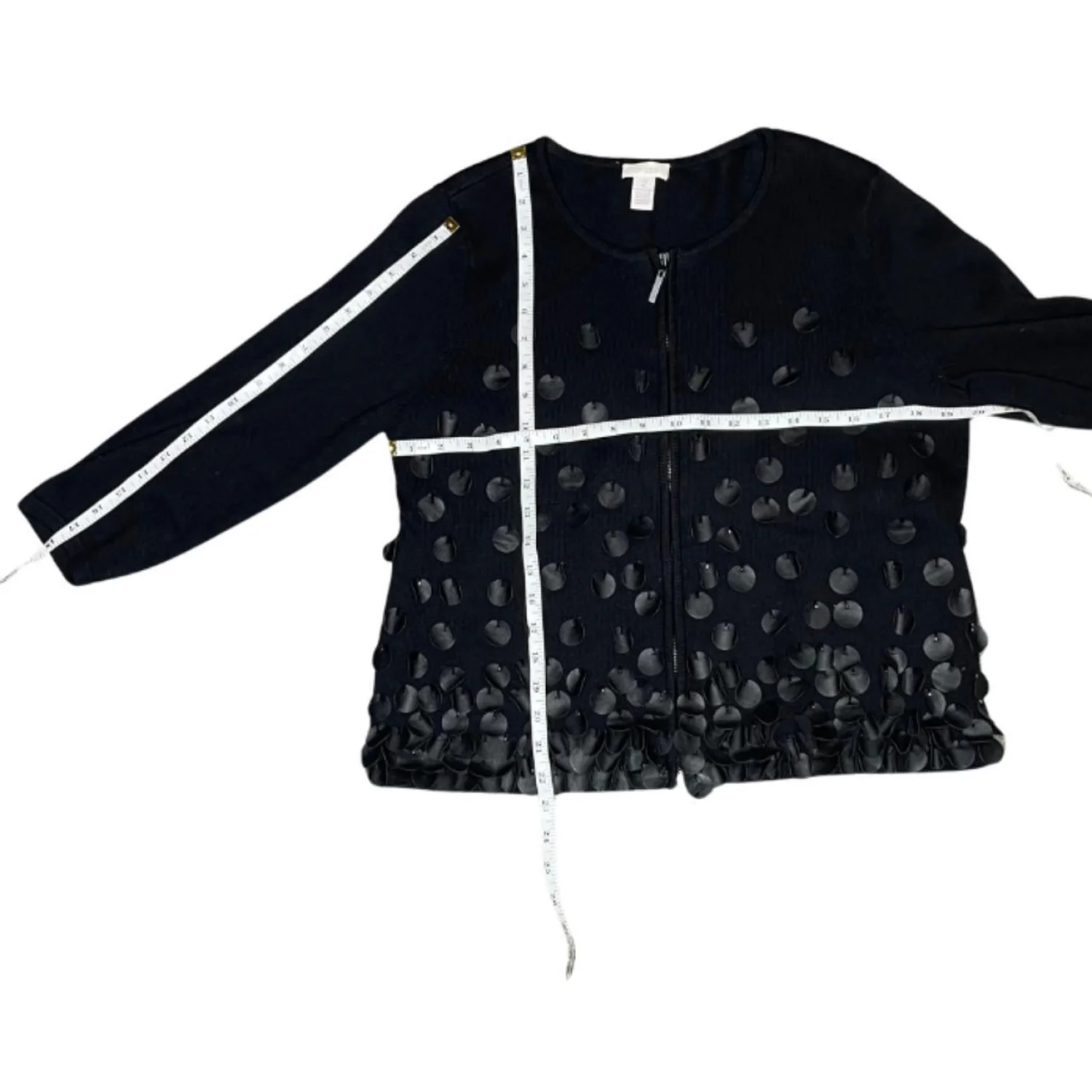 Chico’s Womens Cardigan Sweater Black Zipper Leather Accents Festive Sz Large