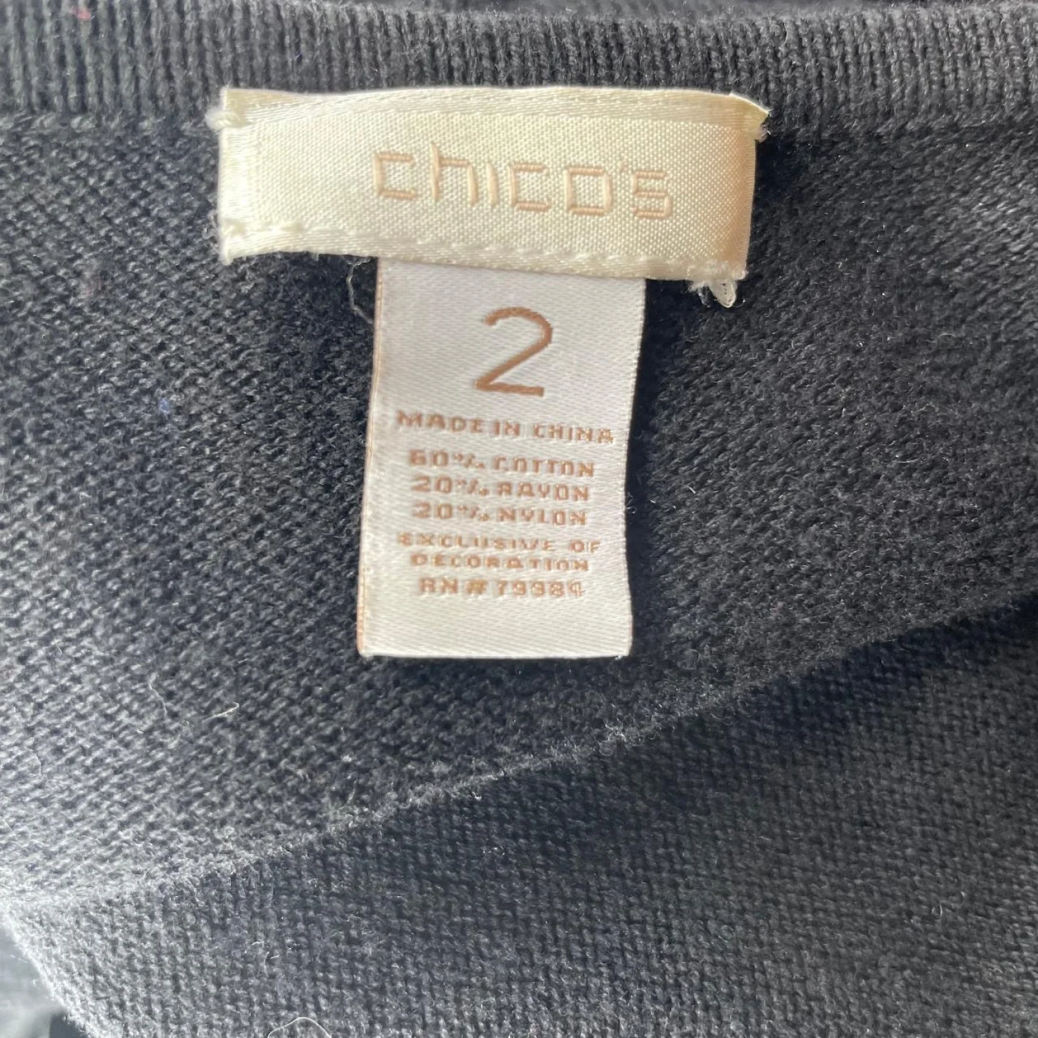 Chicos Womens Cardigan Sweater Black Zipper Leather Accents Festive Sz Large Features: • Style Profile: Business, Career, Professional Preppy, Cold Weather, Grandmacore • Flaws: No Holes, stains, or tears • Please see photos for measurements (in inches). PTP: 19.5' Length: 22.5' Sleeve Length: 18' • Happy to answer your questions! Super Fast Shipper!