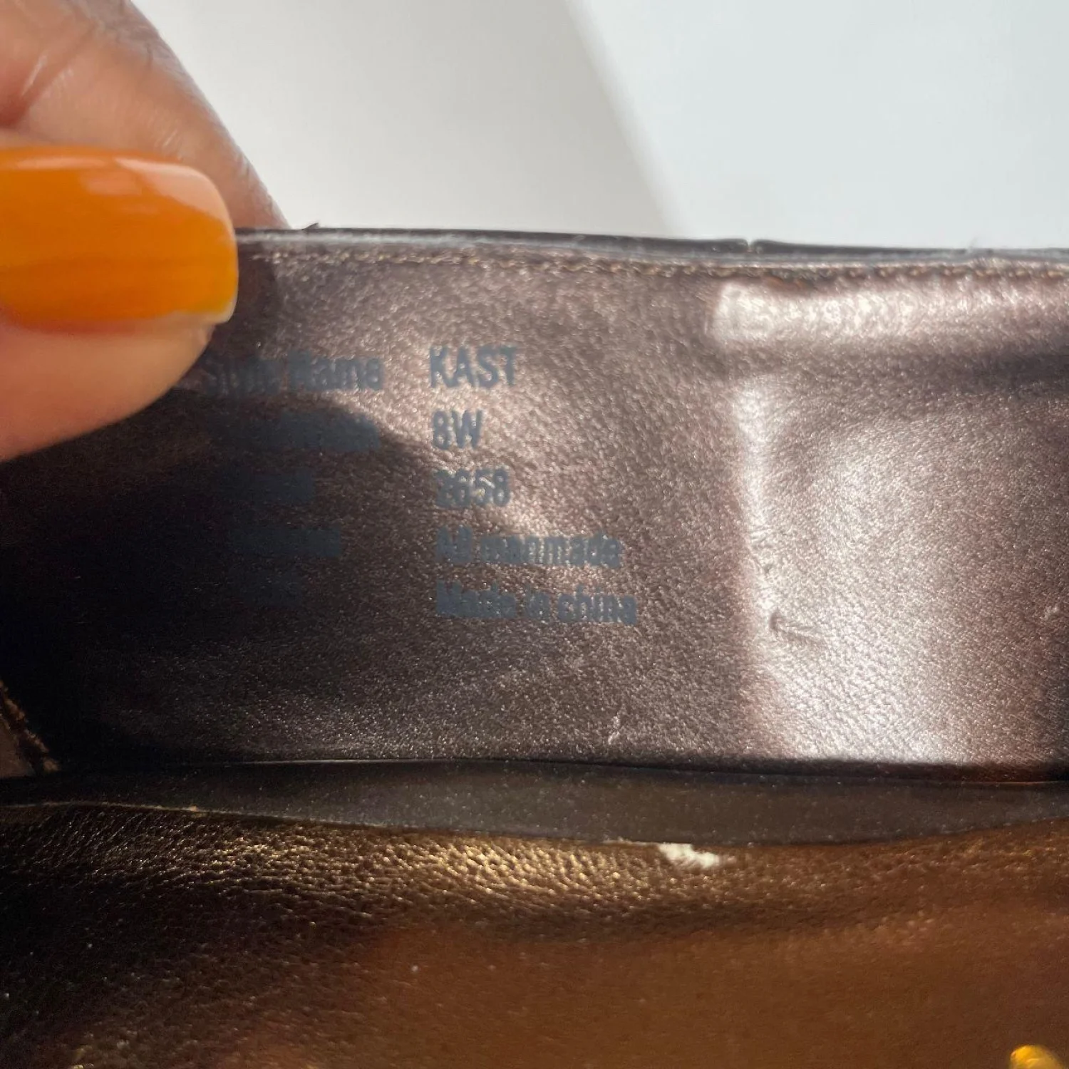 Cloudwalkers Kast Bronze Metallic Peep Toe Pumps Heels Size 8W Features: Step out in comfort and style with these Cloudwalkers by Avenue "Kast" pumps. Featuring a stunning bronze metallic finish and a classic peep-toe silhouette, these heels are accented with a bold geometric buckle detail at the toe. Designed with a wide-width fit and a cushioned insole, they offer the perfect blend of glamour and all-day wearability. • Style Profile: Metallic, Bronze, Peep Toe, Wide Width, Comfort, Dressy, Evening, Office, Career, Glam, Geometric, Classic, Neutral, Shimmer, Event Wear • Flaws: These heels are in good pre-owned condition with some minor cosmetic signs of wear. There is a visible scuff/nick on the back of the right heel counter and a small rub mark near the base of the left heel. These flaws are primarily surface-level and do not affect the structural integrity of the shoes. • All measurements are approximate Heel Height: 3" Happy to answer your questions! Super Fast Shipper!