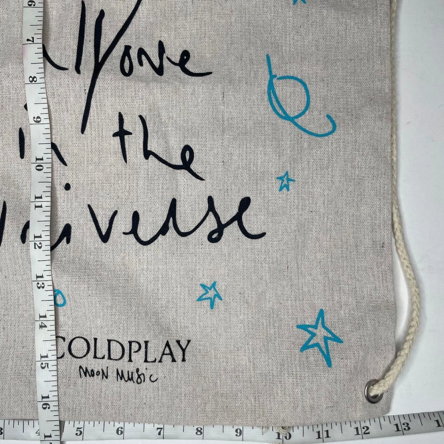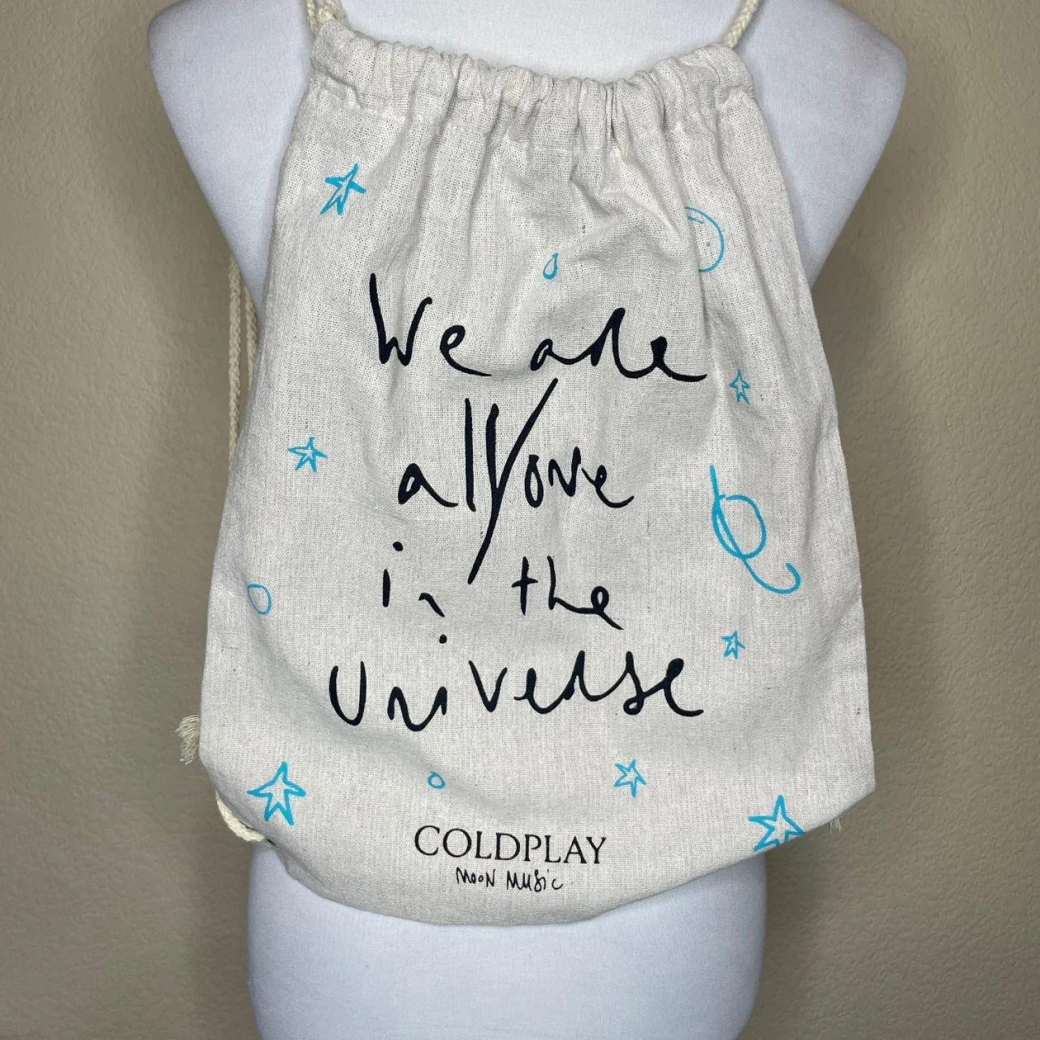 COLDPLAY Moon Music Drawstring Bag / Music Of The Spheres Tour VIP Tour Merch Features: This is authentic Coldplay Moon Music tour merchandise. The silhouette is a classic, flexible drawstring backpack cut from a heavyweight, textured cream canvas. It features a raw, hand-drawn graphic style with "We are all love in the universe" script in black, accented by cyan blue celestial doodles. The build is sturdy with thick, off-white rope straps and reinforced metal grommets at the base. • Style Profile: Gorpcore, Indie Sleaze, Celestial, Eco-Conscious, Streetwear, Tour Merch, Minimalist, Concert Core, Boho, Granola Girl • Flaws: No Holes, stains, or tears (Excellent pre-owned condition) • All measurements are approximate Length: 16.5" Width: 12.5" Happy to answer your questions! Super Fast Shipper!