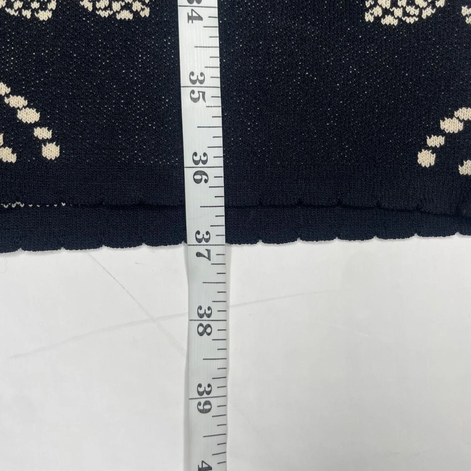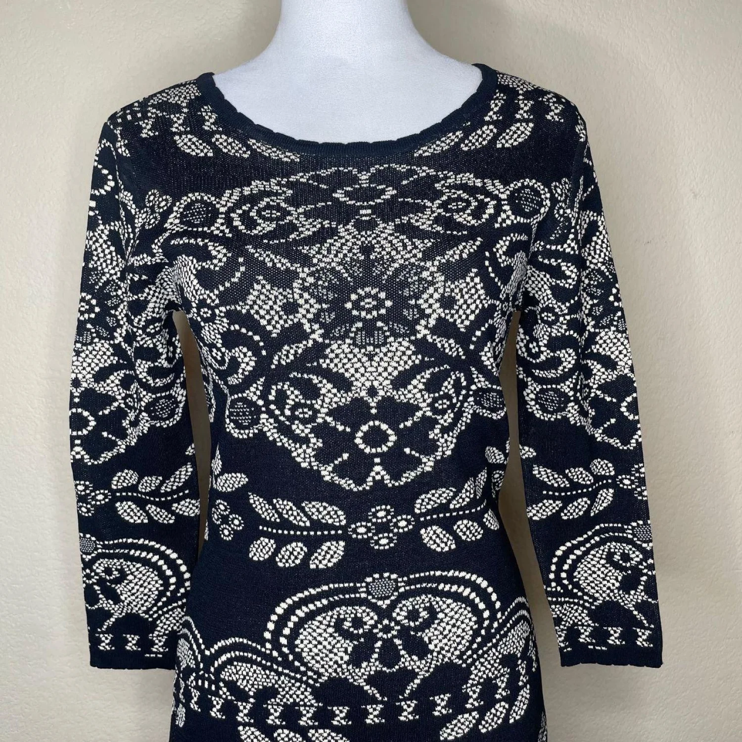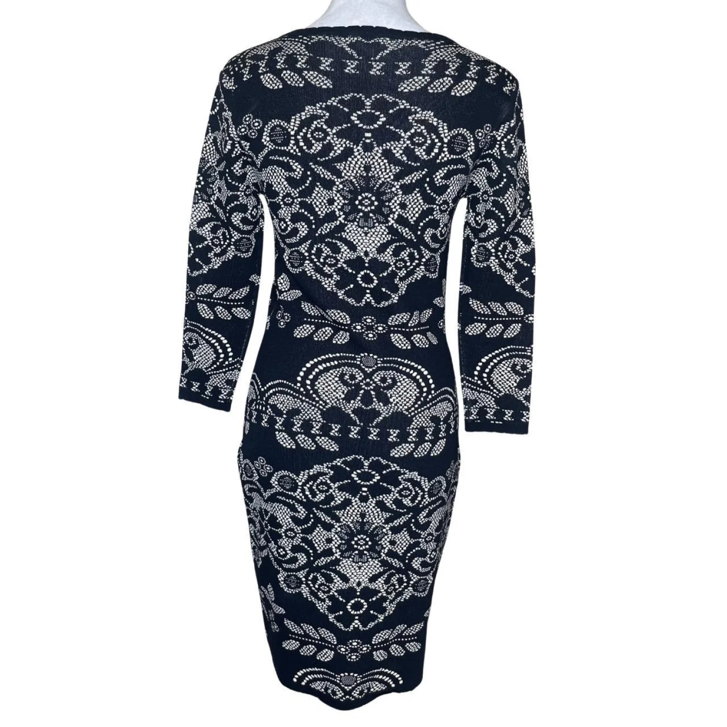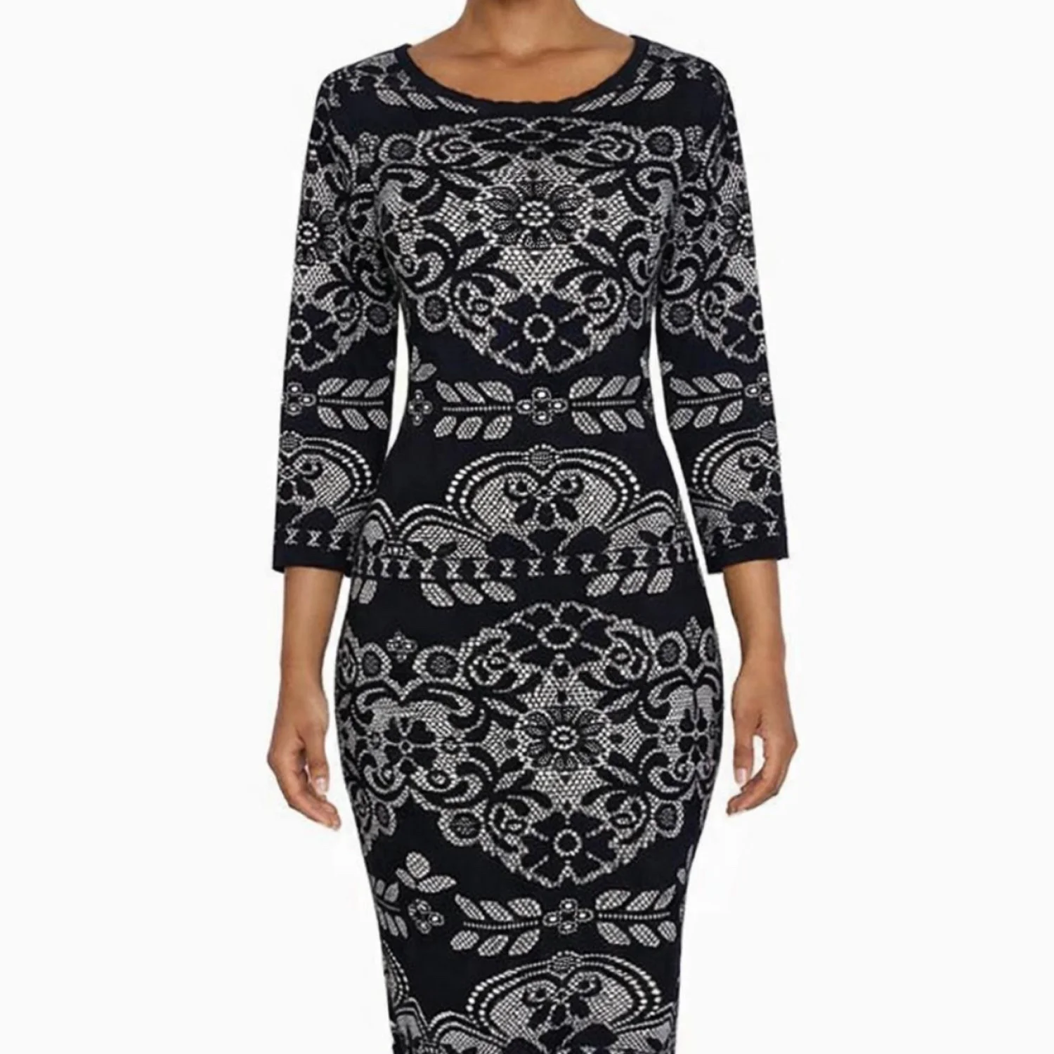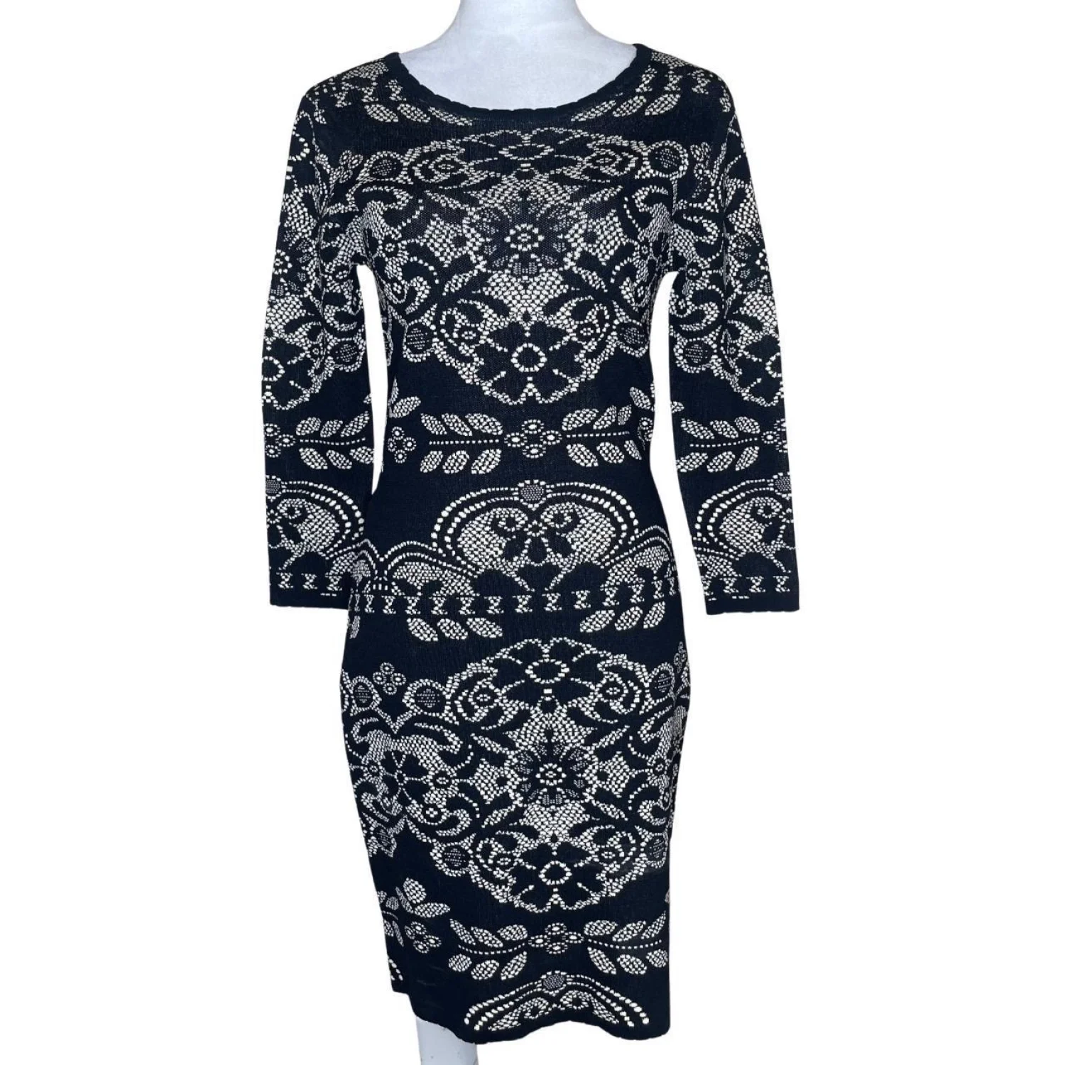 Cremieux Black Cream Damask Floral Knit Sheath Dress Long Sleeve Stretch Size S
