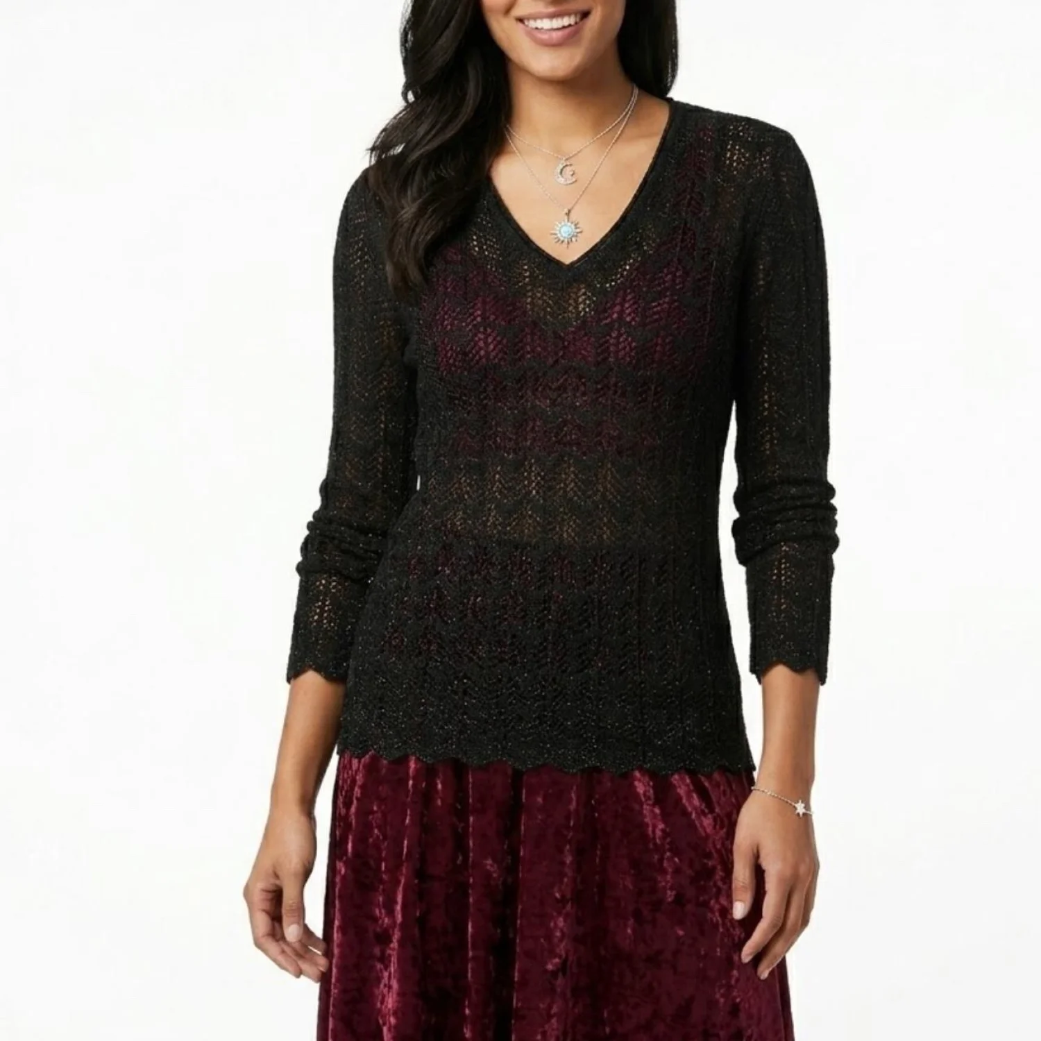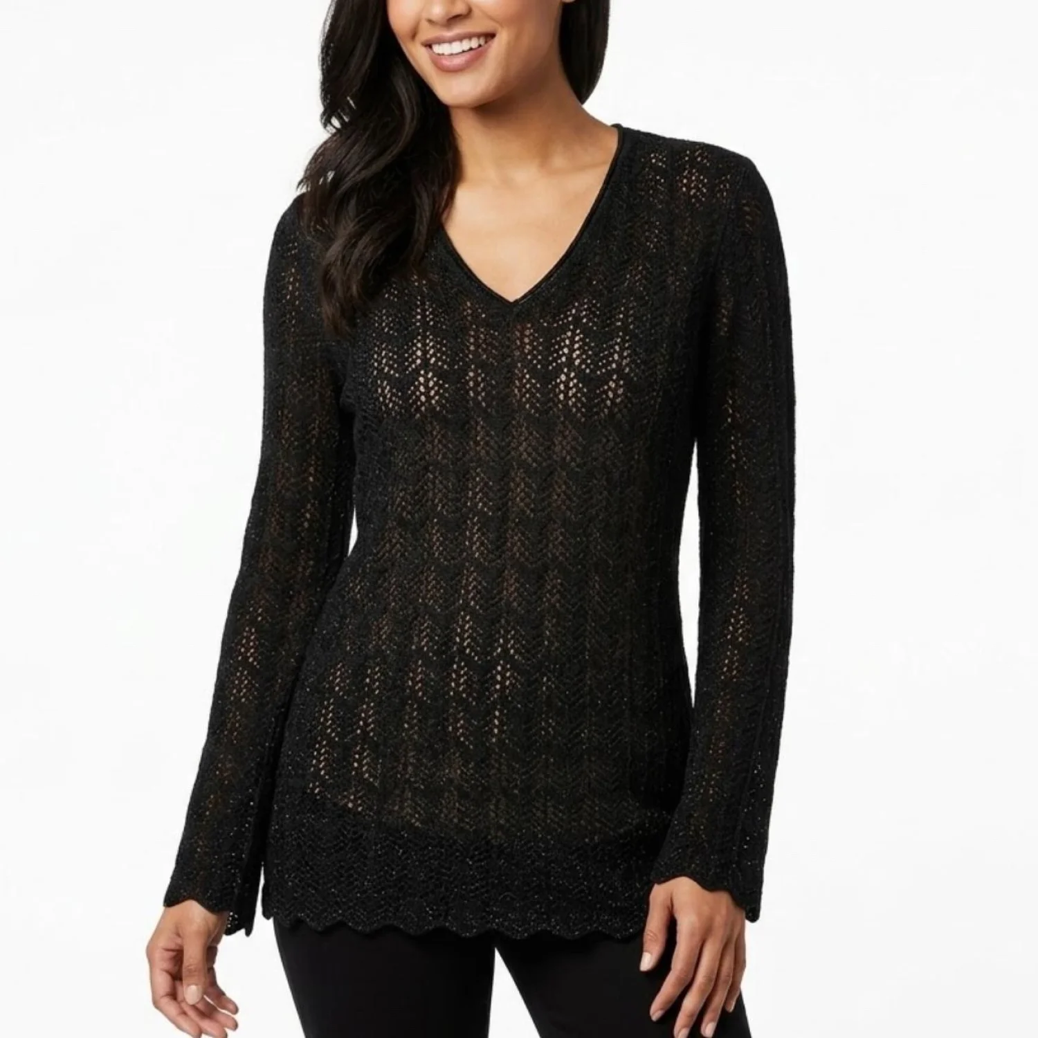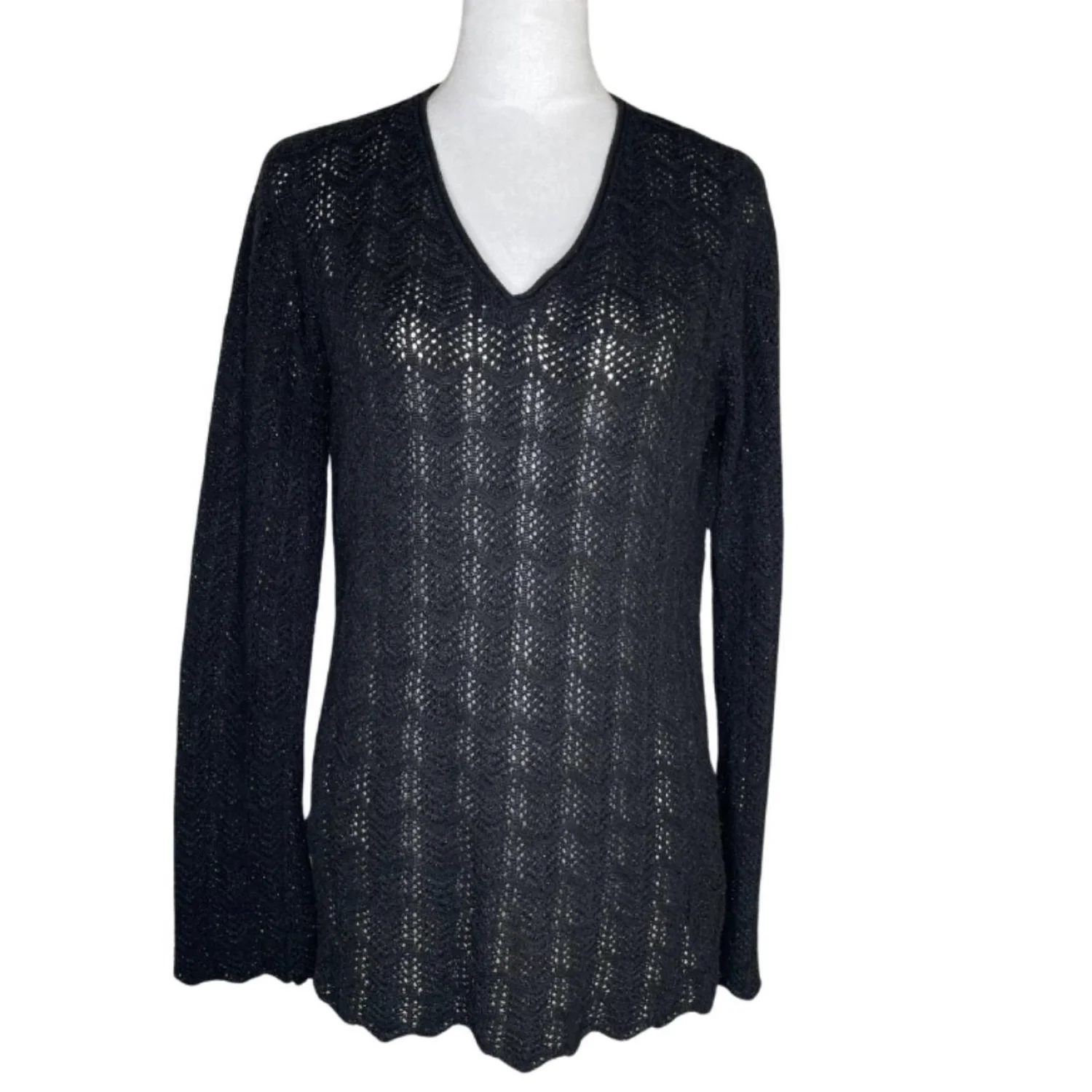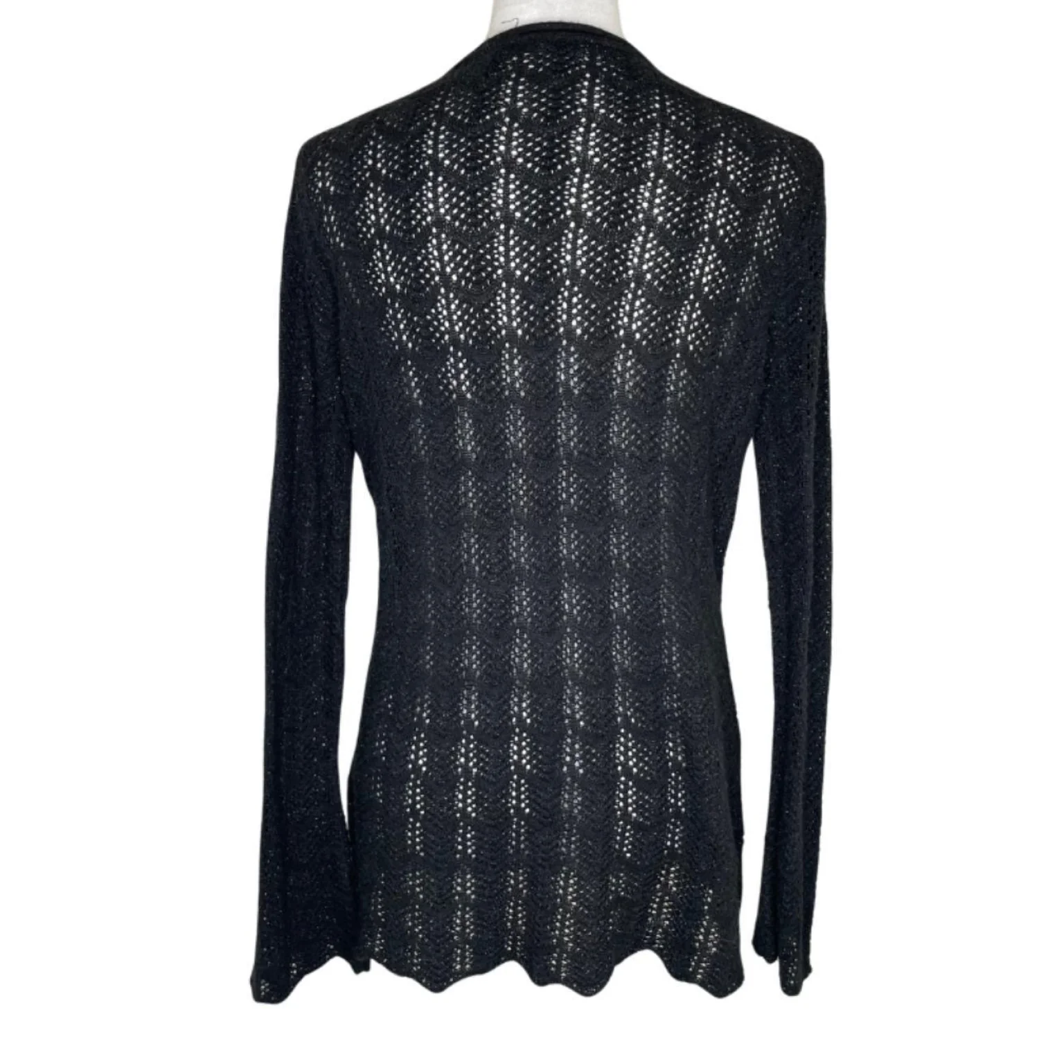Daisy Fuentes Whimsigoth Pointelle Knit Bell Sleeve V-Neck Scalloped Top XL Features: Forget the "basic black sweater" labels. This is pure Whimsigoth energy. The pointelle open-weave creates a delicate, cobweb-like texture throughout the body. It features a dramatic bell sleeve that hits the 90s gothic romance aesthetic perfectly. The scalloped hemline adds a soft, witchy finish to the silhouette. It’s sheer enough to require a base layer but heavy enough to hold that structured, flared drape at the wrists. • Style Profile: Whimsigoth, 90s Goth, Romantic Grunge, Pointelle Knit, Bell Sleeves, Witchy, Coquette Grunge, Steampunk, Fairycore, Victorian Gothic, Dark Hippie, Boho Gothic • Flaws: No Holes, stains, or tears • Please see photos for measurements (in inches). PTP: 17' Length: 28.5' Sleeve Length: 26' • Happy to answer your questions! Super Fast Shipper!