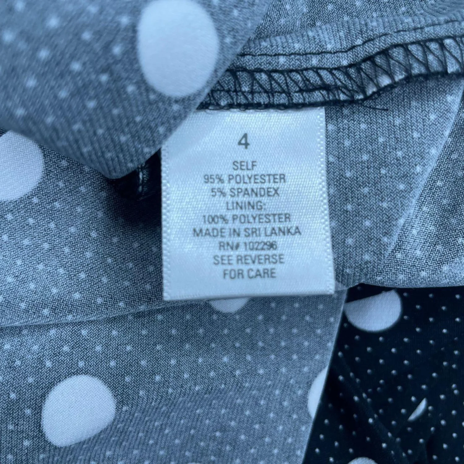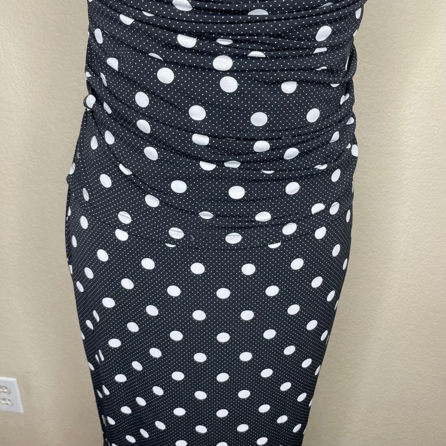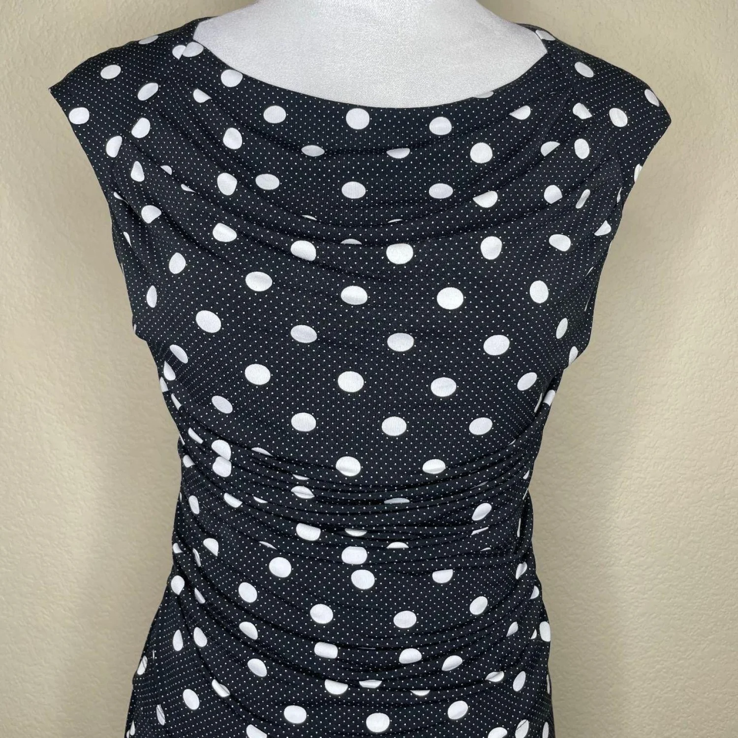Dressbarn Polka Dot Sheath Dress Size 4 Black White Ruched Cowl Neck Cap Sleeve
