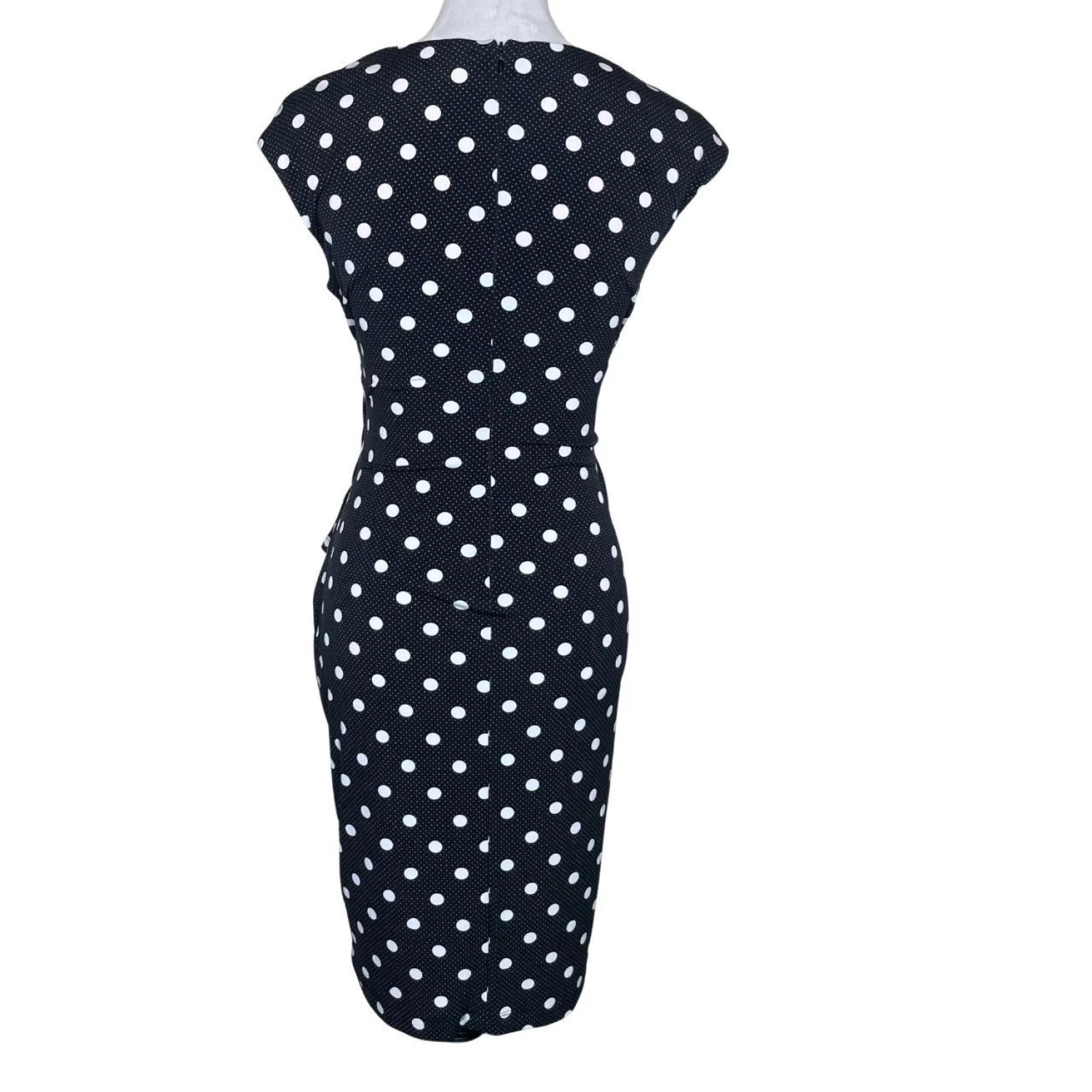 Dressbarn Polka Dot Sheath Dress Size 4 Black White Ruched Cowl Neck Cap Sleeve Features: A graceful cowl neckline and delicate cap sleeves, this piece is designed with side ruching to create a flattering, cinched silhouette. The stretch-blend fabric and full lining ensure a comfortable, smooth fit. Perfect for the office, a wedding guest look, or your next dinner date. • Style Profile: Office core, Classic, Rockabilly, Pinup, Retro, Career, Modest, Minimalist, Preppy, Polka Dot, Wedding Guest, Cocktail • Flaws: No Holes, stains, or tears • Please see the photos for measurements (in inches). PTP: 16' Length: 37' Happy to answer your questions! Super Fast Shipper!