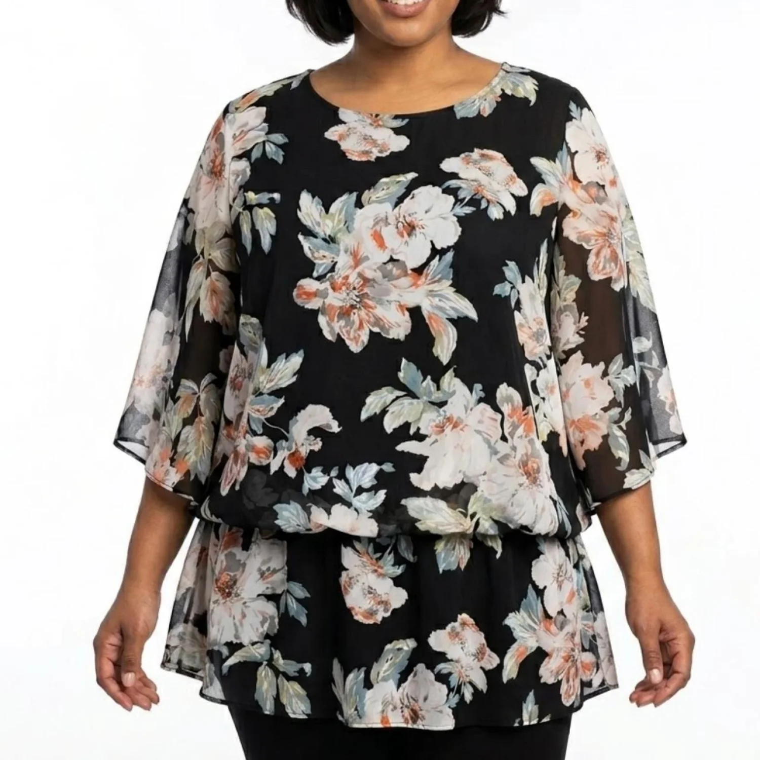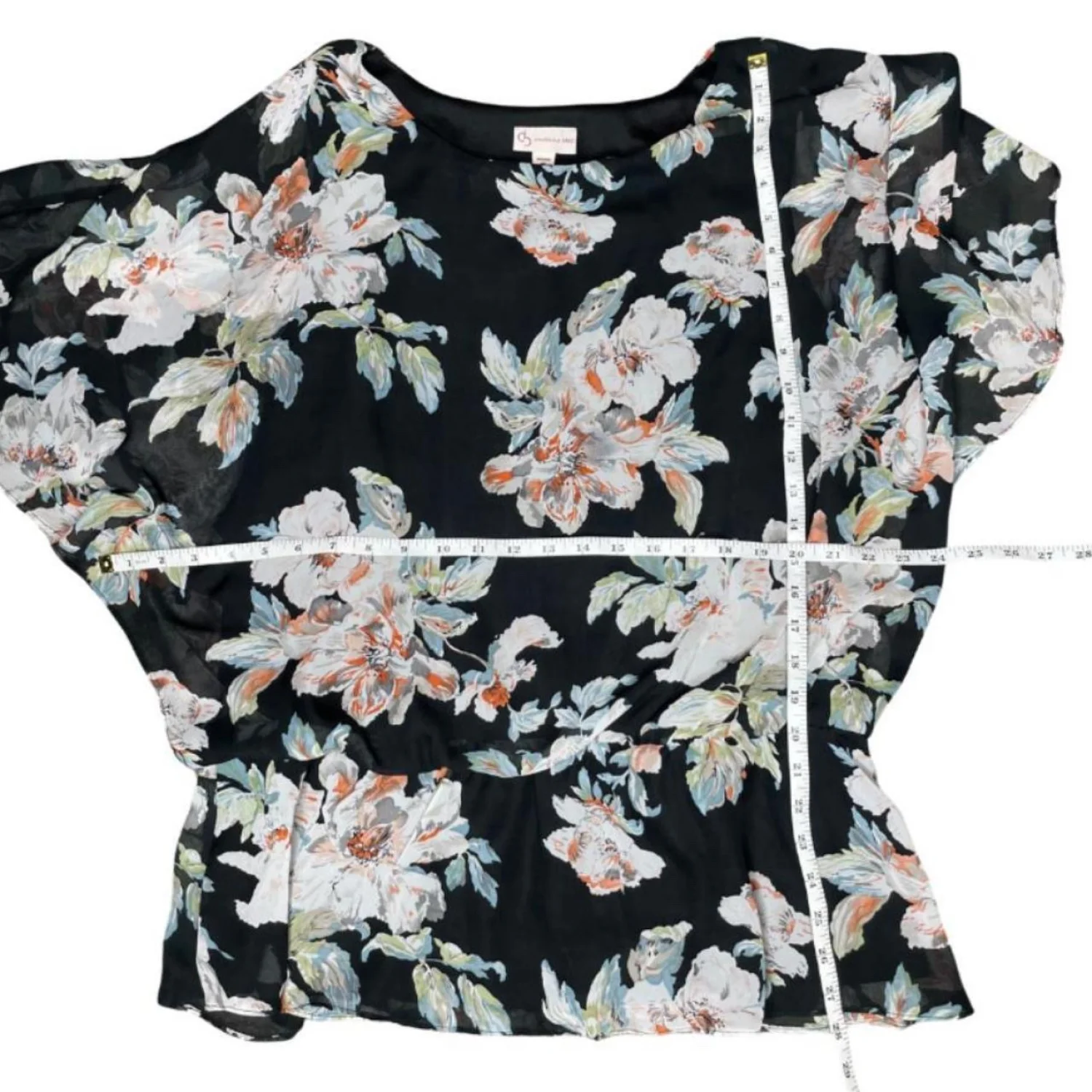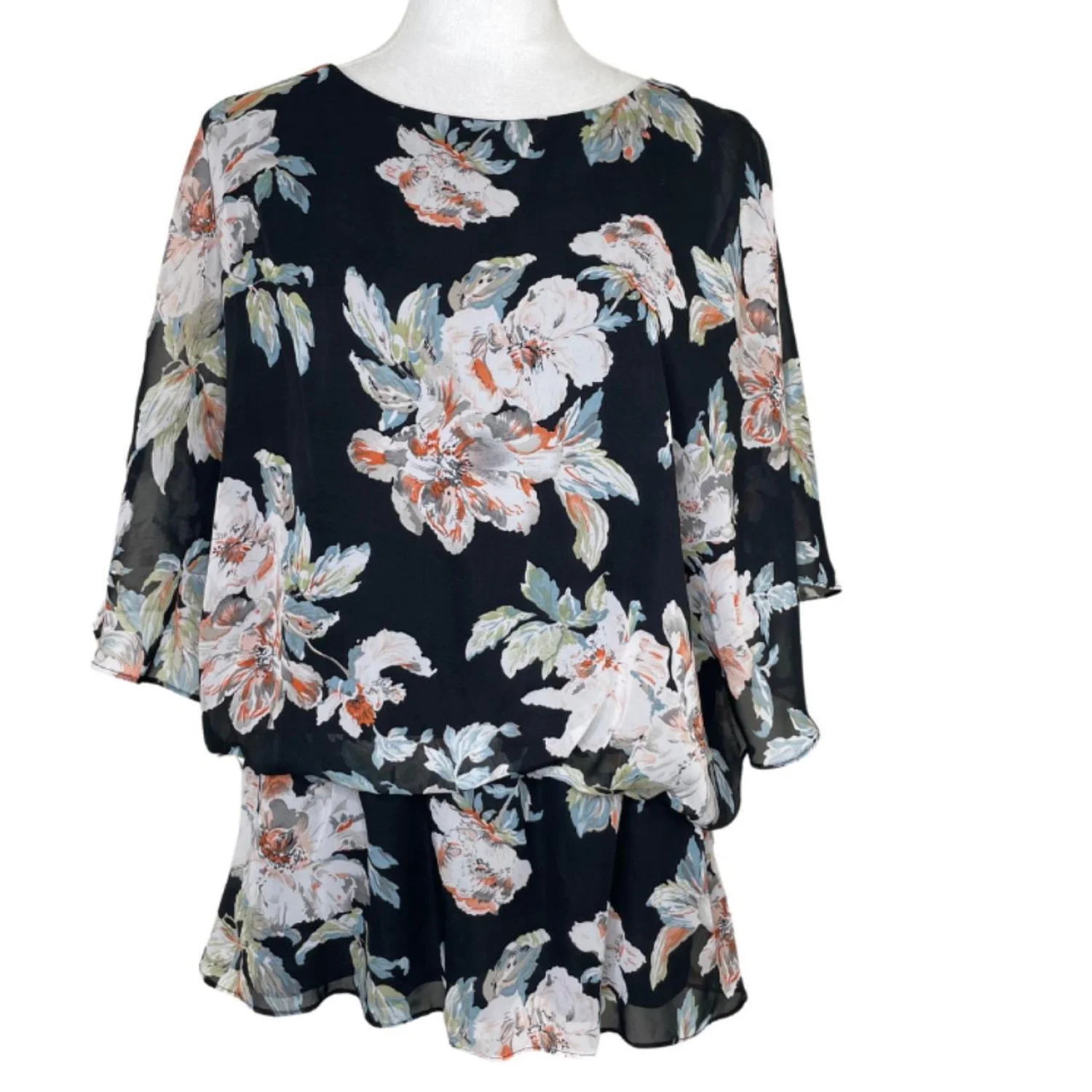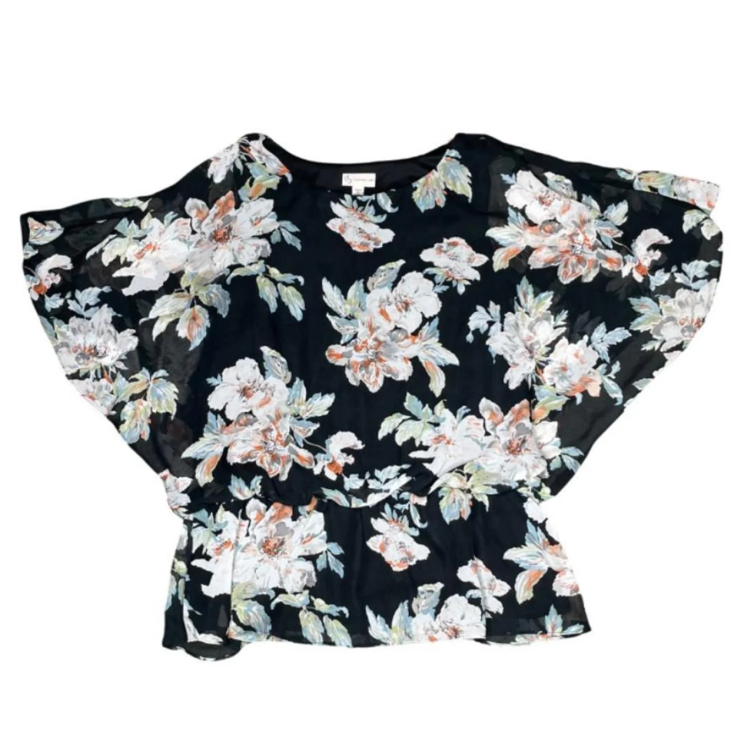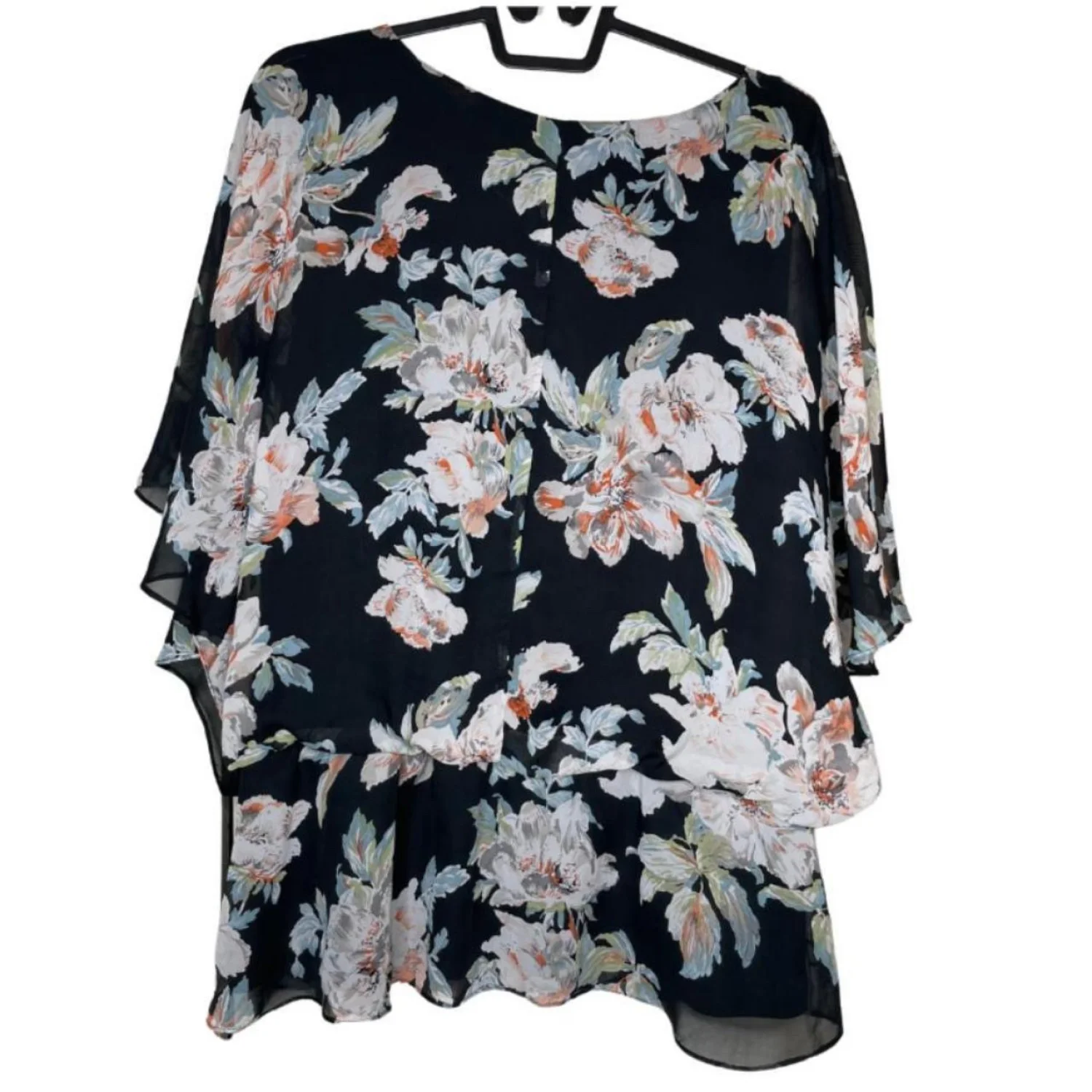 DRESSBARN Whimsigoth Floral Butterfly Sleeve Blouse Plus Size 18 Features: This Whimsigoth piece captures the moody, ethereal energy of the 90s with its dark floral print and dramatic butterfly sleeves. The double-layer construction features a sheer chiffon-style overlay that creates a fluid, floating drape over a solid black bodice. It’s finished with an elasticized bubble hem, giving the silhouette a soft, rounded volume that balances the wide, airy sleeves. The print is heavy on painterly blooms in dusty teal, muted orange, and chalky white against a deep charcoal base. • Style Profile: whimsigoth, fairycore, dark cottagecore, 90s witchy, bohemian gothic, plus size vintage, butterfly sleeves, floral grunge, ethereal, coquette, romantic goth, flowy, chiffon overlay, bubble hem • Flaws: No Holes, stains, or tears • Please see photos for measurements (in inches). PTP: 24' Length: 28' • Happy to answer your questions! Super Fast Shipper!