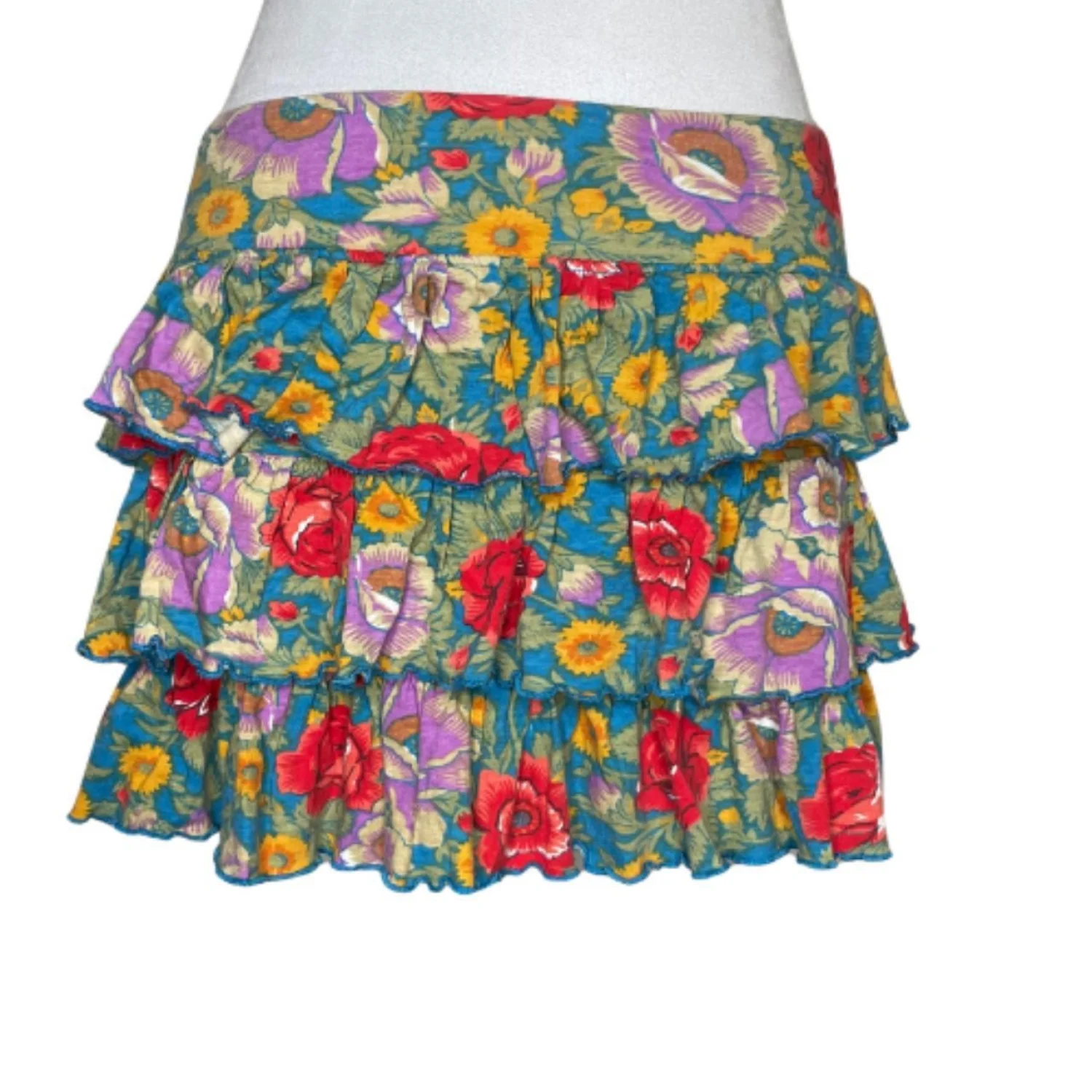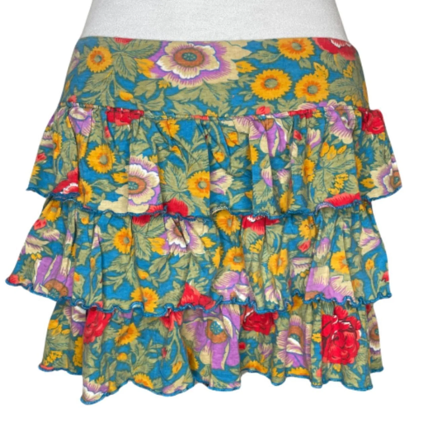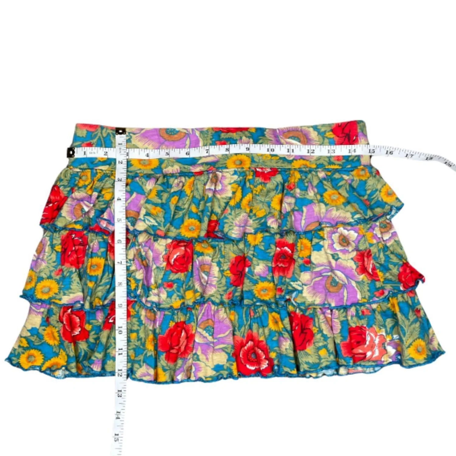 E-vie Whimsigoth Floral Tiered Ruffle Mini Skirt Y2K Boho Fairy Medium Features: Thick cotton weave featuring a saturated botanical print of marigolds and poppies. This triple-tiered silhouette creates a flared, structured volume with lettuce-edge hems for that raw 2000s finish. It sits low on the hips for a true archive Y2K fit that doesn’t just hang—it has movement and weight. • Style Profile: whimsigoth, fairycore, y2k, cottagecore, boho grunge, tiered ruffle, ditsy floral, coquette, archive, 2000s, festival, gorpcore, botanical, maximalist, earth tones • Flaws: No Holes, stains, or tears • Please see photos for measurements (in inches). Waist: 15' Length: 12'' • Happy to answer your questions! Super Fast Shipper!