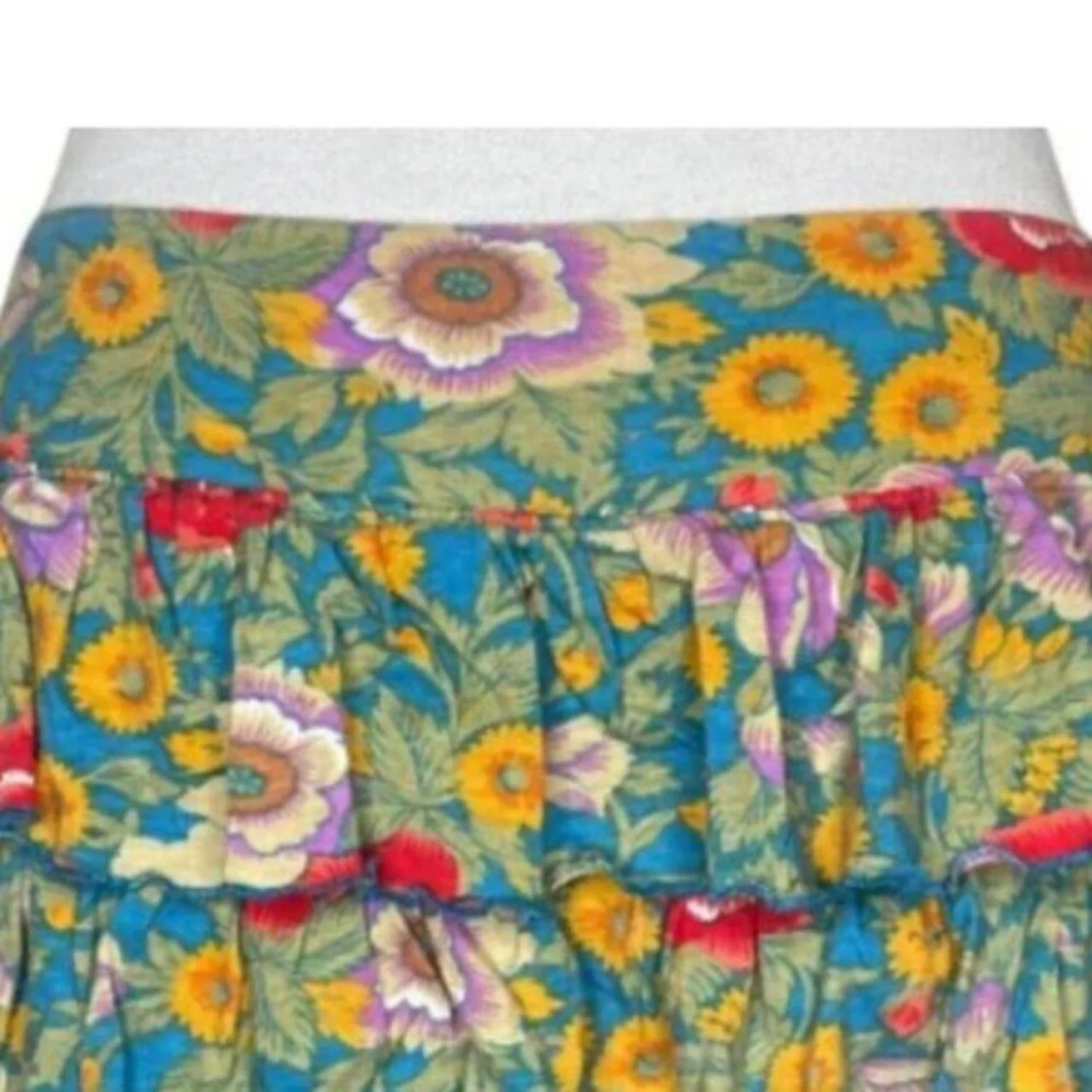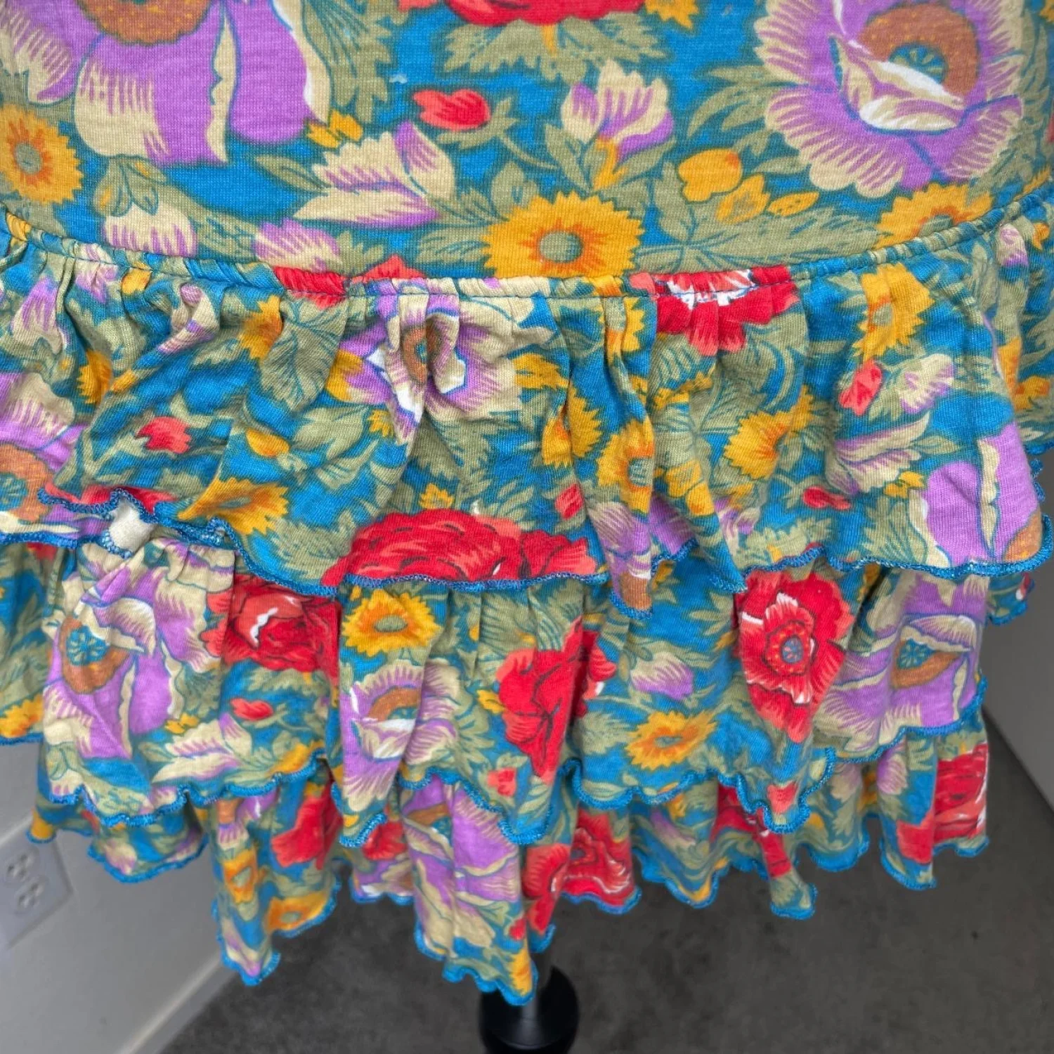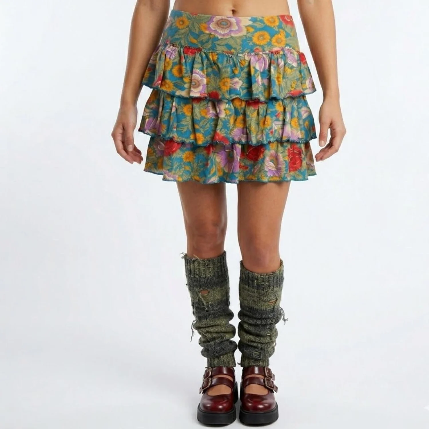 E-vie Whimsigoth Floral Tiered Ruffle Mini Skirt Y2K Boho Fairy Medium Features: Thick cotton weave featuring a saturated botanical print of marigolds and poppies. This triple-tiered silhouette creates a flared, structured volume with lettuce-edge hems for that raw 2000s finish. It sits low on the hips for a true archive Y2K fit that doesn’t just hang—it has movement and weight. • Style Profile: whimsigoth, fairycore, y2k, cottagecore, boho grunge, tiered ruffle, ditsy floral, coquette, archive, 2000s, festival, gorpcore, botanical, maximalist, earth tones • Flaws: No Holes, stains, or tears • Please see photos for measurements (in inches). Waist: 15' Length: 12'' • Happy to answer your questions! Super Fast Shipper!