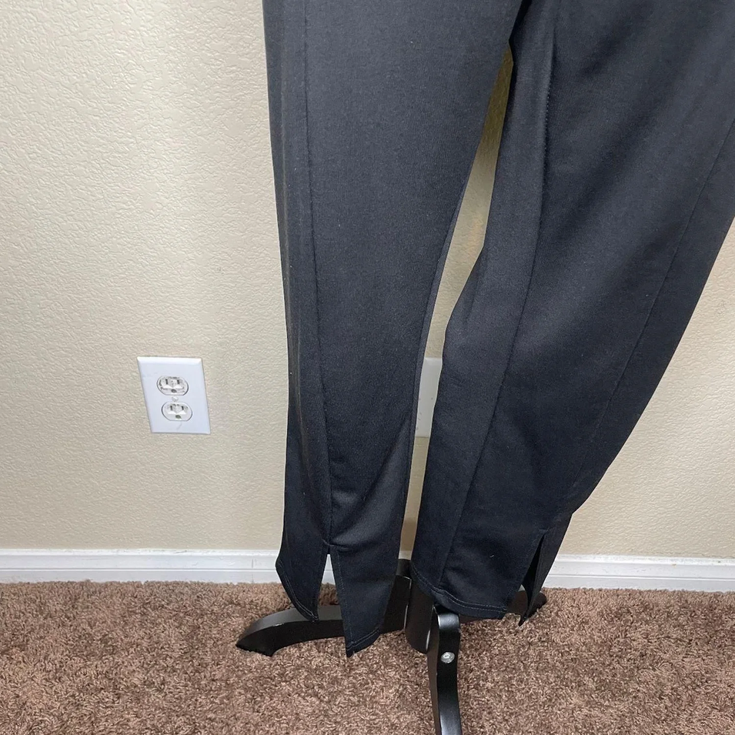 Emery Rose Black High Waisted Split Hem Pants Size Large Business Casual Goth Features: A comfortable elastic high-waist and a trendy front split hem detail at the ankle, these pants offer a sleek, elongated silhouette. The fabric has a nice stretch, making them perfect for work-to-weekend wear. • Style Profile: Minimalist, Business Casual, Dark Academia, Streetwear, Modern, Clean Girl, Office Chic, Contemporary, Versatile, Goth Lite • Flaws: No Holes, stains, or tears (Excellent pre-owned condition) • All measurements are approximate Waist: 15' Length: 36' Happy to answer your questions! Super Fast Shipper!