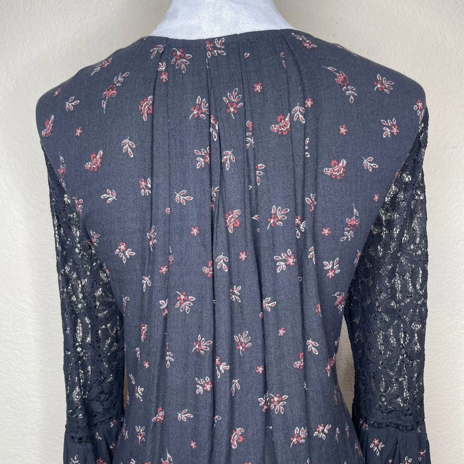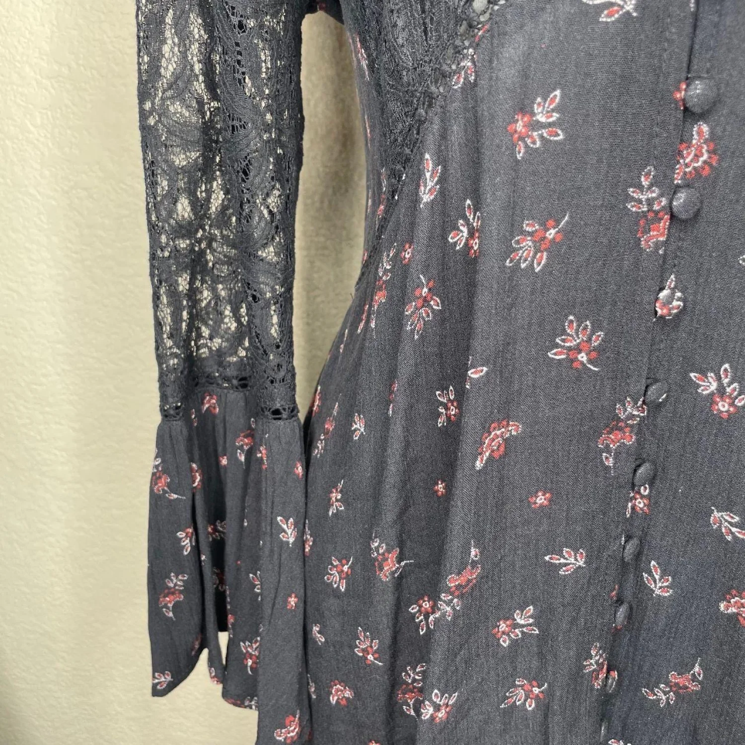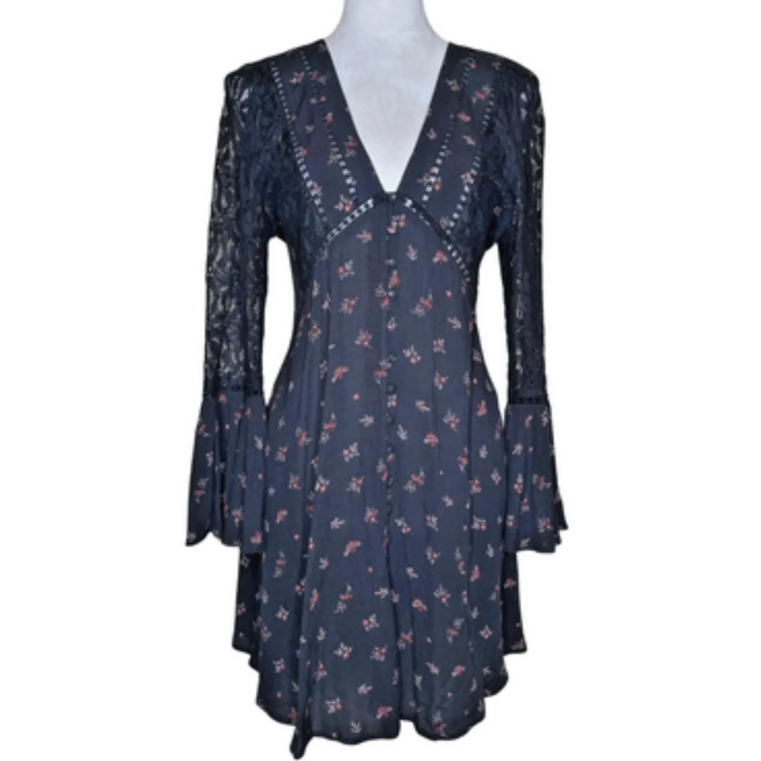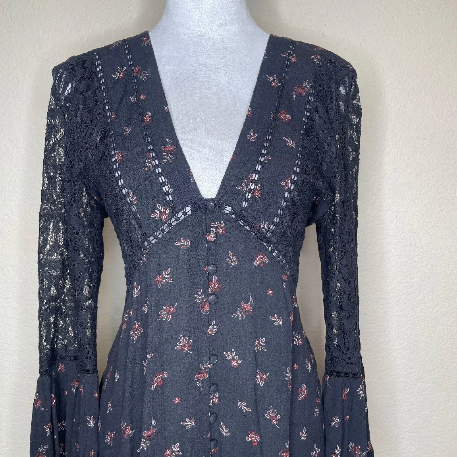 En Creme Women's Black Floral Lace V-Neck Flair Sleeve Midi Dress Sz M Features: • Style Profile: Dark Cottagecore, Dark Fairy, Feminine, Grunge, Whimsigoth • Flaws: No Holes, stains, or tears • Please see the photos for measurements (in inches). PTP: 20' Length: 34' Happy to answer your questions! Super Fast Shipper!