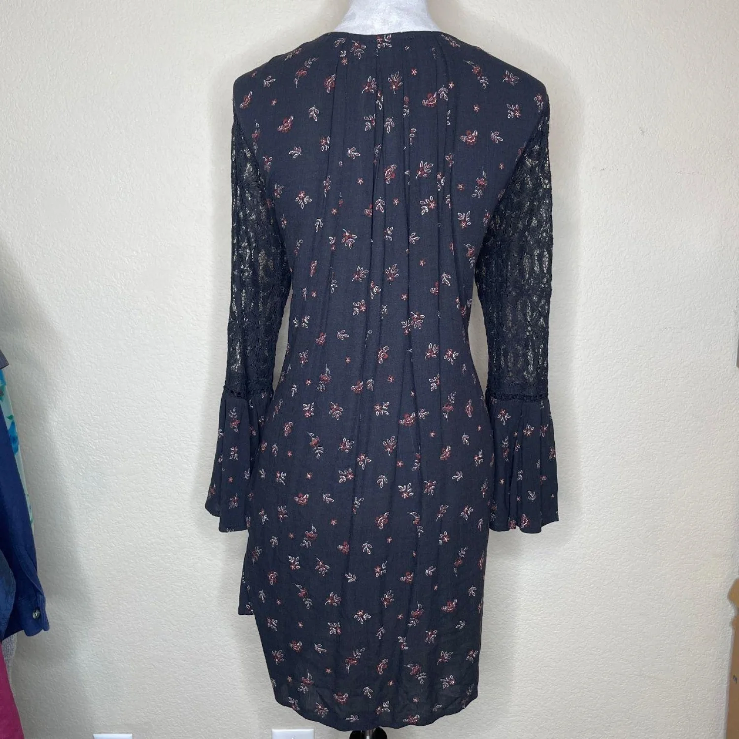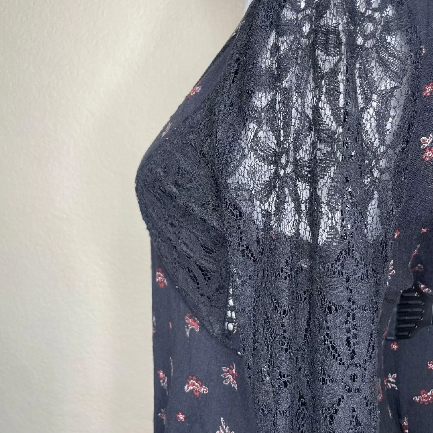 En Creme Women's Black Floral Lace V-Neck Flair Sleeve Midi Dress Sz M