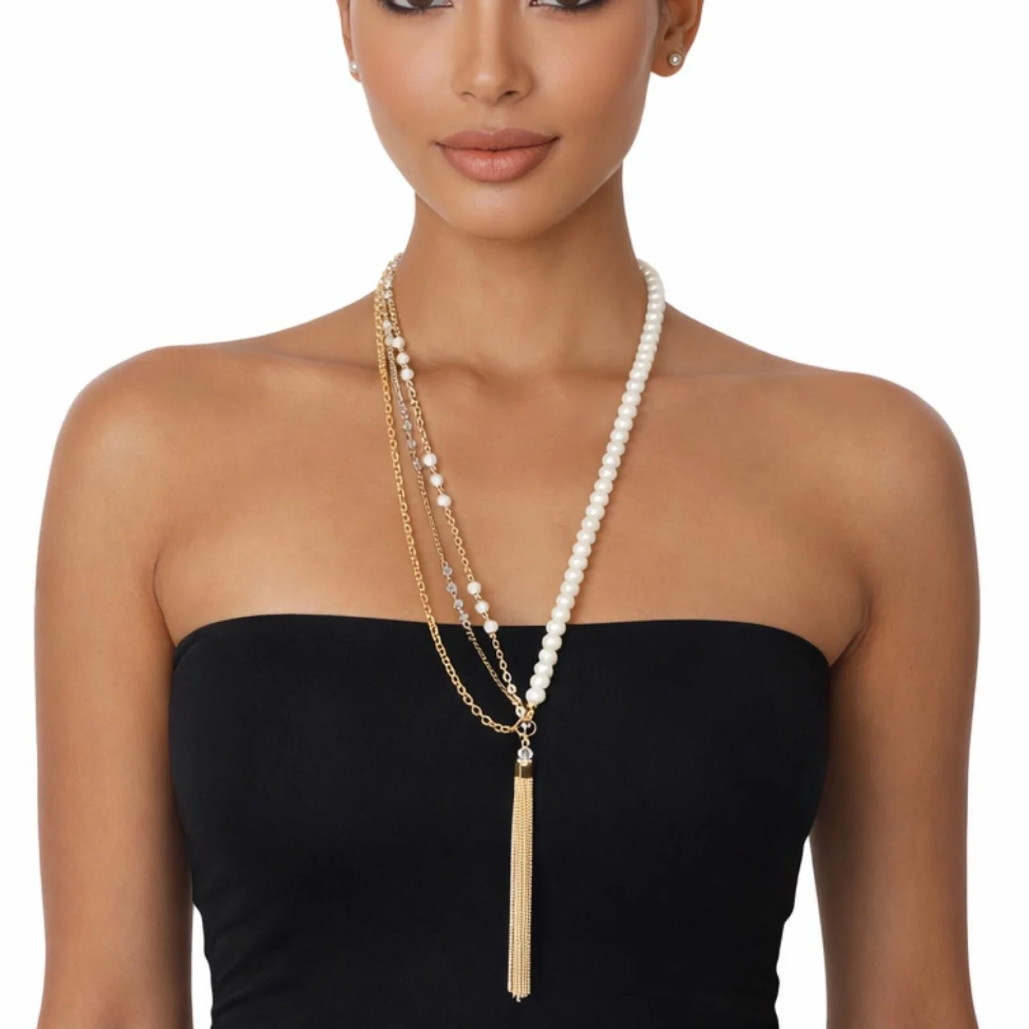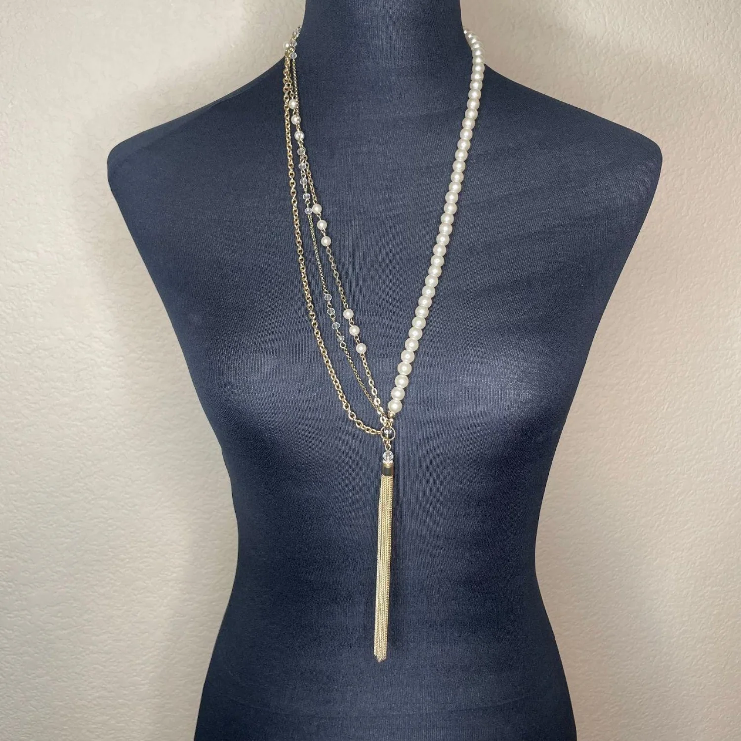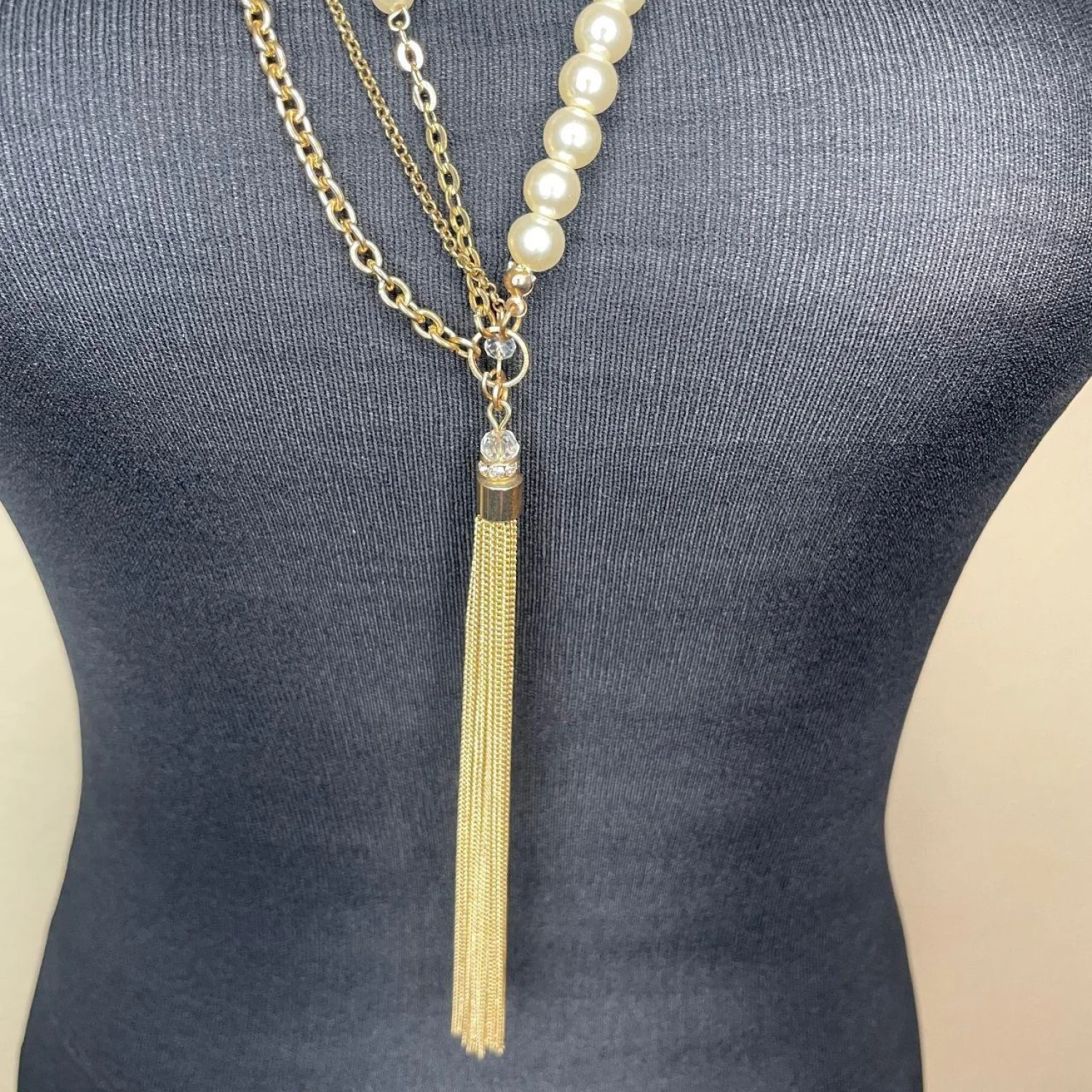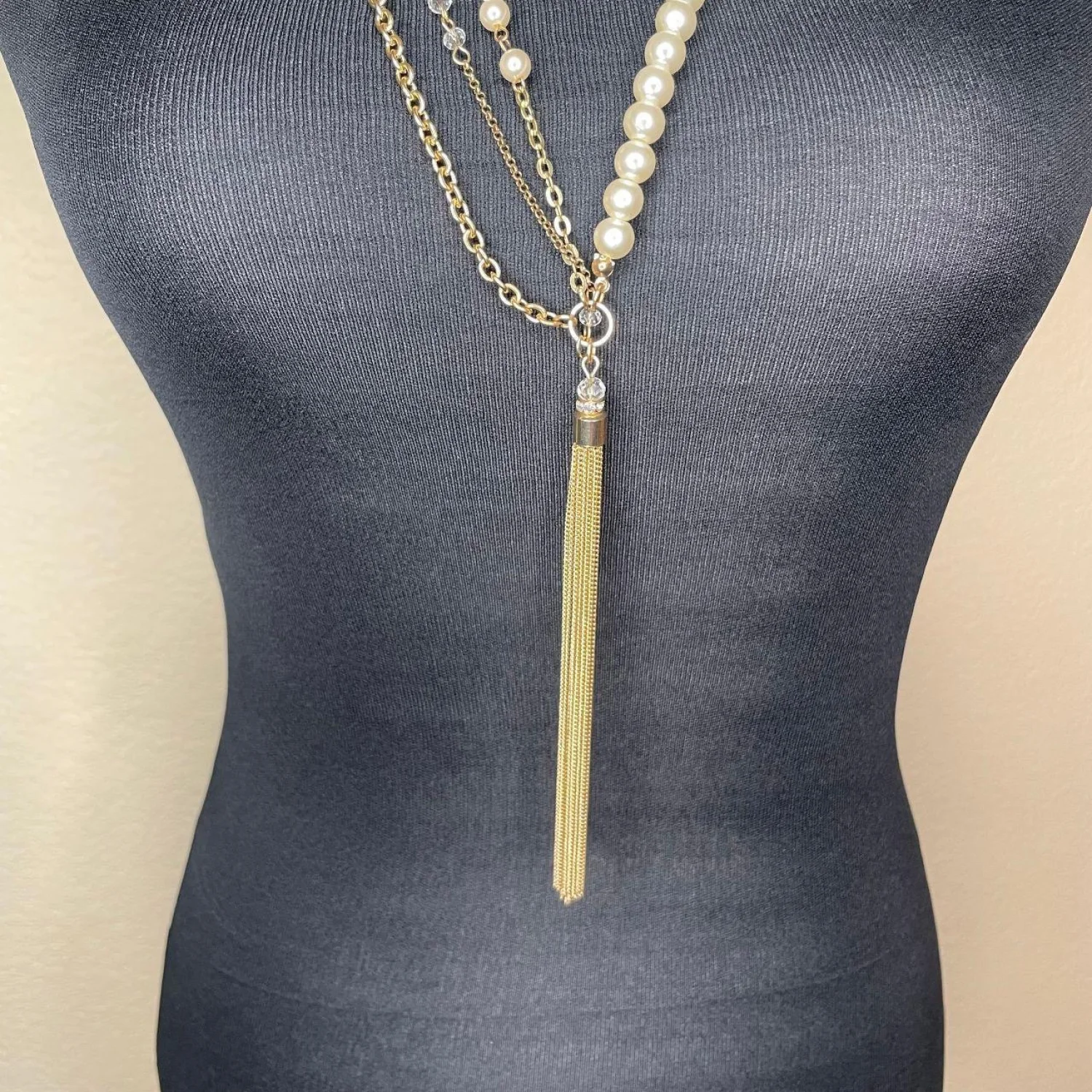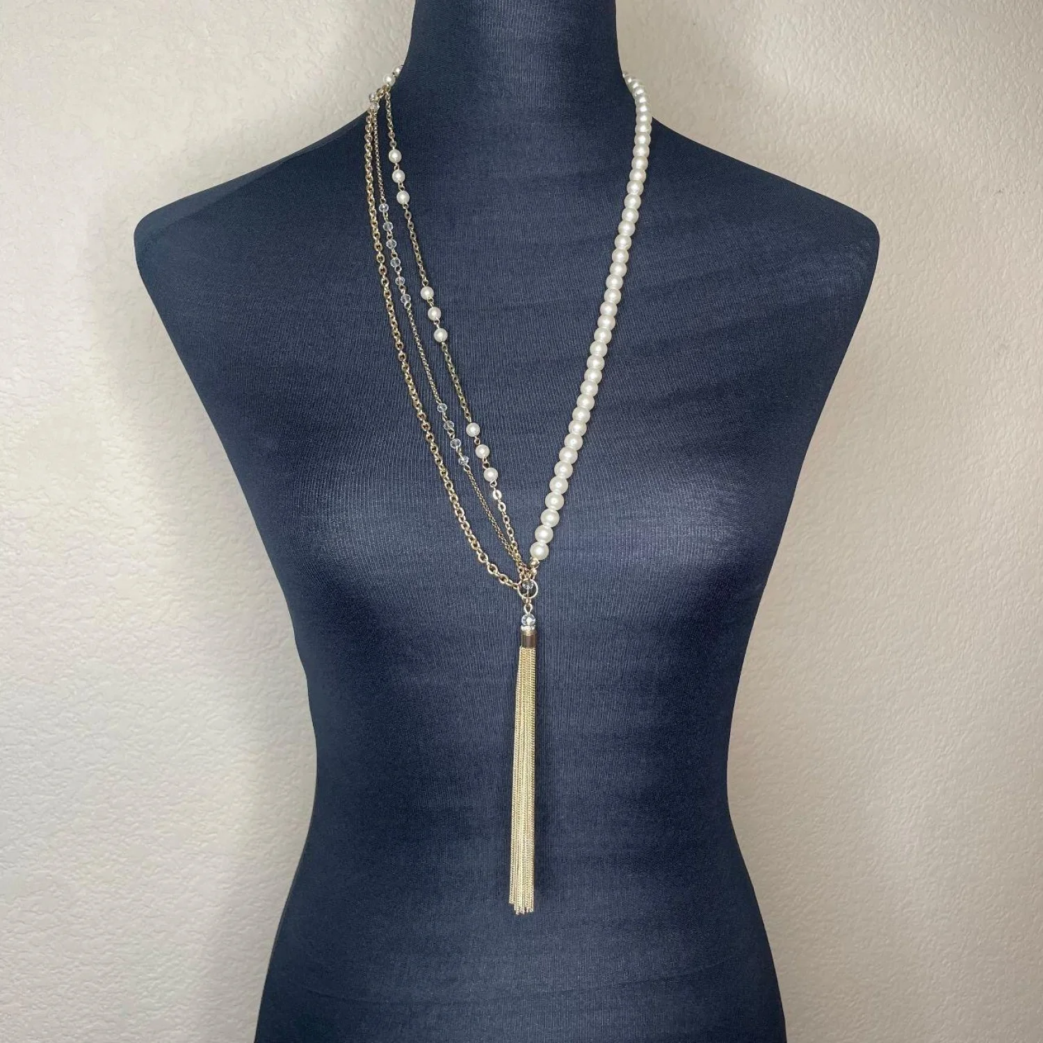 Express Pearl and Gold Chain Multi-Strand Tassel Statement Necklace