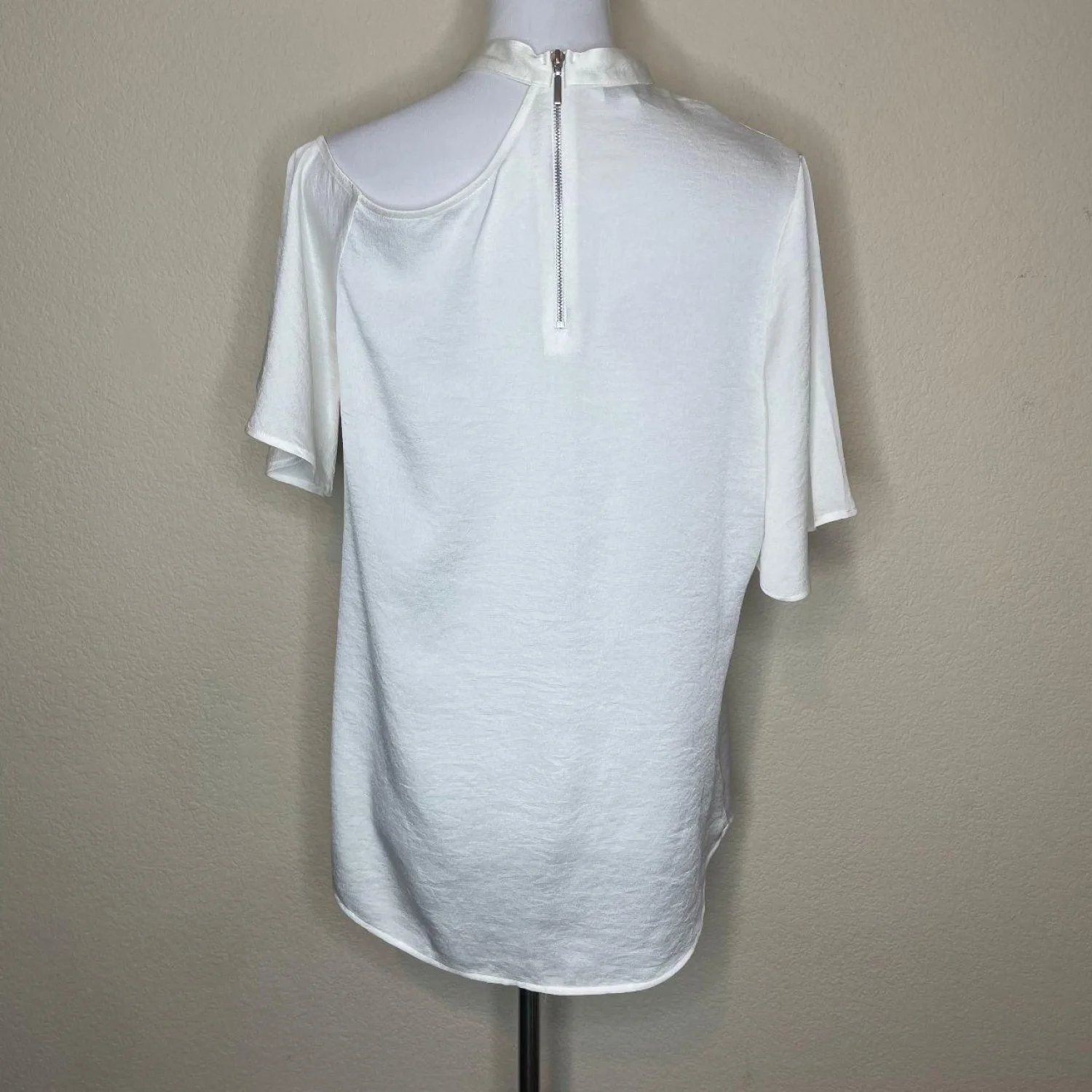 Express White Satin Asymmetric Cutout Neckline Blouse - Size Large Features: This elegant Express blouse features a stunning asymmetric neckline with a chic cutout detail and a mock neck finish. The fabric has a beautiful, silky satin-like sheen and a subtle texture that catches the light perfectly. Designed with a relaxed fit, short flutter sleeves, and a full-length back zipper for easy wear, it’s a versatile piece that transitions effortlessly from the office to a night out. • Style Profile: minimalist, quiet luxury, chic, business casual, modern, silky, monochromatic, office wear, night out, asymmetrical • Flaws: No Holes, stains, or tears (Excellent pre-owned condition) • All measurements are approximate PTP: 20" Length: 26.5" Happy to answer your questions! Super Fast Shipper!