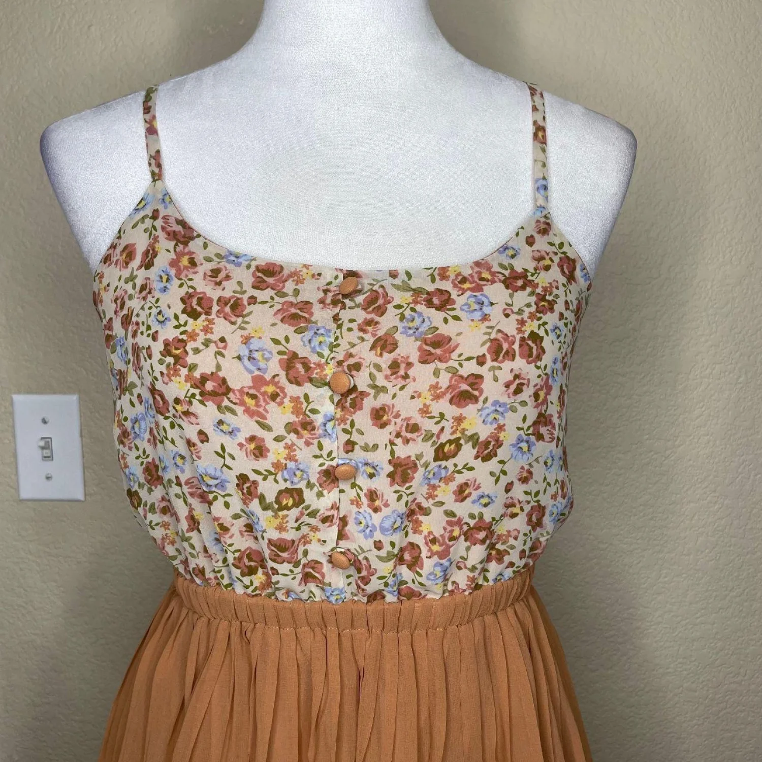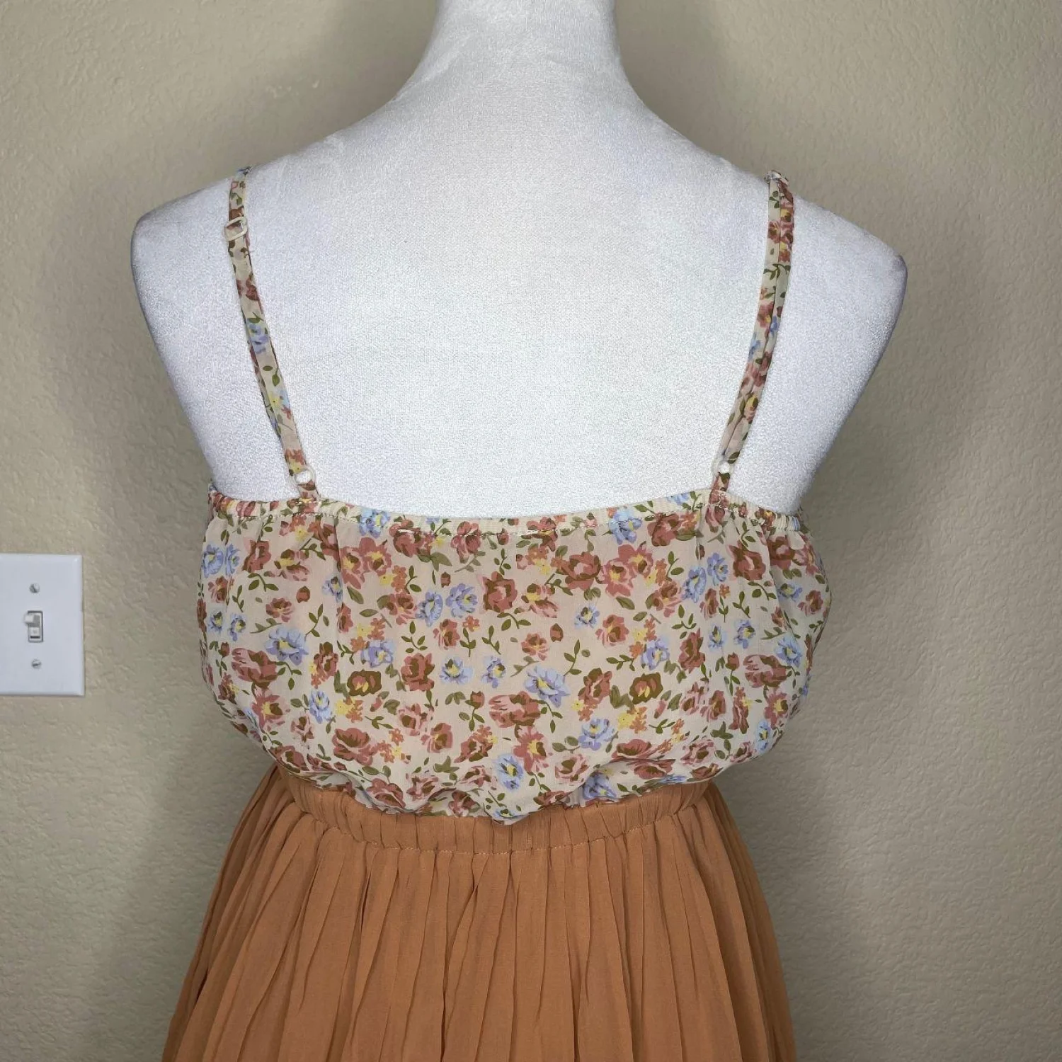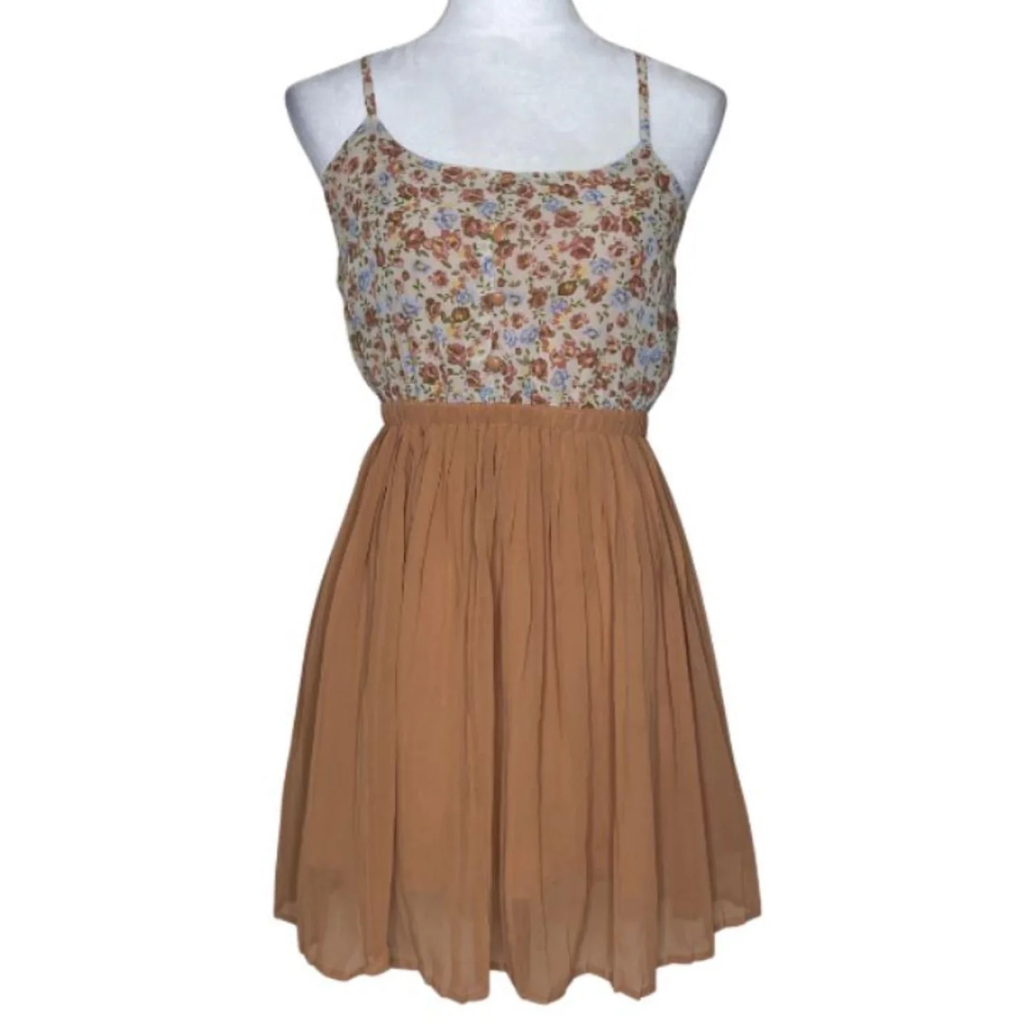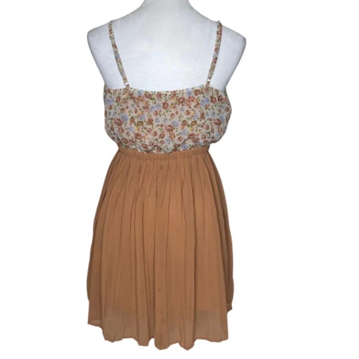 Forever 21 Brown Cream Floral Adjustable Strap Pleated Lined Dress Boho Fairy Small