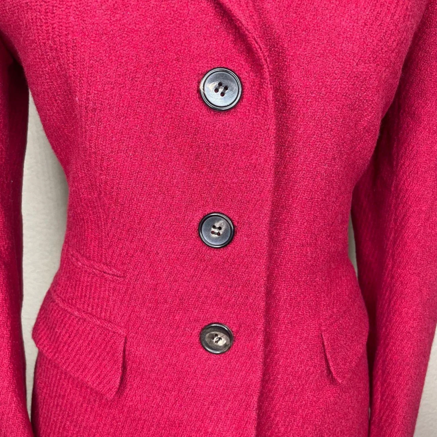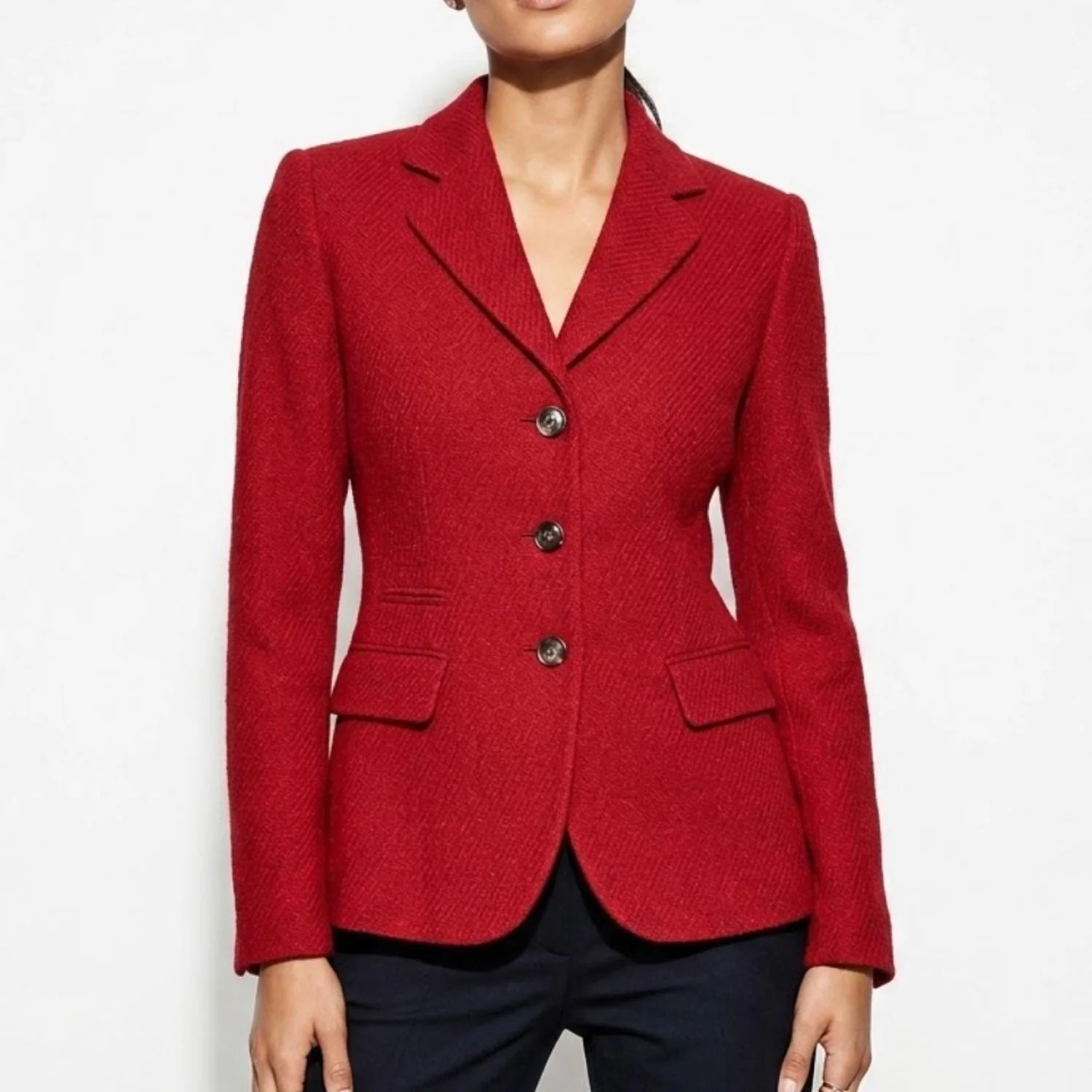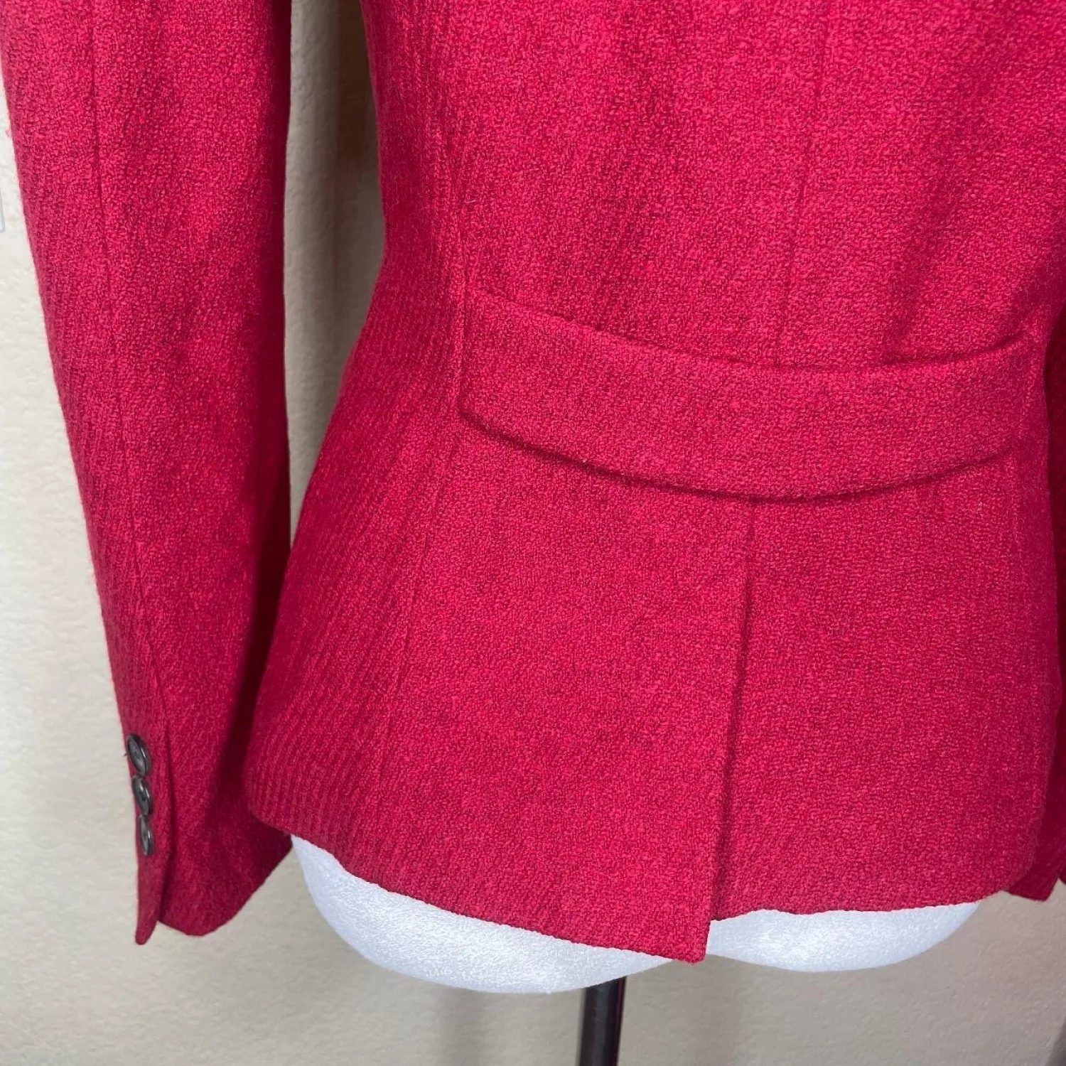 Gerard Darel Red Wool Blazer Jacket Sz 8 French Girl Dark Academia Career Features: Saturated crimson Gerard Darel blazer in a substantial textured wool blend. Features sharp, structured shoulders and a classic notched lapel that leans into a refined Parisian aesthetic. The single-breasted front has three dark contrast buttons and functional flap pockets for a crisp, tailored silhouette. Half-lined with a lustrous burgundy weave and finished with clean, bound interior seams. • Style Profile: Dark Academia, Parisian Chic, Quiet Luxury, Preppy, Academic, Corporate Goth, Tailored, Textured Wool, French Girl Style, Minimalist, Rich Girl Aesthetic, Timeless, Structured, Professional, Designer Vintage • Flaws: No Holes, stains, or tears • Please see the photos for measurements (in inches). PTP: 18' Length: 24.5' Sleeve Length: 22.5' Happy to answer your questions! Super Fast Shipper!