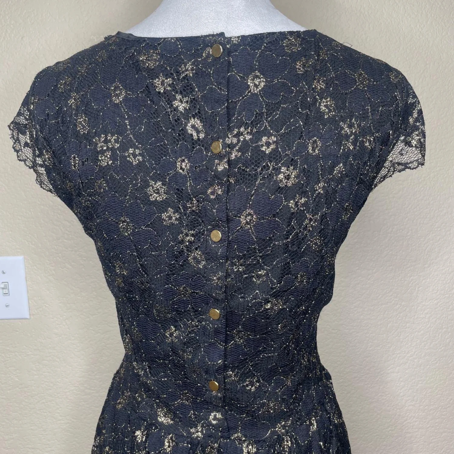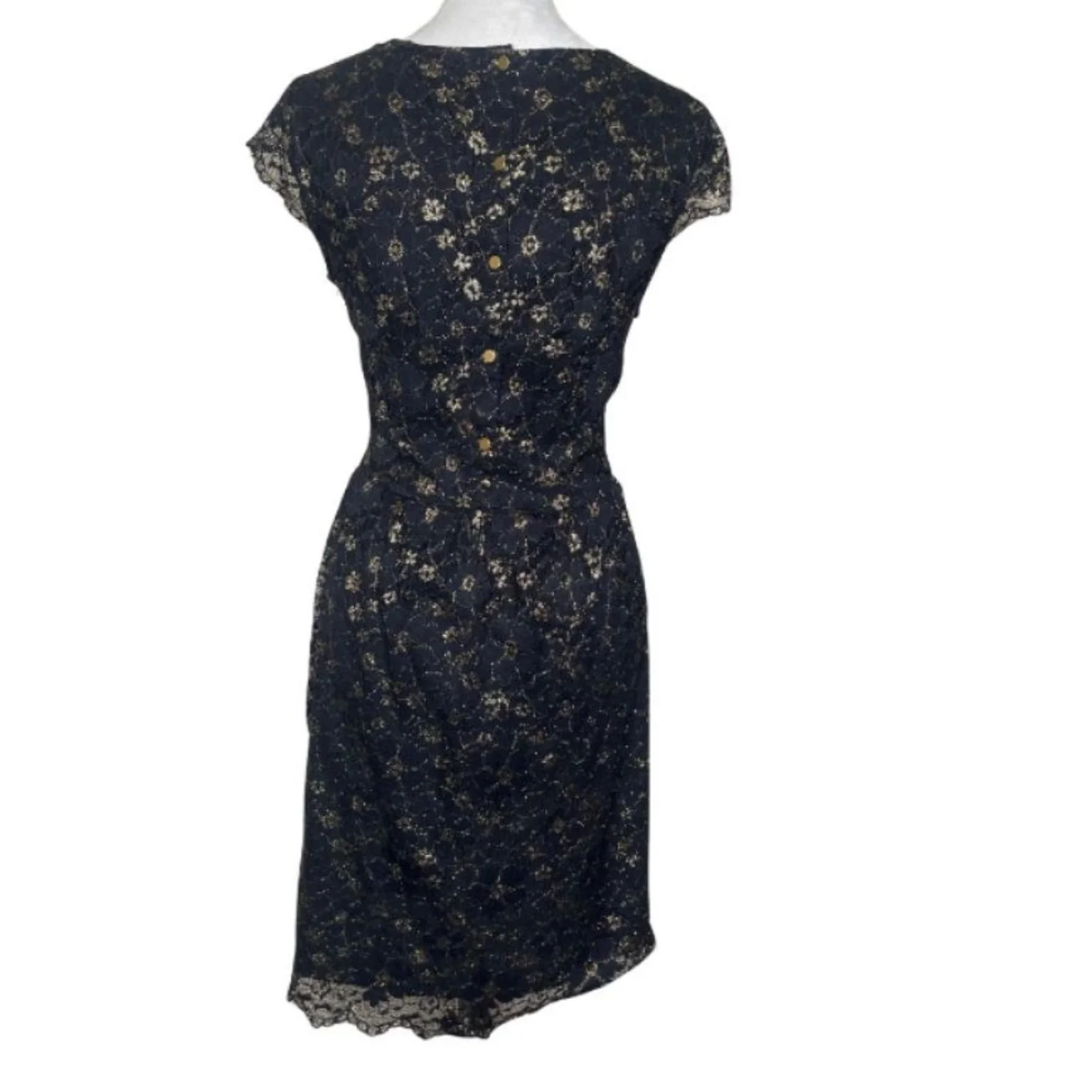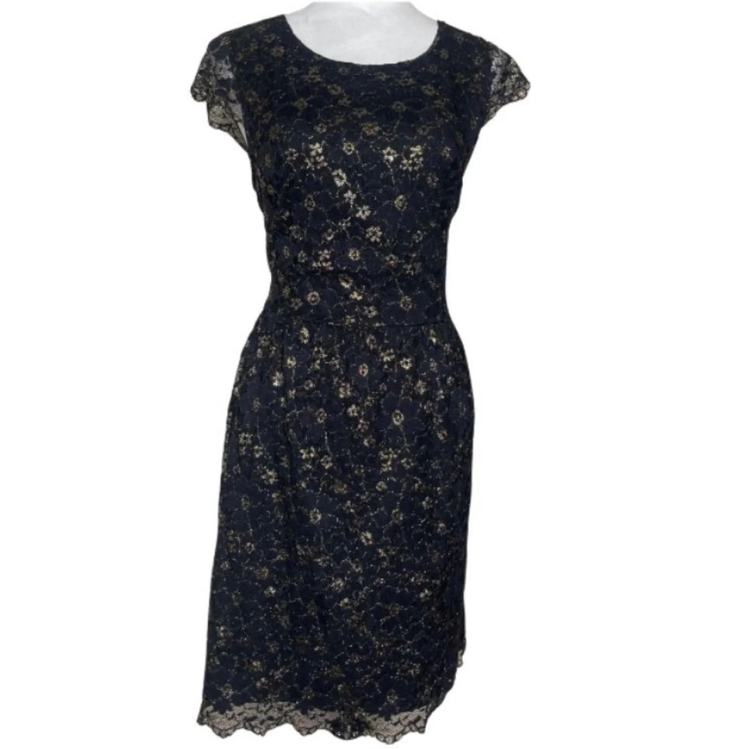 Gianni Bini Dark Coquette Black Gold Floral Metallic Lace Sheath Dress 12 Features: Dripping in moody opulence. This heavy-weight floral lace sheath features a shimmering gold metallic thread woven throughout a deep black base. The silhouette is sharp with defined cap sleeves and a scalloped eyelash lace hem that hits right at the knee. A structured bodice feeds into a subtle flared skirt, while the back features a unique gold-tone button detail and a hidden zipper for a seamless fit. • Style Profile: Dark Coquette, Whimsigoth, Gothic Romance, Holiday Party, Metallic Floral, Cocktail, Sheath Silhouette, Eyelash Lace, Moody Aesthetic, Dark Academia, Formal Night, Evening Wear, Luxe Texture • Flaws: No Holes, stains, or tears • Please see the photos for measurements (in inches). PTP: 18.5' Length: 36-37' Happy to answer your questions! Super Fast Shipper! Bundle items for discounts!
