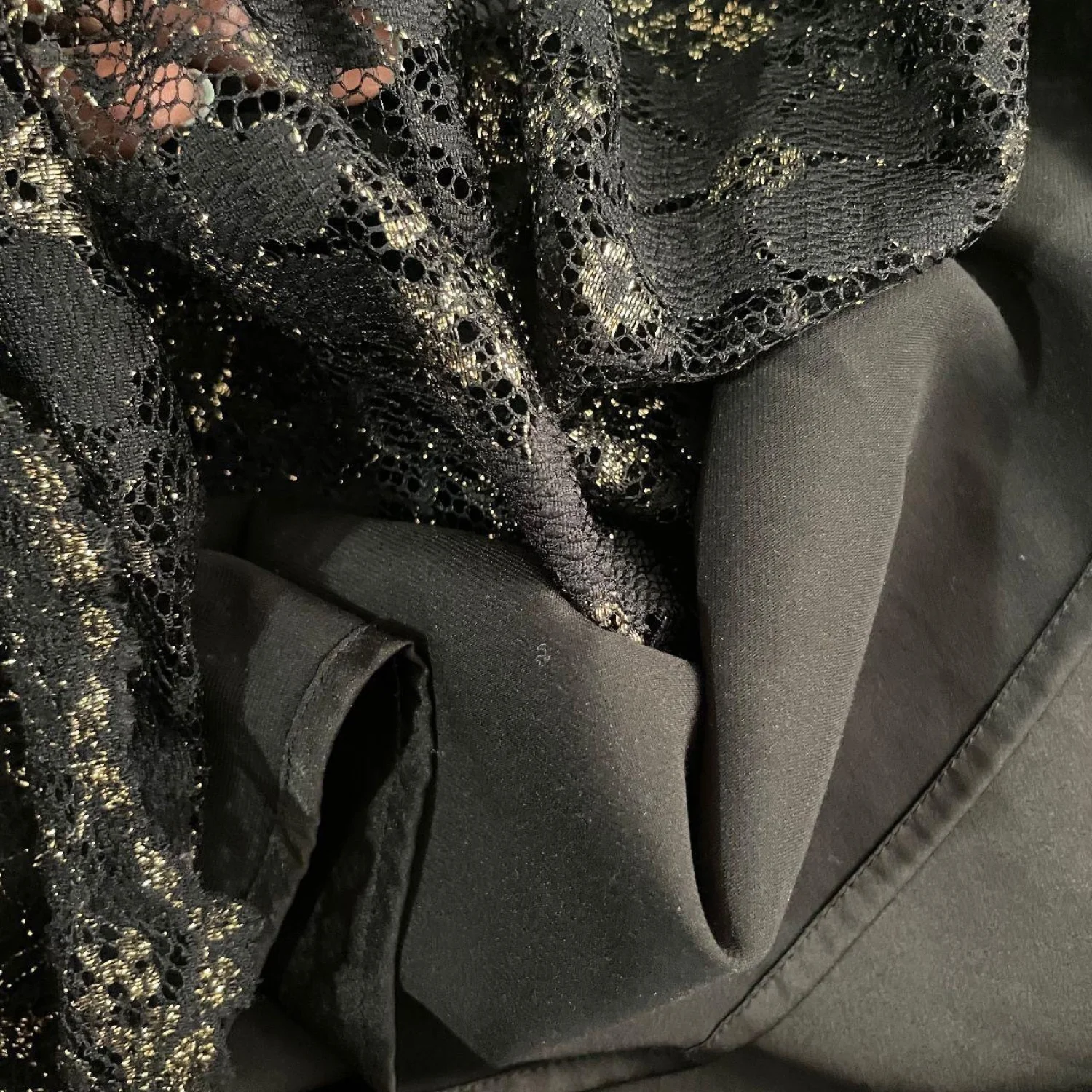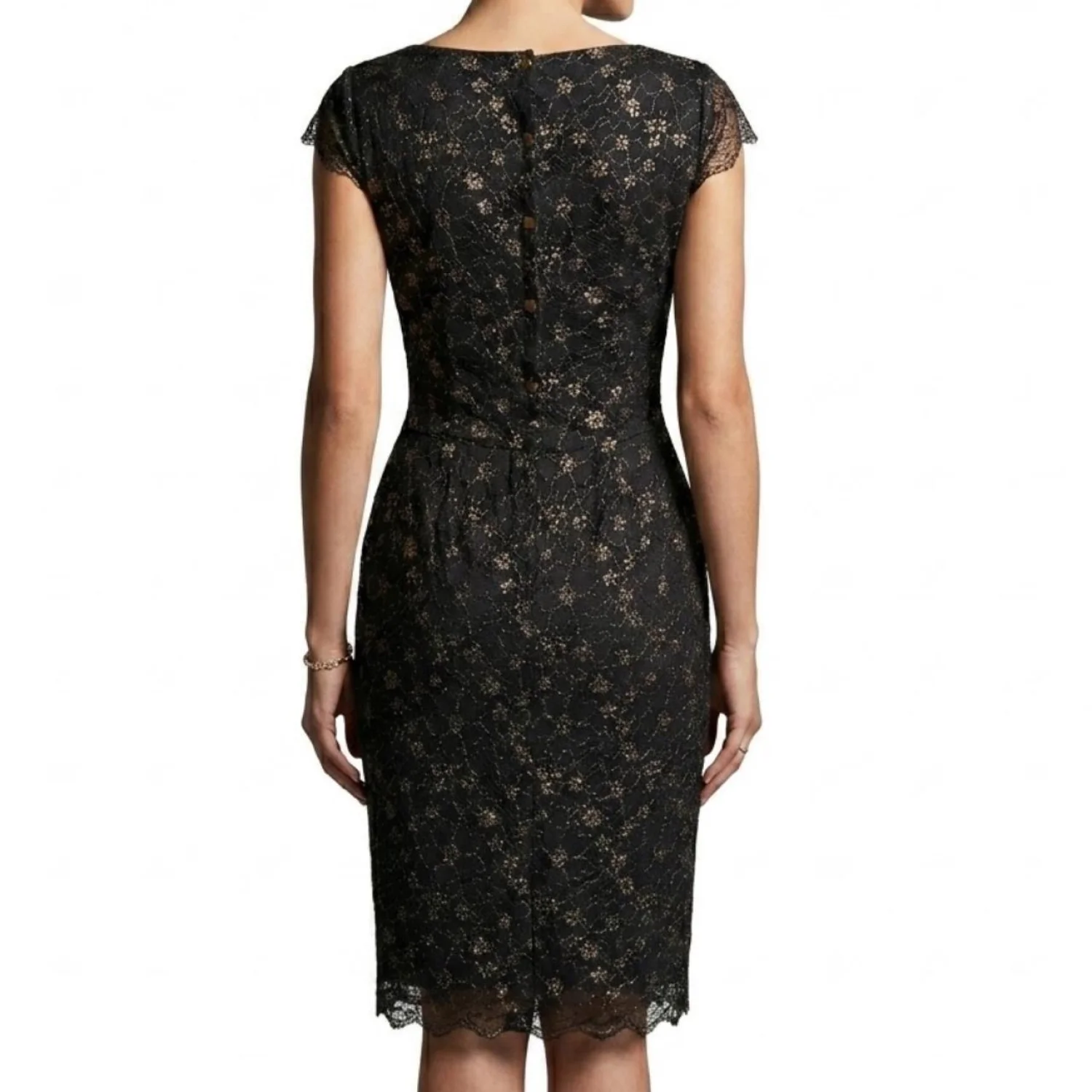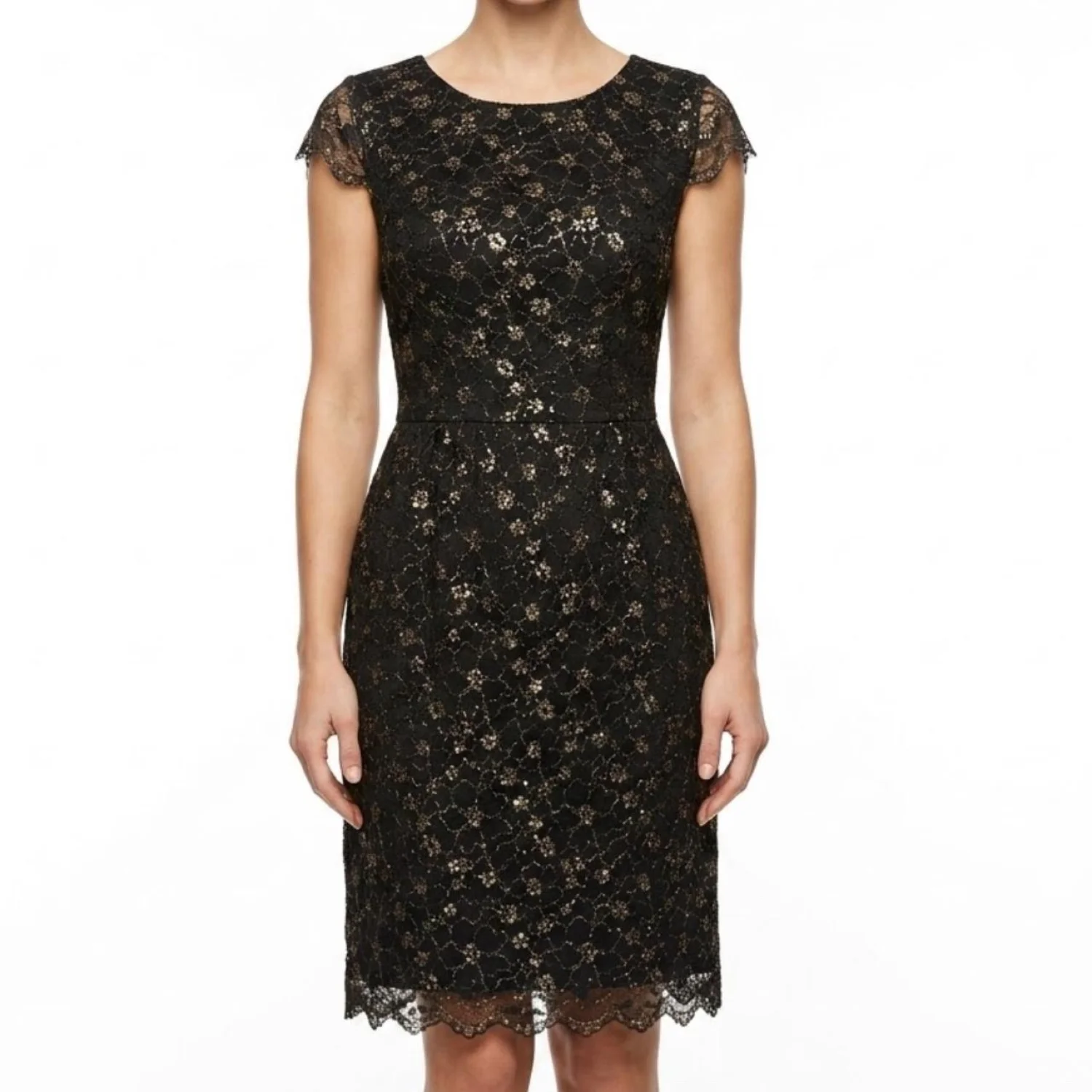 Gianni Bini Dark Coquette Black Gold Floral Metallic Lace Sheath Dress 12 Features: Dripping in moody opulence. This heavy-weight floral lace sheath features a shimmering gold metallic thread woven throughout a deep black base. The silhouette is sharp with defined cap sleeves and a scalloped eyelash lace hem that hits right at the knee. A structured bodice feeds into a subtle flared skirt, while the back features a unique gold-tone button detail and a hidden zipper for a seamless fit. • Style Profile: Dark Coquette, Whimsigoth, Gothic Romance, Holiday Party, Metallic Floral, Cocktail, Sheath Silhouette, Eyelash Lace, Moody Aesthetic, Dark Academia, Formal Night, Evening Wear, Luxe Texture • Flaws: No Holes, stains, or tears • Please see the photos for measurements (in inches). PTP: 18.5' Length: 36-37' Happy to answer your questions! Super Fast Shipper! Bundle items for discounts!