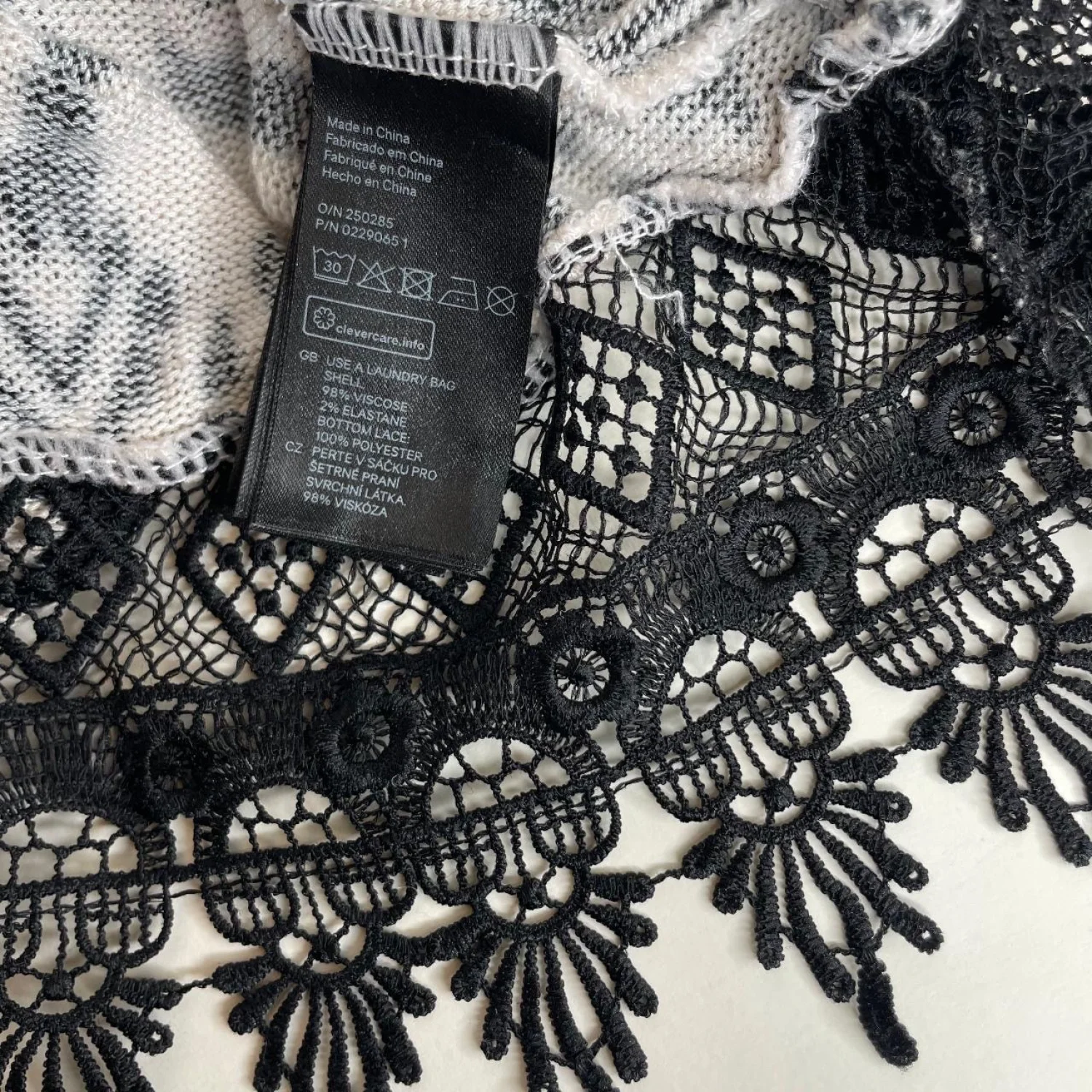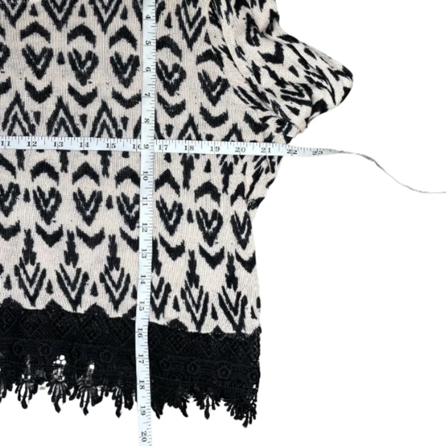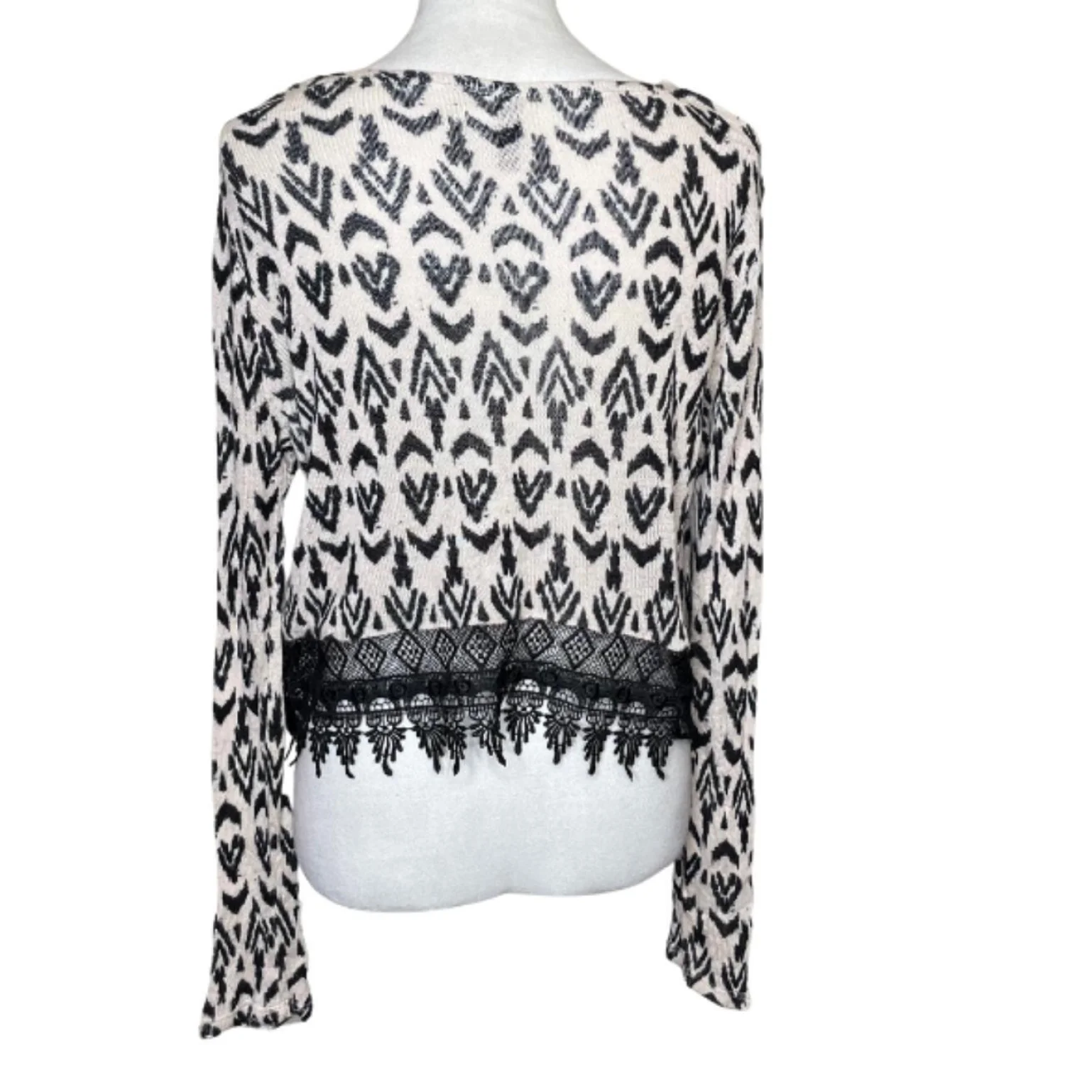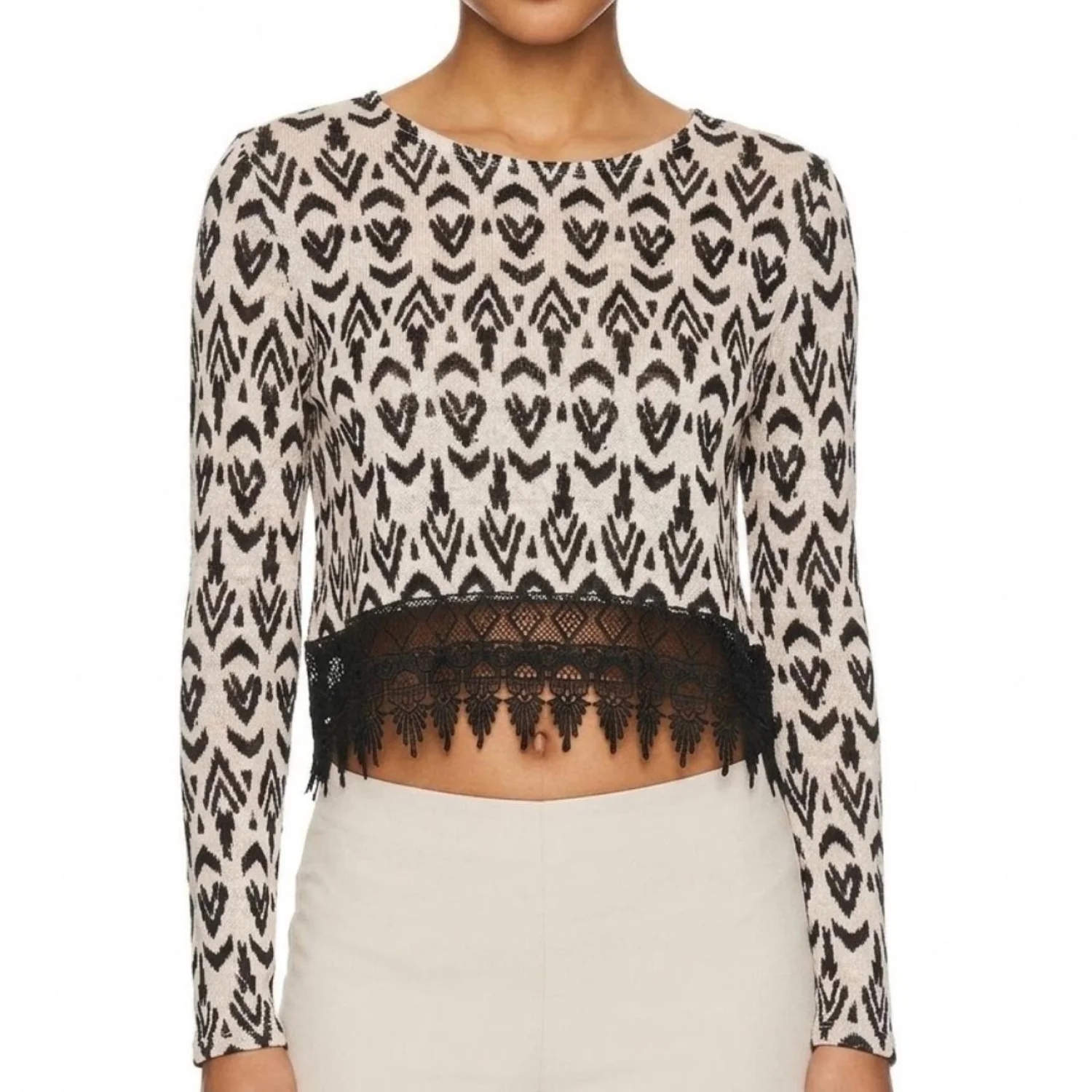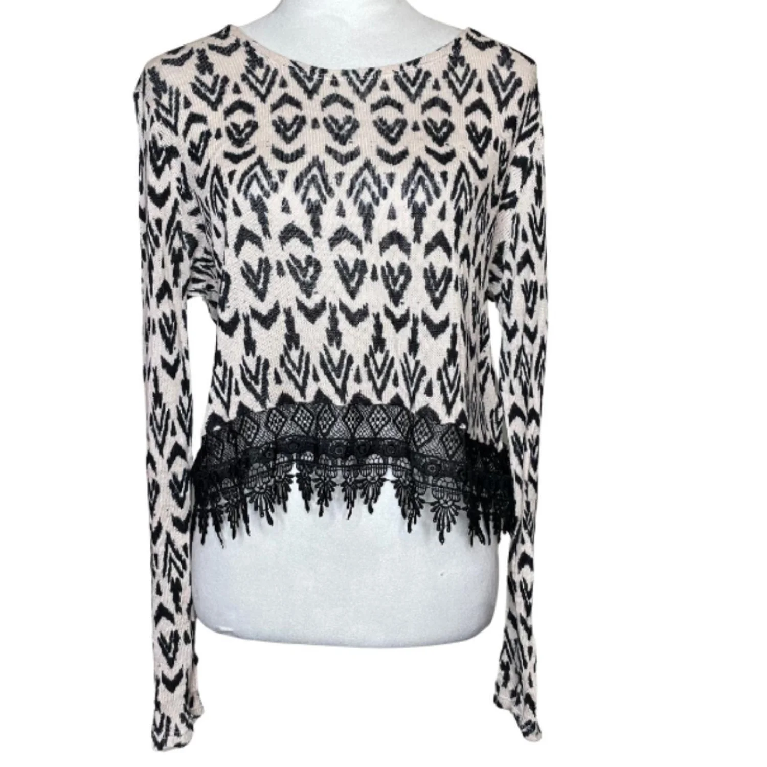 H&M Divided Tribal Ikat Print Long Sleeve Crop Top Lace Hem Black Cream Large