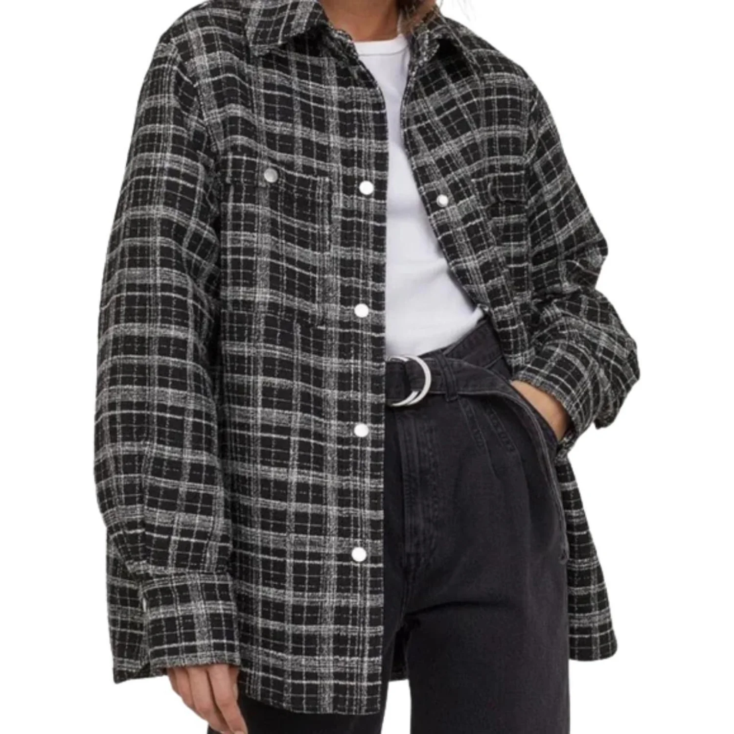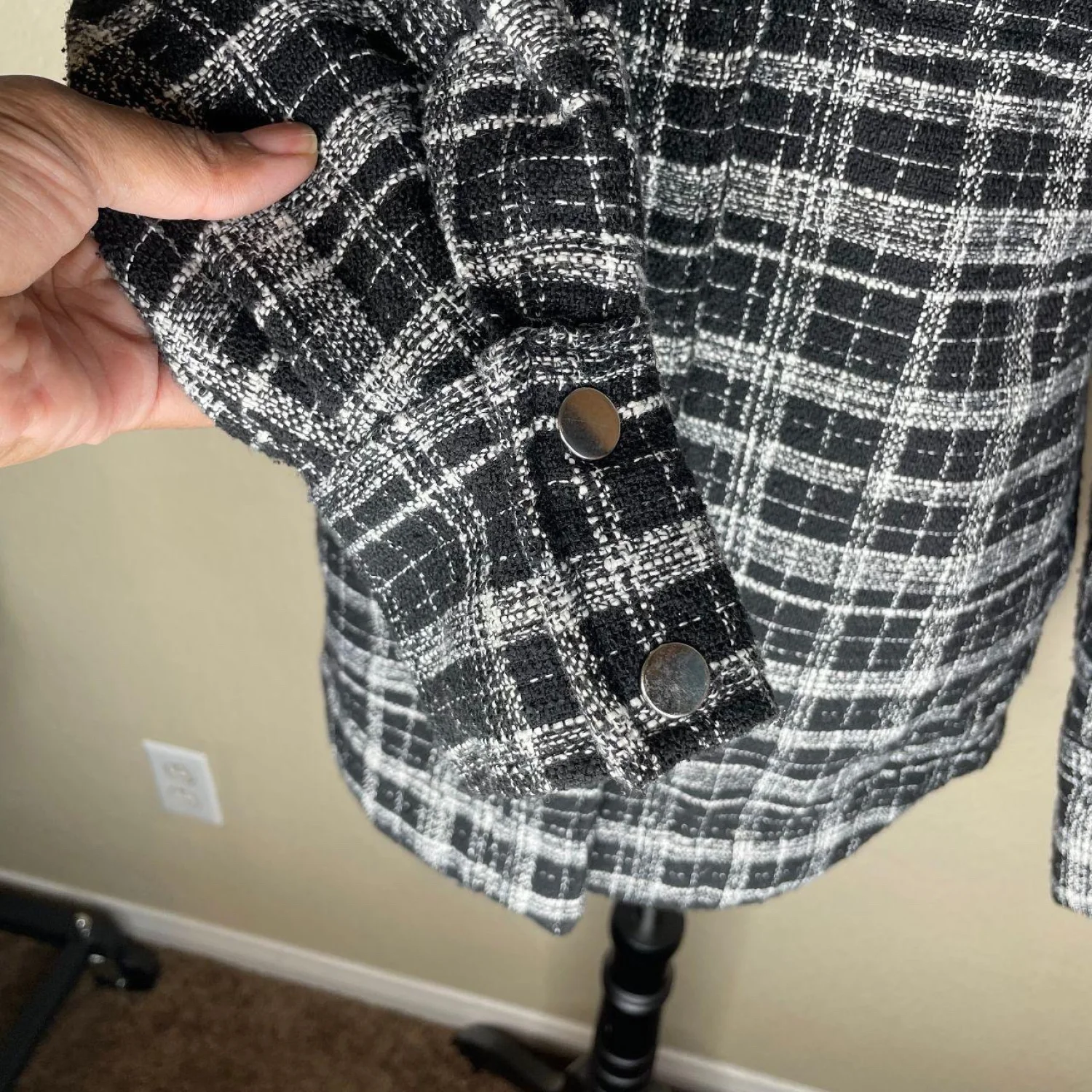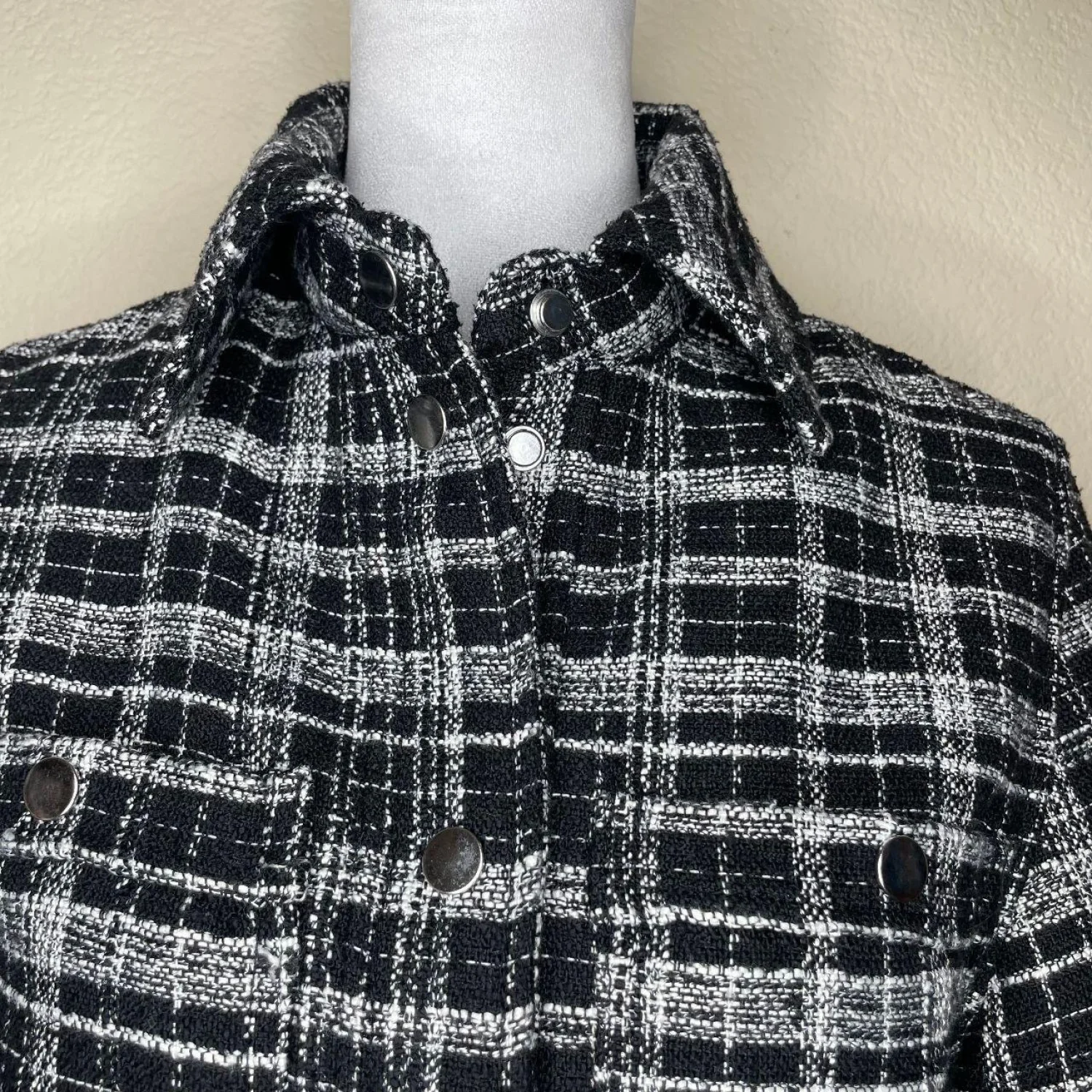 H&M Women's Black Check Thick Tweed Jacquard Shirt Jacket Accent Buttons Size XS