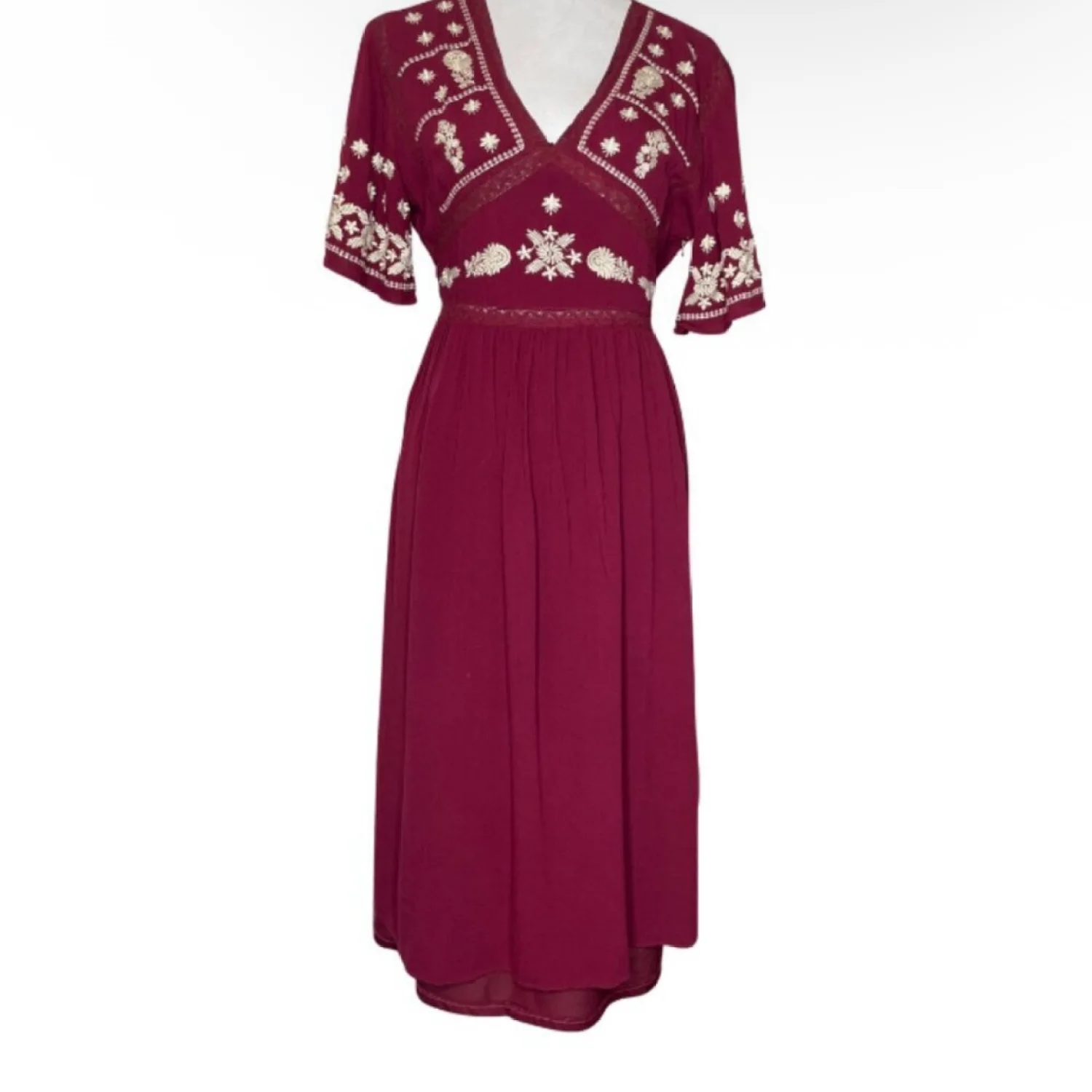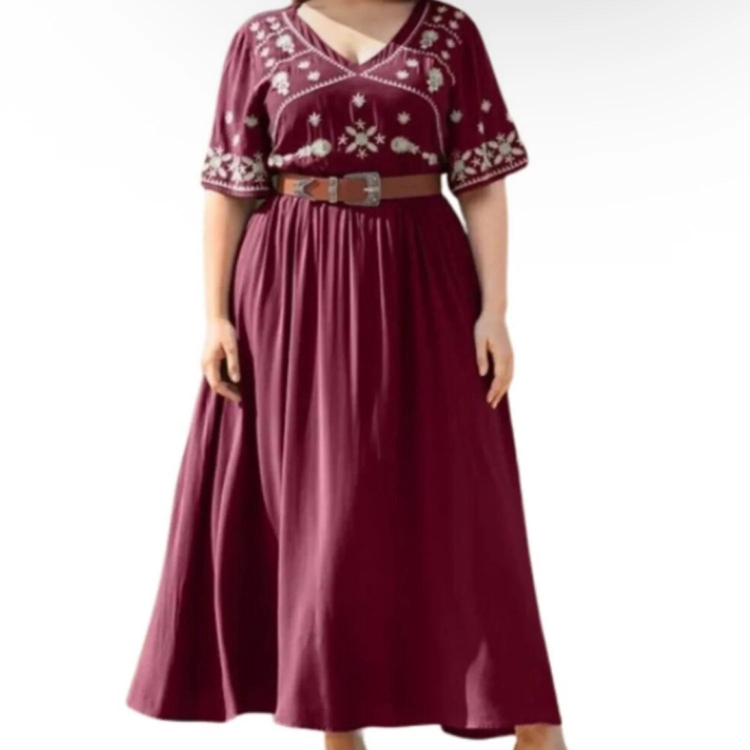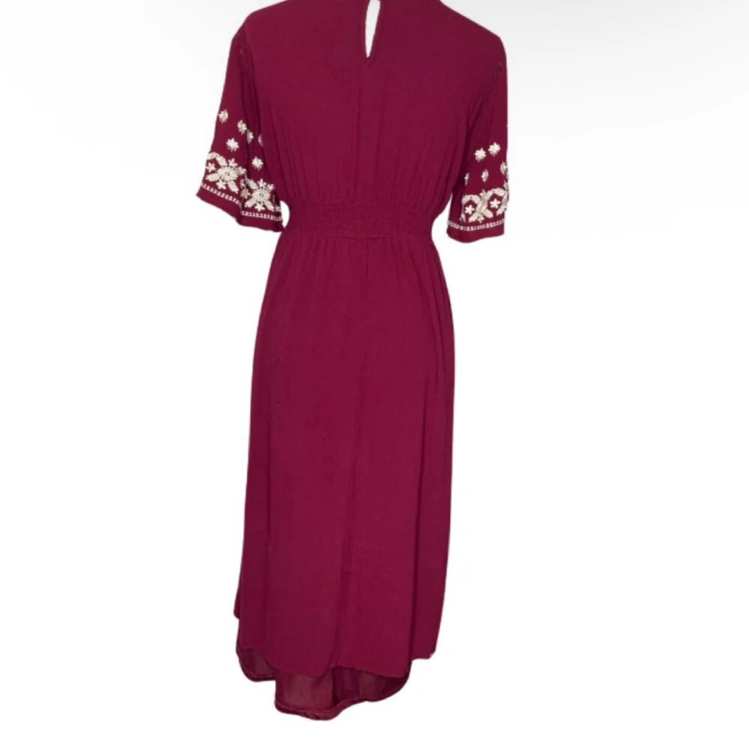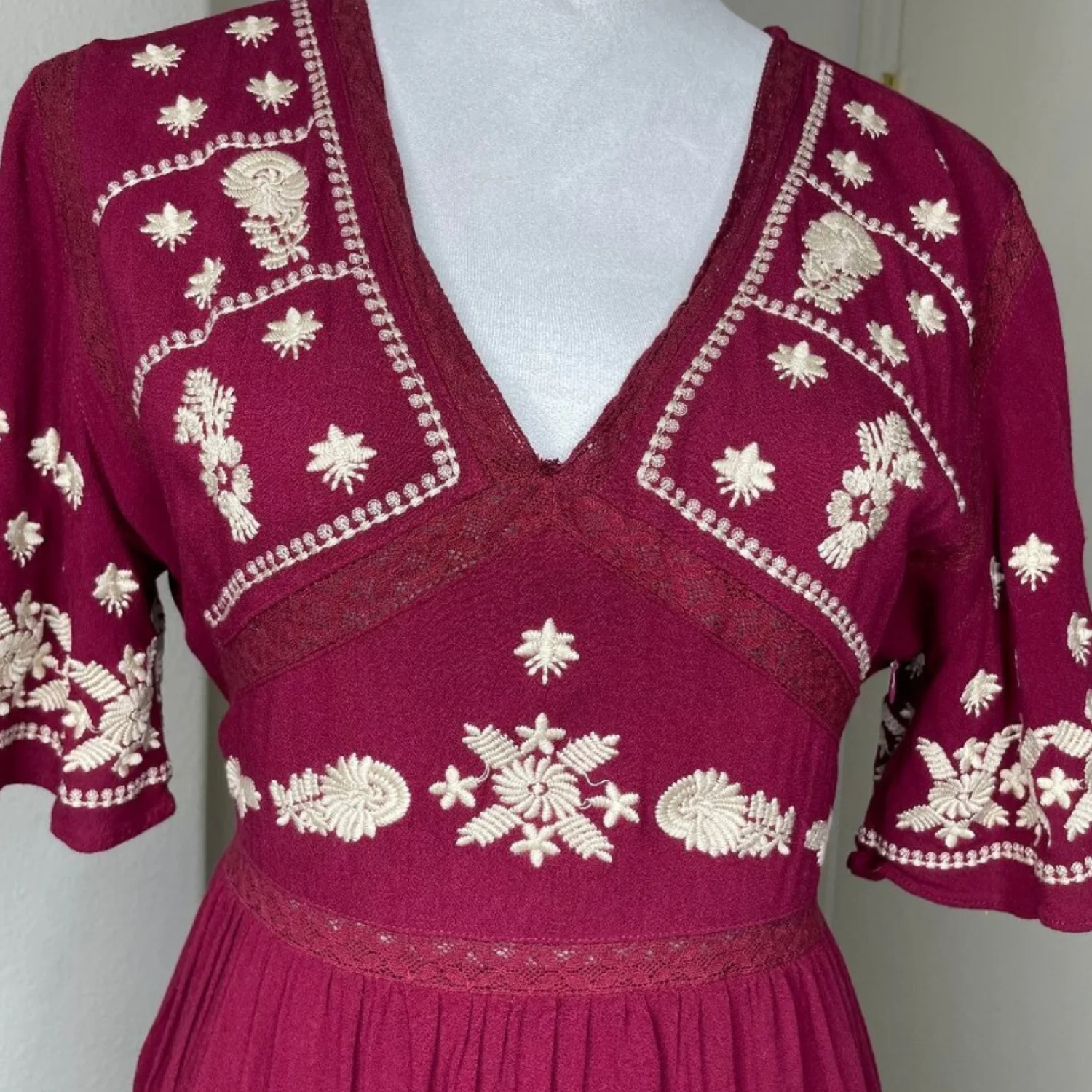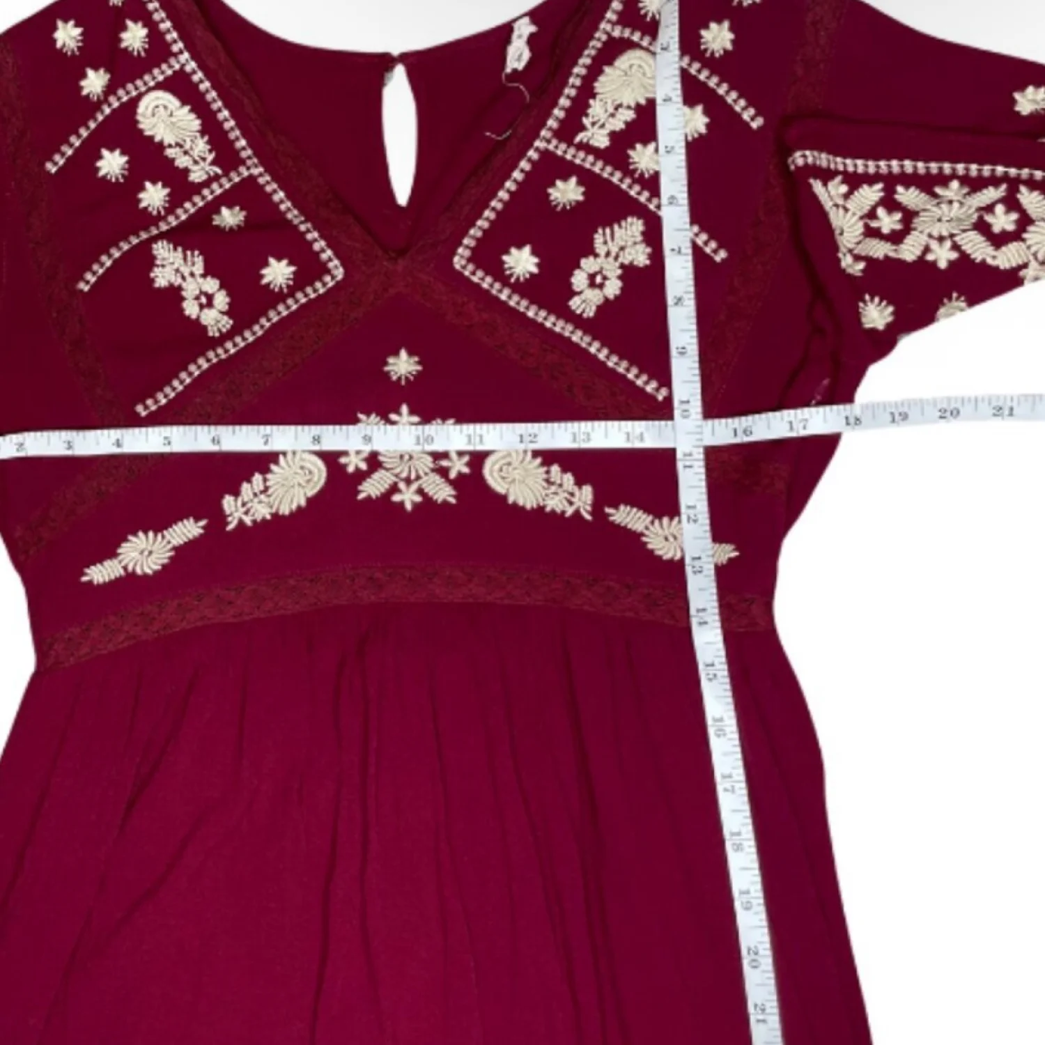 In Loom Maroon Embroidery Bohemian V Neck Keyhole Button Lined Maxi Dress Medium