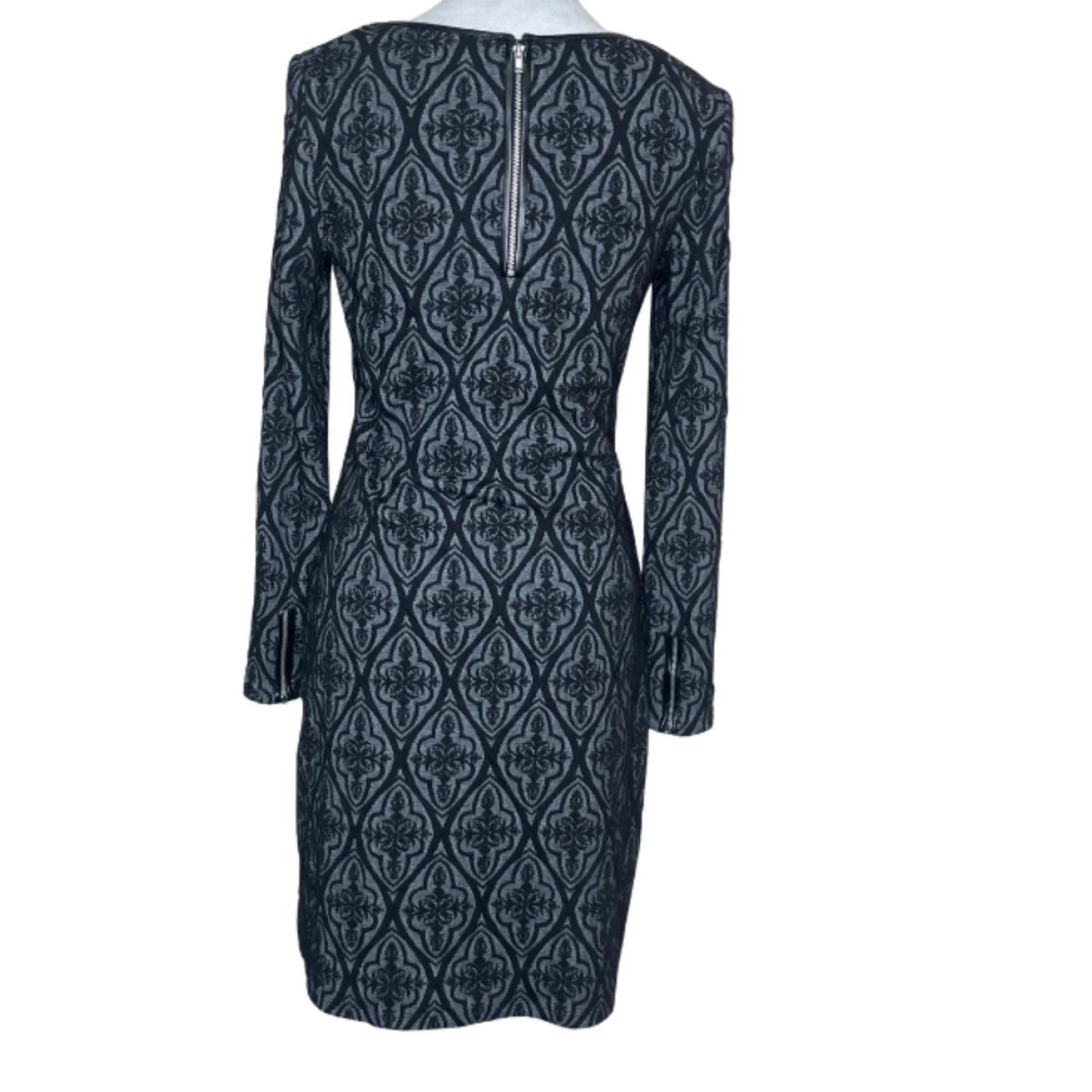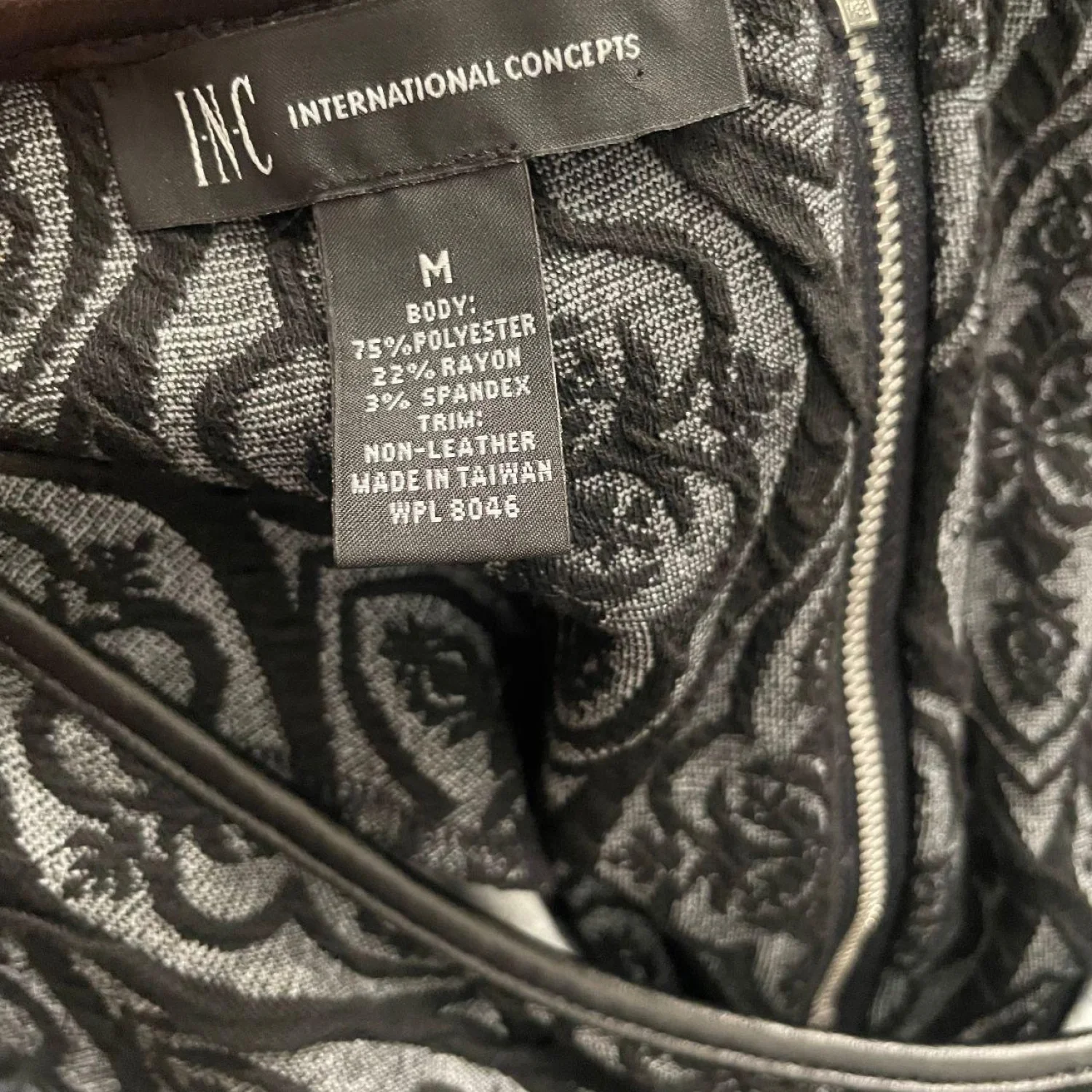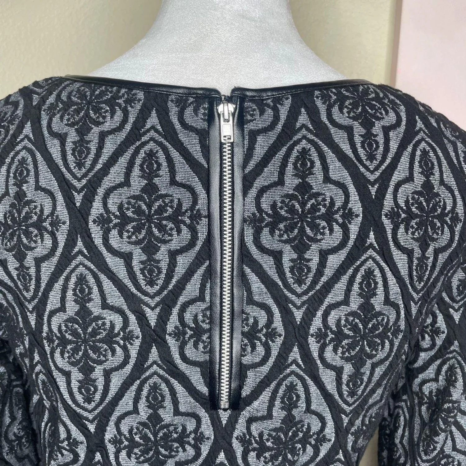 INC International Concepts Gothic Damask Jacquard Sheath Dress Faux Leather Trim Features: Industrial-leaning sheath silhouette featuring a dimensional damask jacquard. The knit body is framed by sharp faux-leather piping at the neckline and a raw, exposed silver industrial zipper down the spine. Engineered with functional zipper hardware at the cuffs for an adjustable, flared sleeve or a tapered, sharp-wrist look. • Style Profile: Gothic, Dark Academia, Corporate Goth, Victorian, Whimsigoth, Jacquard, Industrial, Edgy, Dark Coquette, Brocade, Textured Knit, Faux Leather, Alt Fashion, Funeral Chic, Mid-Sleeve • Flaws: No Holes, stains, or tears • Please see the photos for measurements (in inches). PTP: 16' Length: 36' Sleeve Length: 22.5' Happy to answer your questions! Super Fast Shipper!