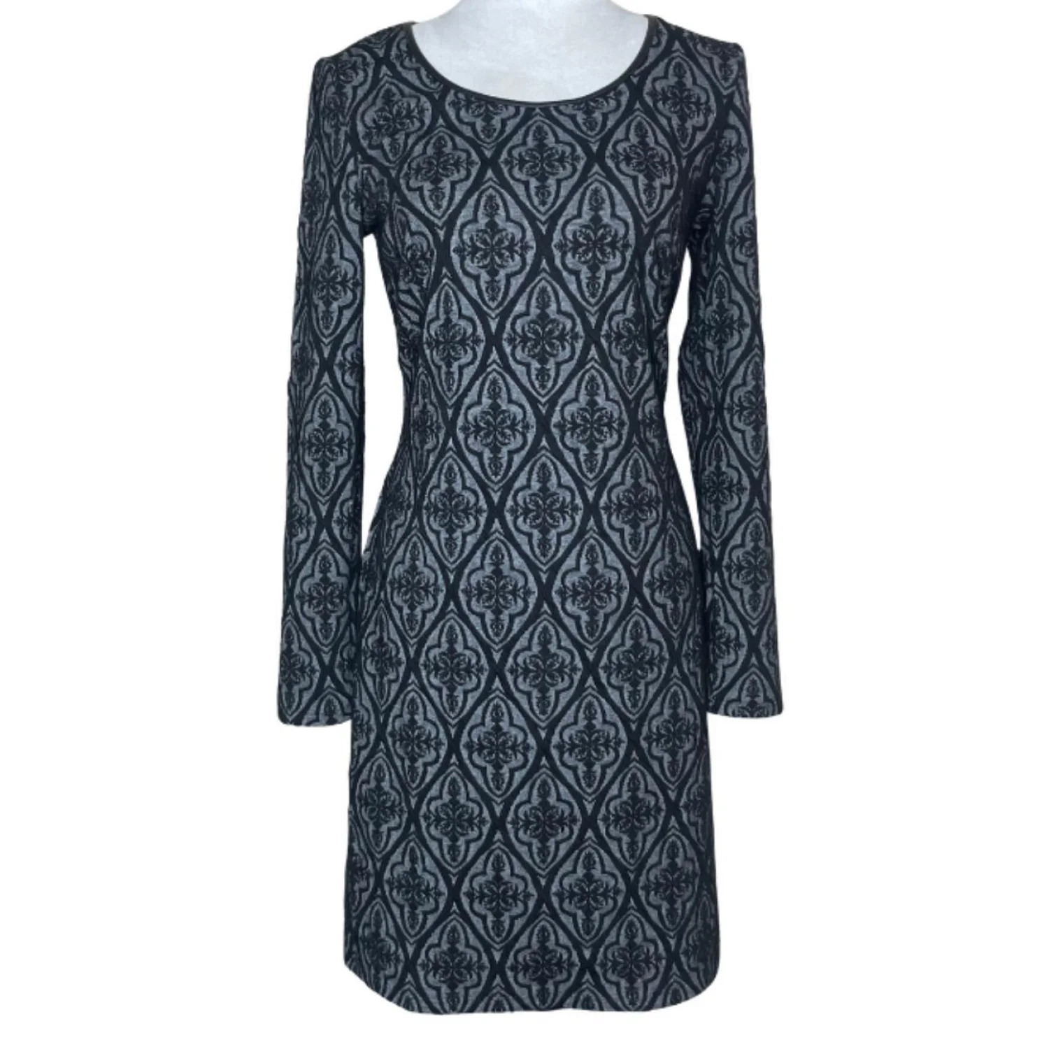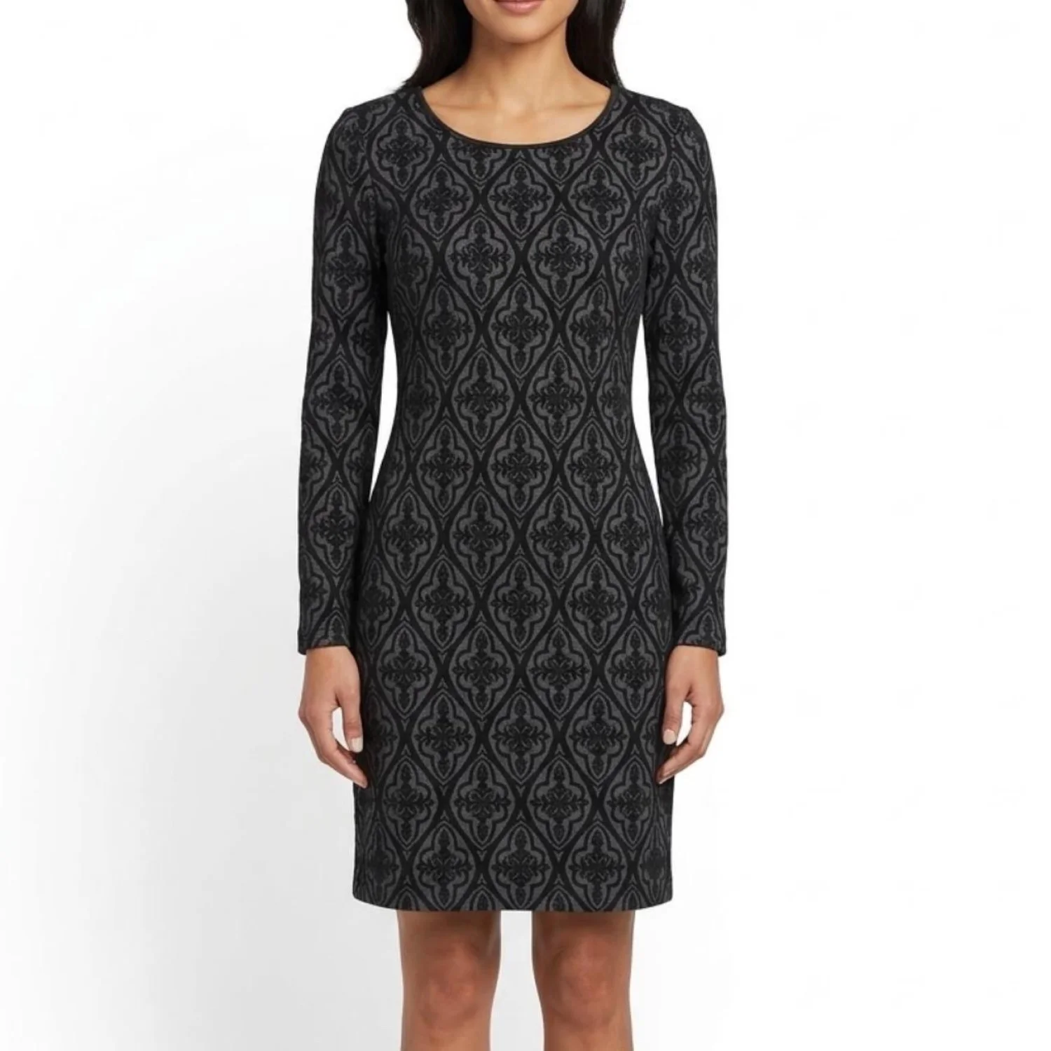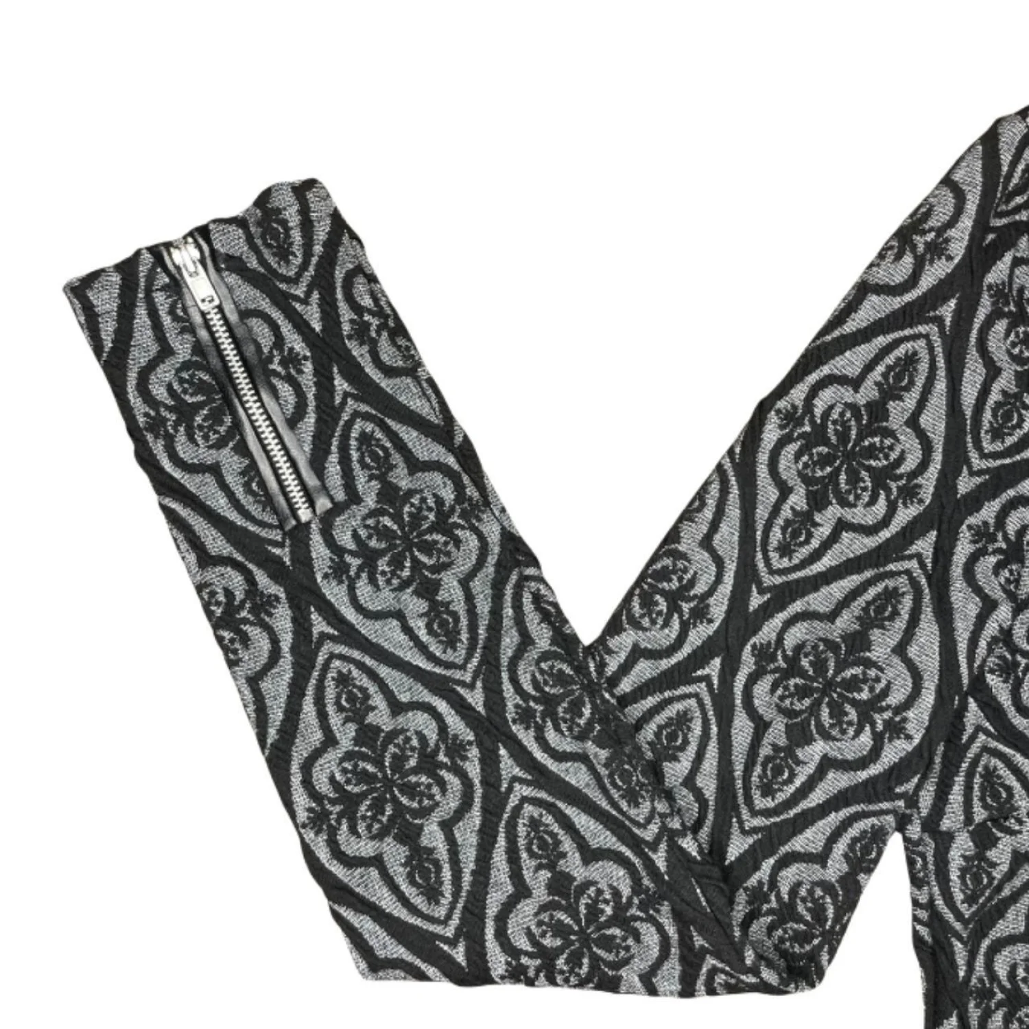 INC International Concepts Gothic Damask Jacquard Sheath Dress Faux Leather Trim Features: Industrial-leaning sheath silhouette featuring a dimensional damask jacquard. The knit body is framed by sharp faux-leather piping at the neckline and a raw, exposed silver industrial zipper down the spine. Engineered with functional zipper hardware at the cuffs for an adjustable, flared sleeve or a tapered, sharp-wrist look. • Style Profile: Gothic, Dark Academia, Corporate Goth, Victorian, Whimsigoth, Jacquard, Industrial, Edgy, Dark Coquette, Brocade, Textured Knit, Faux Leather, Alt Fashion, Funeral Chic, Mid-Sleeve • Flaws: No Holes, stains, or tears • Please see the photos for measurements (in inches). PTP: 16' Length: 36' Sleeve Length: 22.5' Happy to answer your questions! Super Fast Shipper!