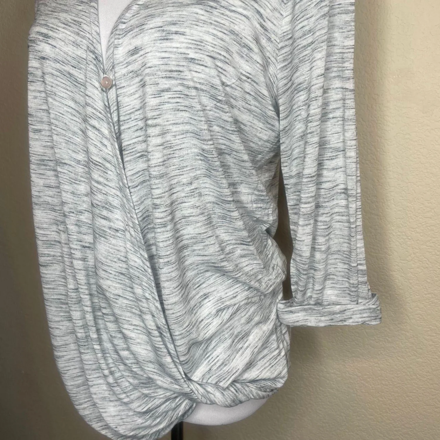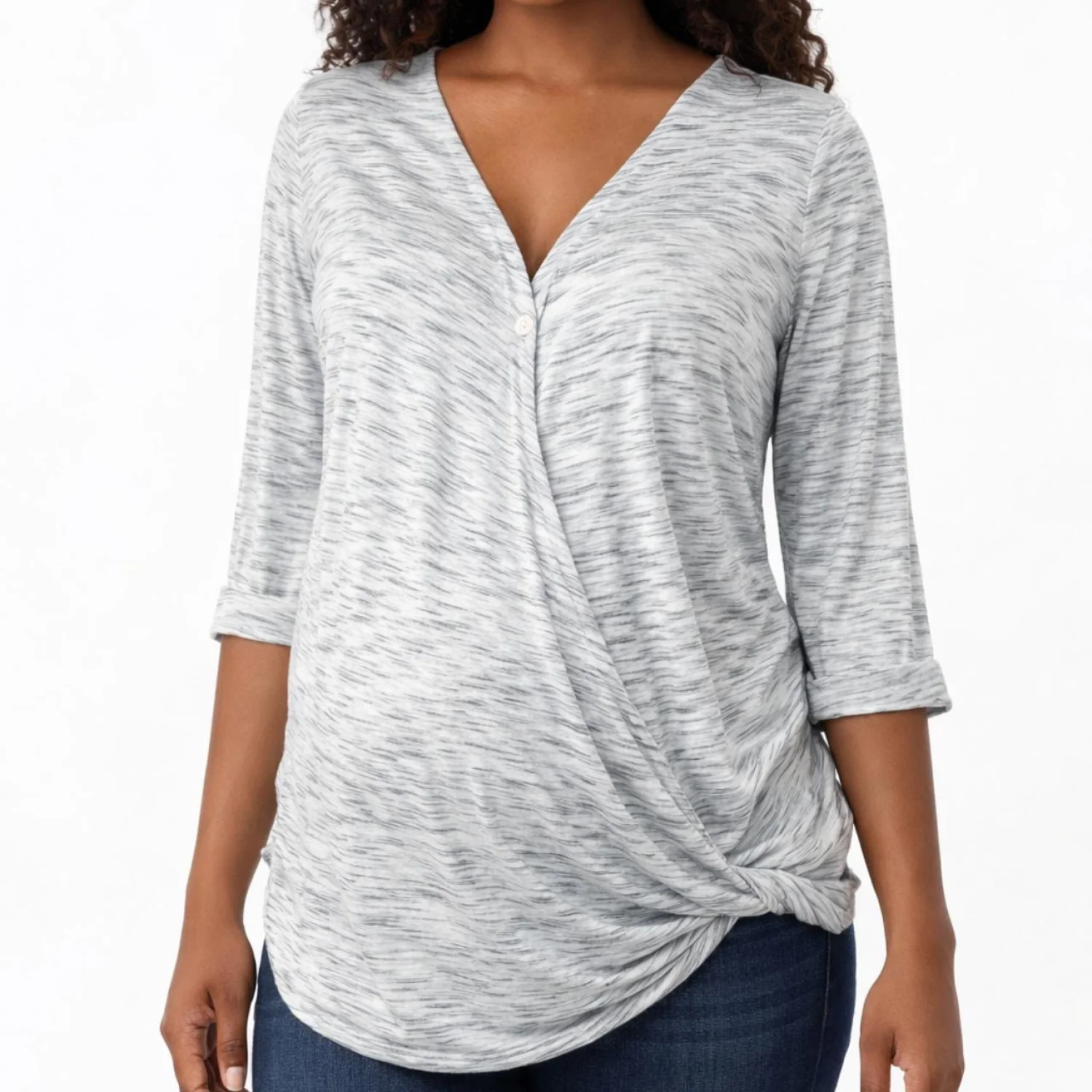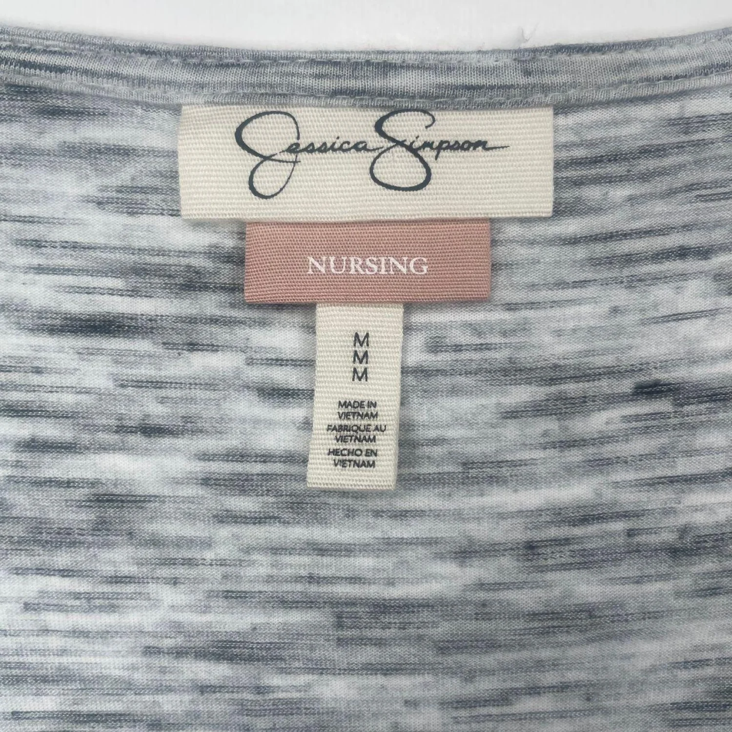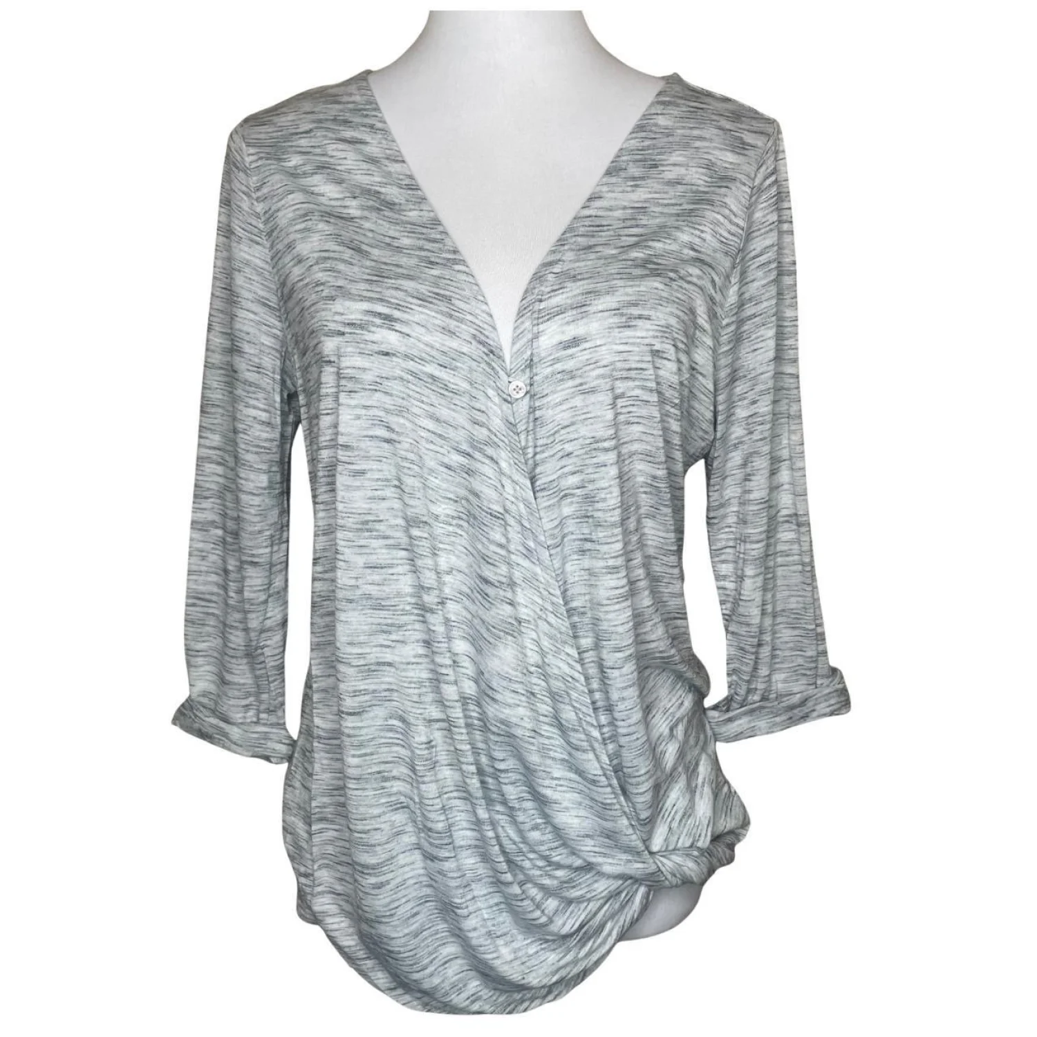Jessica Simpson Nursing Top Grey Space Dye Faux Wrap Maternity Blouse Size M Features: Grey space-dye nursing top by Jessica Simpson. Features a cool heathered texture, 3/4 sleeves, and a draped wrap front with a single button closure. Perfect for new moms who want a chic, effortless look. Flattering knotted hem detail. • Style Profile: maternity, nursing, postpartum, space dye, heathered, wrap top, casual, boho, comfortable, basics, layering, minimalist, 3/4 sleeve, knot front, Jessica Simpson • Flaws: No Holes, stains, or tears (Excellent pre-owned condition) • All measurements are approximate PTP: 19" Length: 26" Happy to answer your questions! Super Fast Shipper!