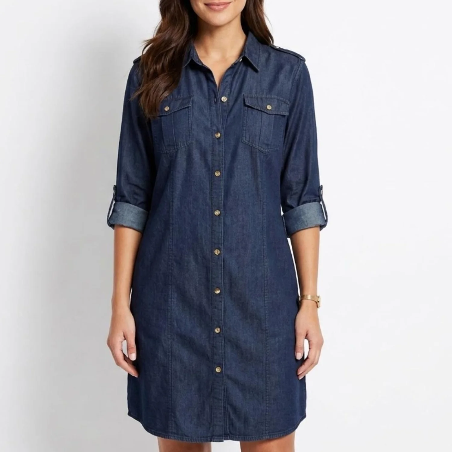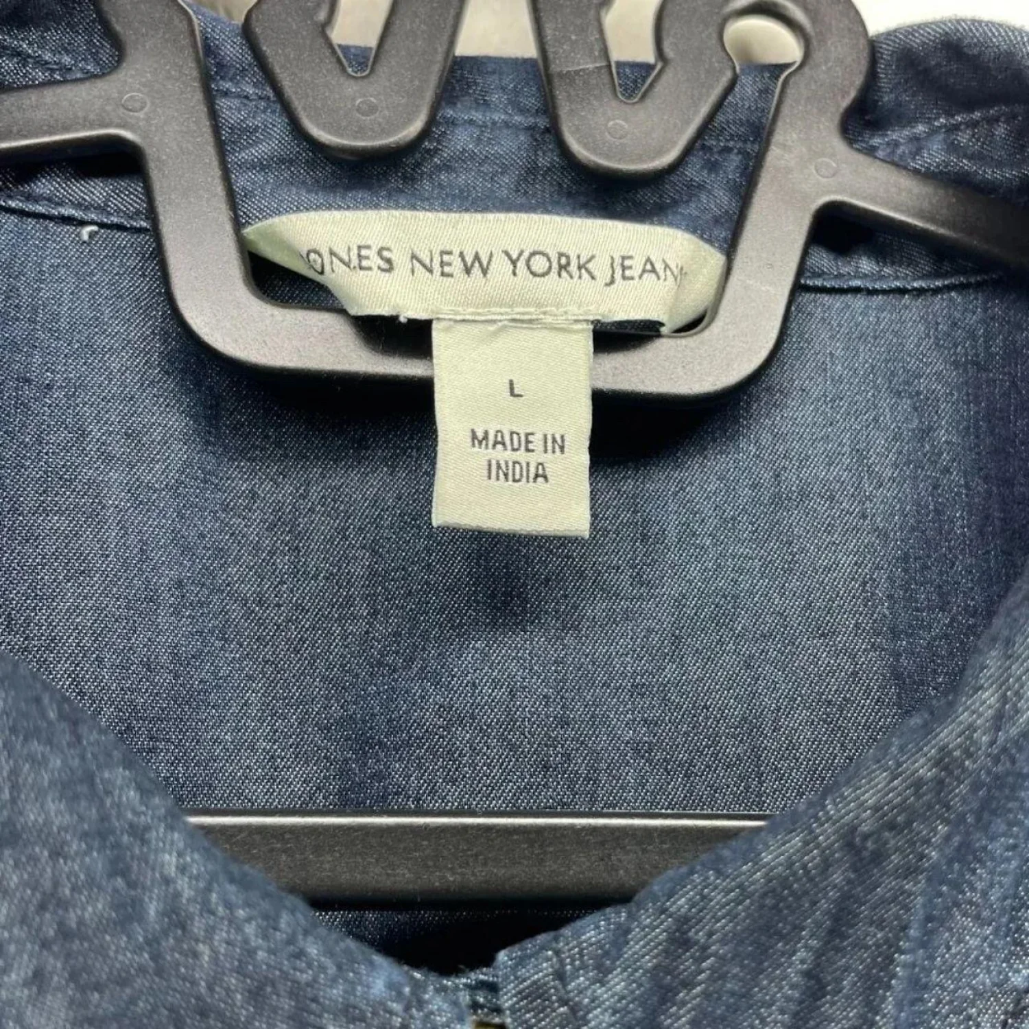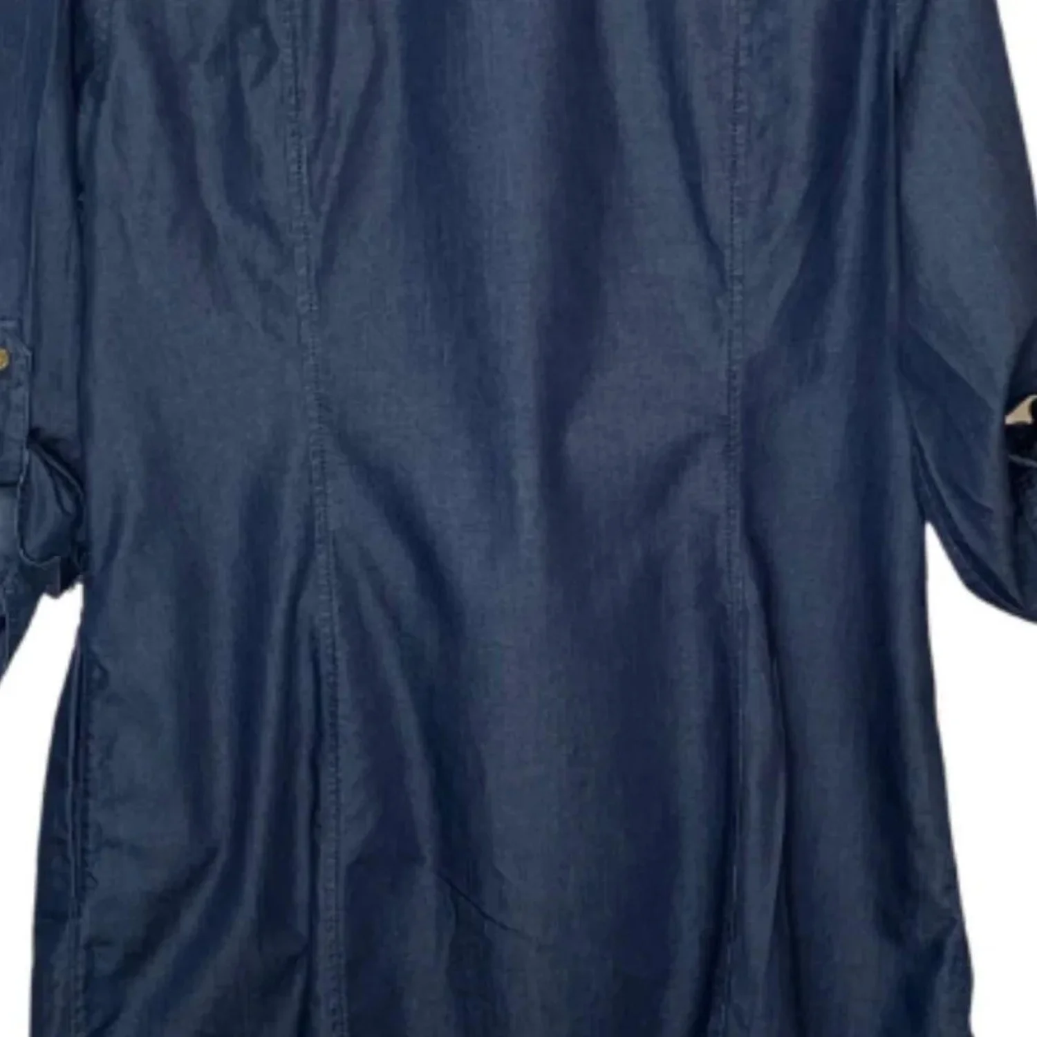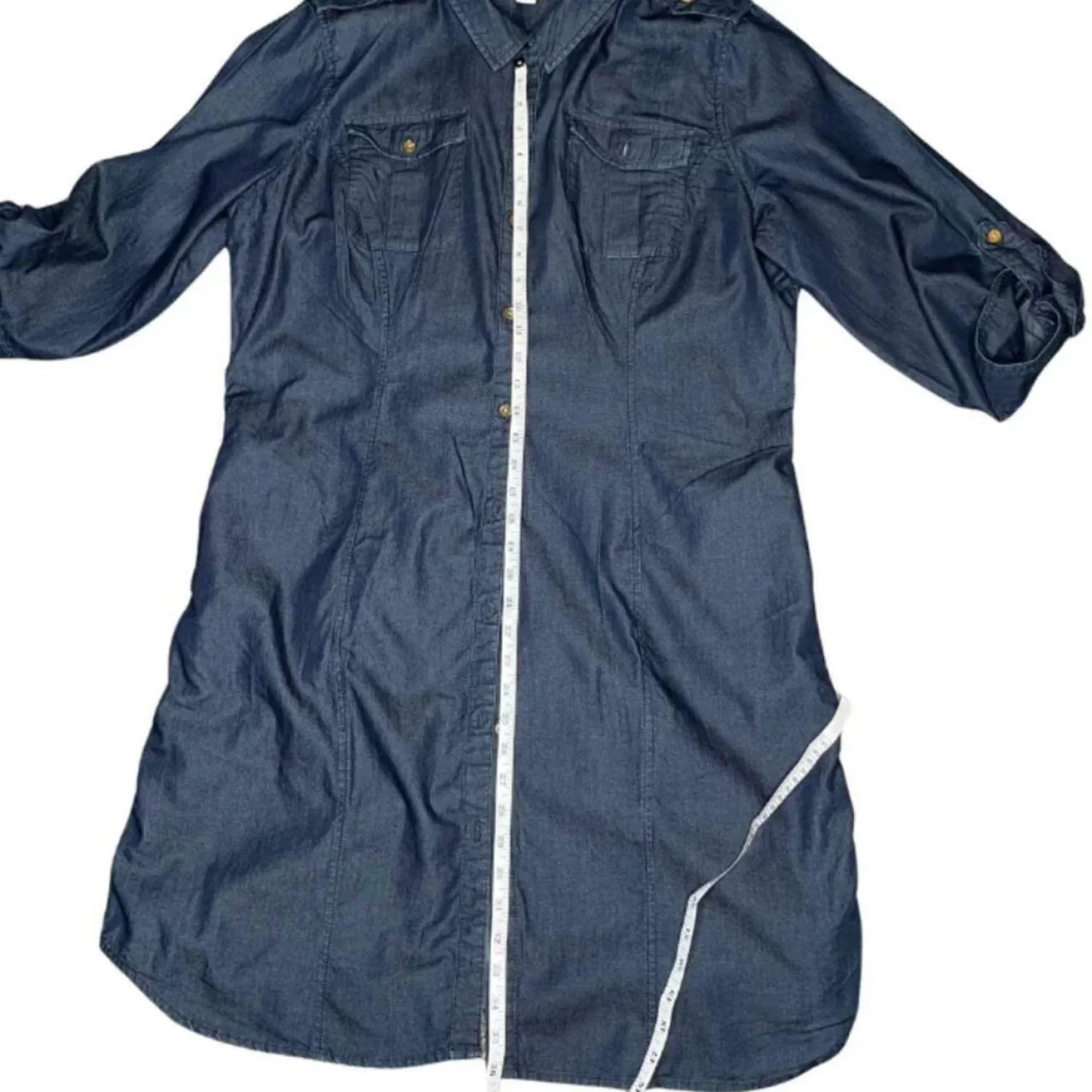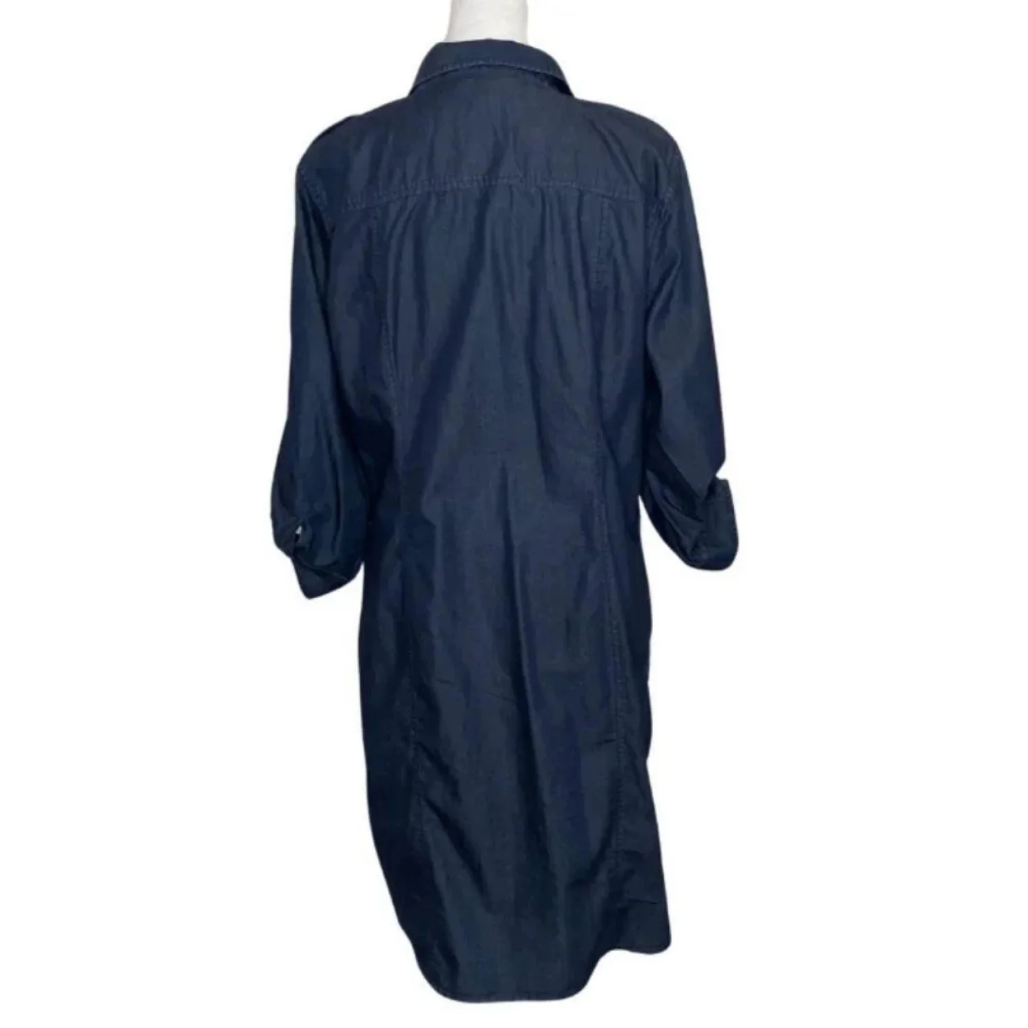 Jones New York Indigo Utility Denim Midi Dress Gold Button Dark Academia L Features: This is a heavy-duty indigo denim shirt dress with a structured, straight-cut silhouette. It features gold-tone hardware, functional epaulettes, and utility chest pockets that lean into a military-inspired aesthetic. The roll-tab sleeves allow for a customized drape, while the deep dark wash provides a clean, academic look without the usual distressing. • Style Profile: Dark Academia, Utility, Corporate Goth, Minimalist, Workwear, Indigo Denim, Military Inspired, Midi Dress, Gold Hardware, 90s Vintage • Flaws: No belt included • Happy to answer your questions! Super Fast Shipper!