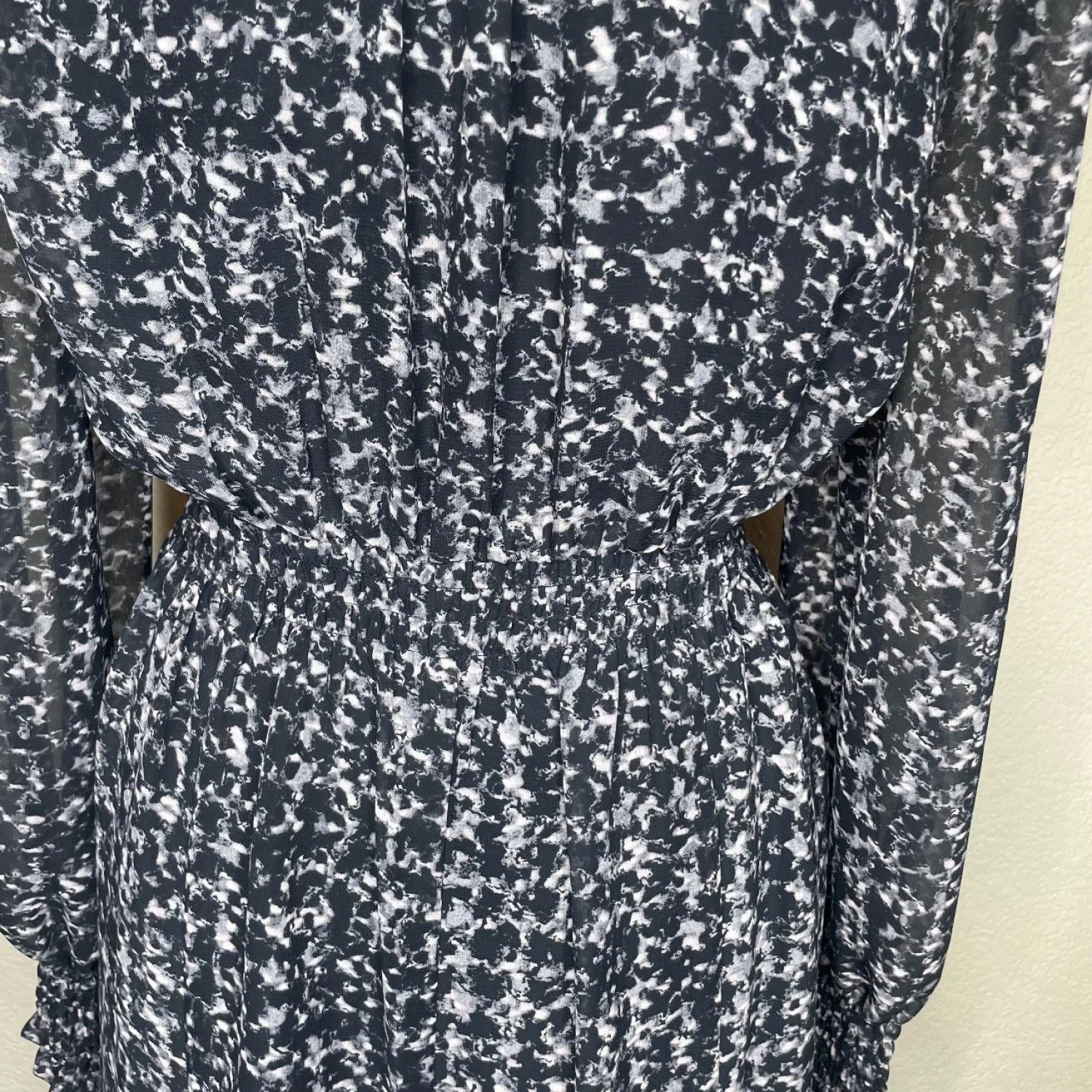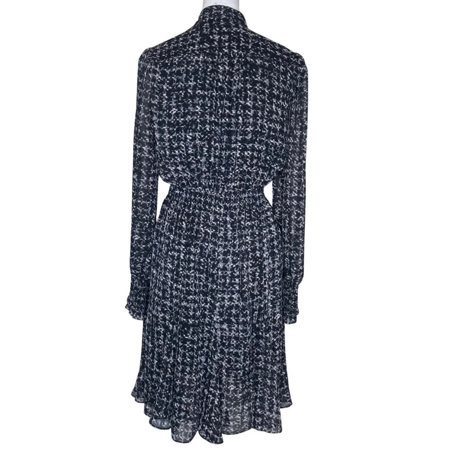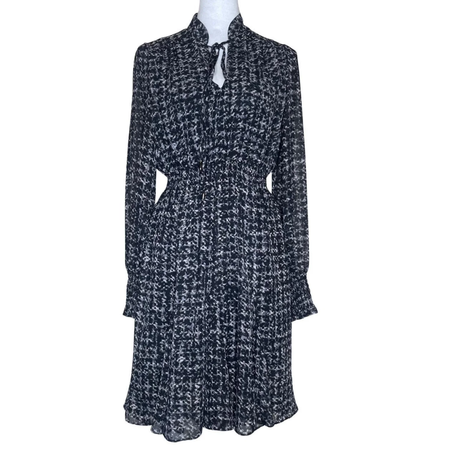 Just Taylor Dark Academia Chiffon Tie-Neck Smocked Waist Mini Dress Small Features: Leaning hard into the dark academia vibes. This Just Taylor mini features a grayscale abstract houndstooth-adjacent print on sheer chiffon. The silhouette hits with a sharp tie-neck detail, blouson sheer sleeves, and a heavy smocked waist for a structured cinch. Fully lined through the body. • Style Profile: Dark Academia, Whimsigoth, Grunge, Corporate Goth, Ethereal, Abstract Print, Smocked, Sheer Sleeves, Tie Neck, Moody • Flaws: No Holes, stains, or tears • Please see the photos for measurements (in inches). PTP: 16.5' Length: 36.5' Sleeve Length: 23.5' Happy to answer your questions! Super Fast Shipper! Bundle items for discounts!