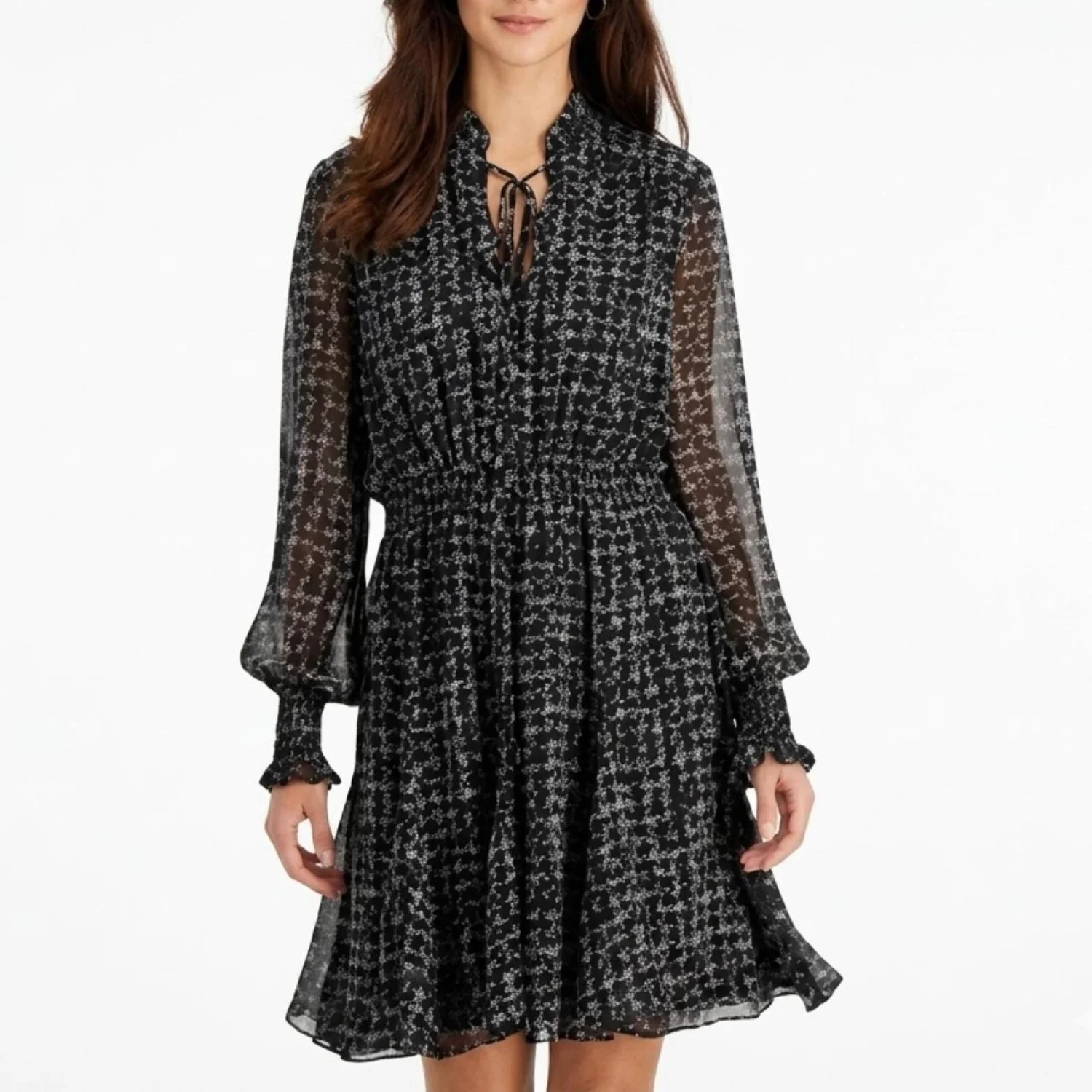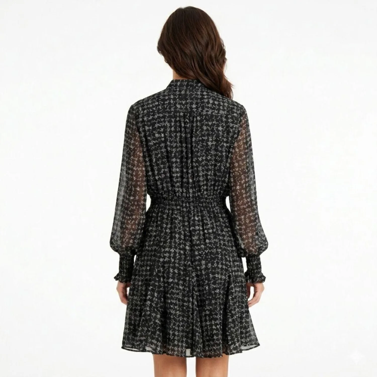 Just Taylor Dark Academia Chiffon Tie-Neck Smocked Waist Mini Dress Small