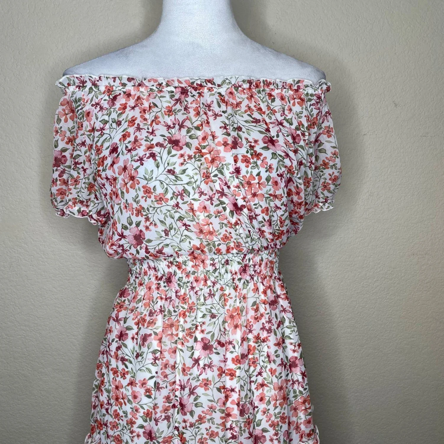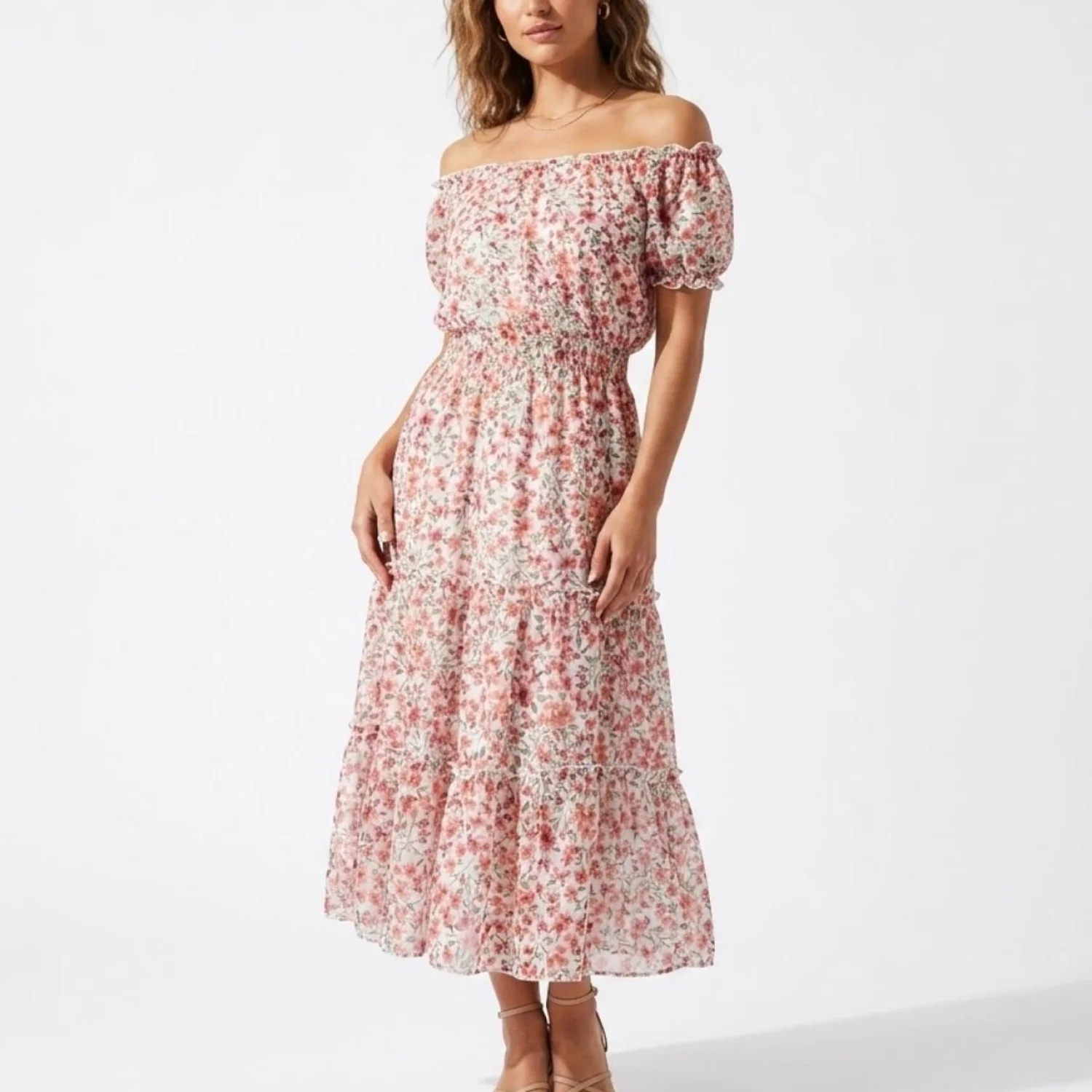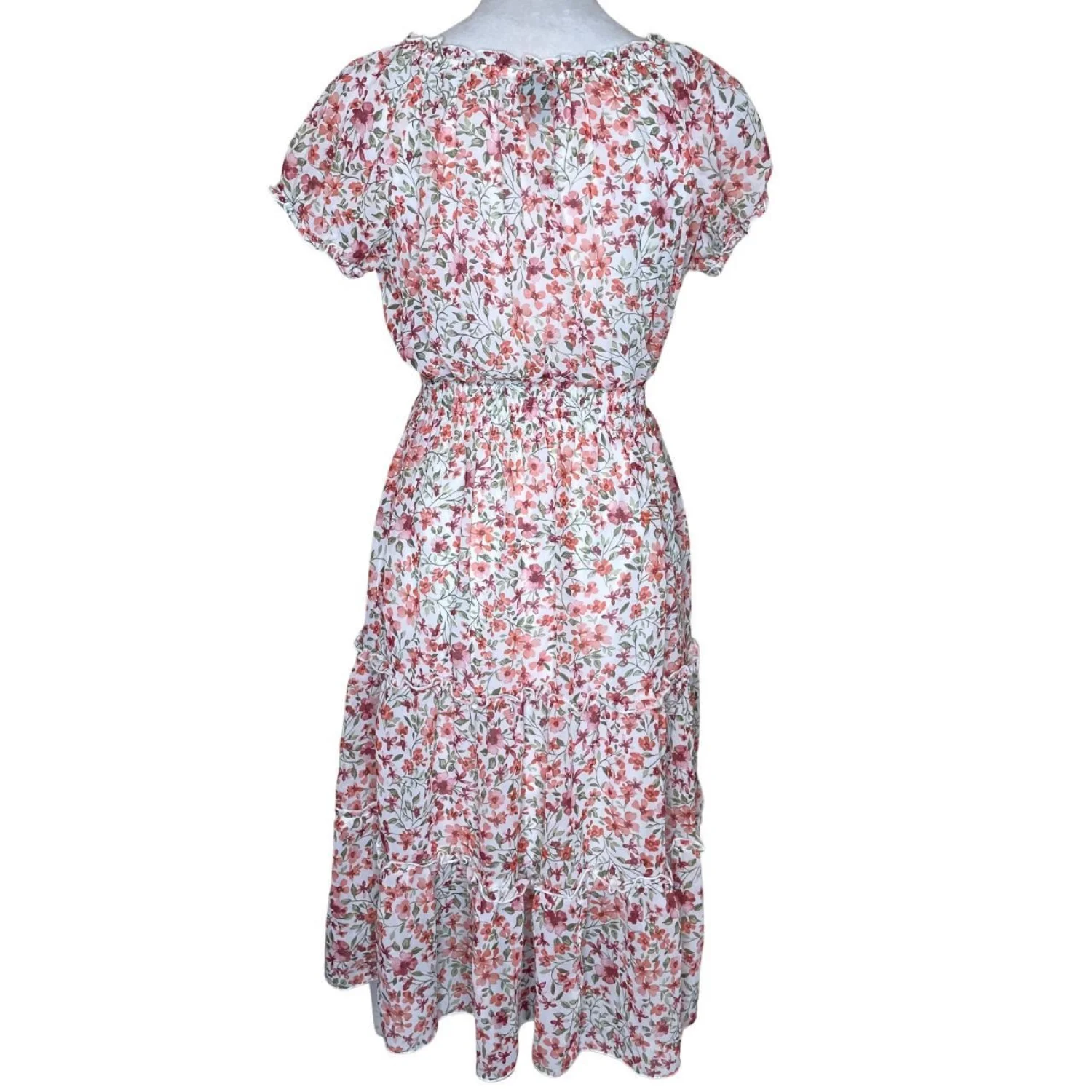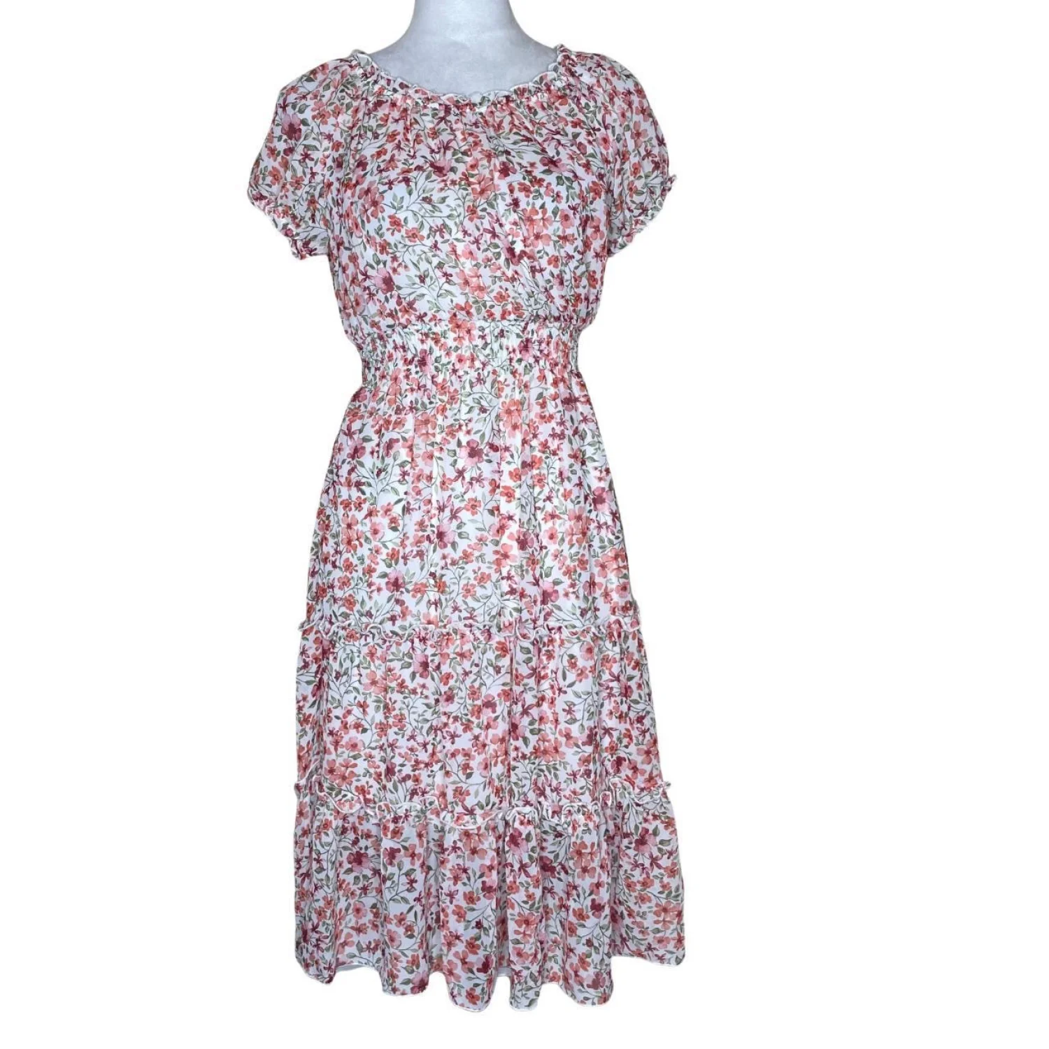 Kate & Lily Cottagecore Smocked Floral Midi Dress 4 Features: This is pure Cottagecore and Dollette energy. The silhouette features a heavy smocked bodice that cinches the waist, contrasted by a tiered, airy skirt with ruffle detailing. It has an elasticized neckline that can be worn off-the-shoulder for a milkmaid look or up for a classic peasant vibe. The ditsy floral print is a soft mix of terracotta and rose tones on a crisp white base. • Style Profile: cottagecore, coquette, dollette, milkmaid, prairie, ditsy floral, tiered, smocked, feminine, romantic, aesthetic, fairycore, summer dress, whimsical, soft girl • Flaws: No Holes, stains, or tears • Please see the photos for measurements (in inches). PTP: 15.5' Length: 32' Happy to answer your questions! Super Fast Shipper! Bundle items for discounts!