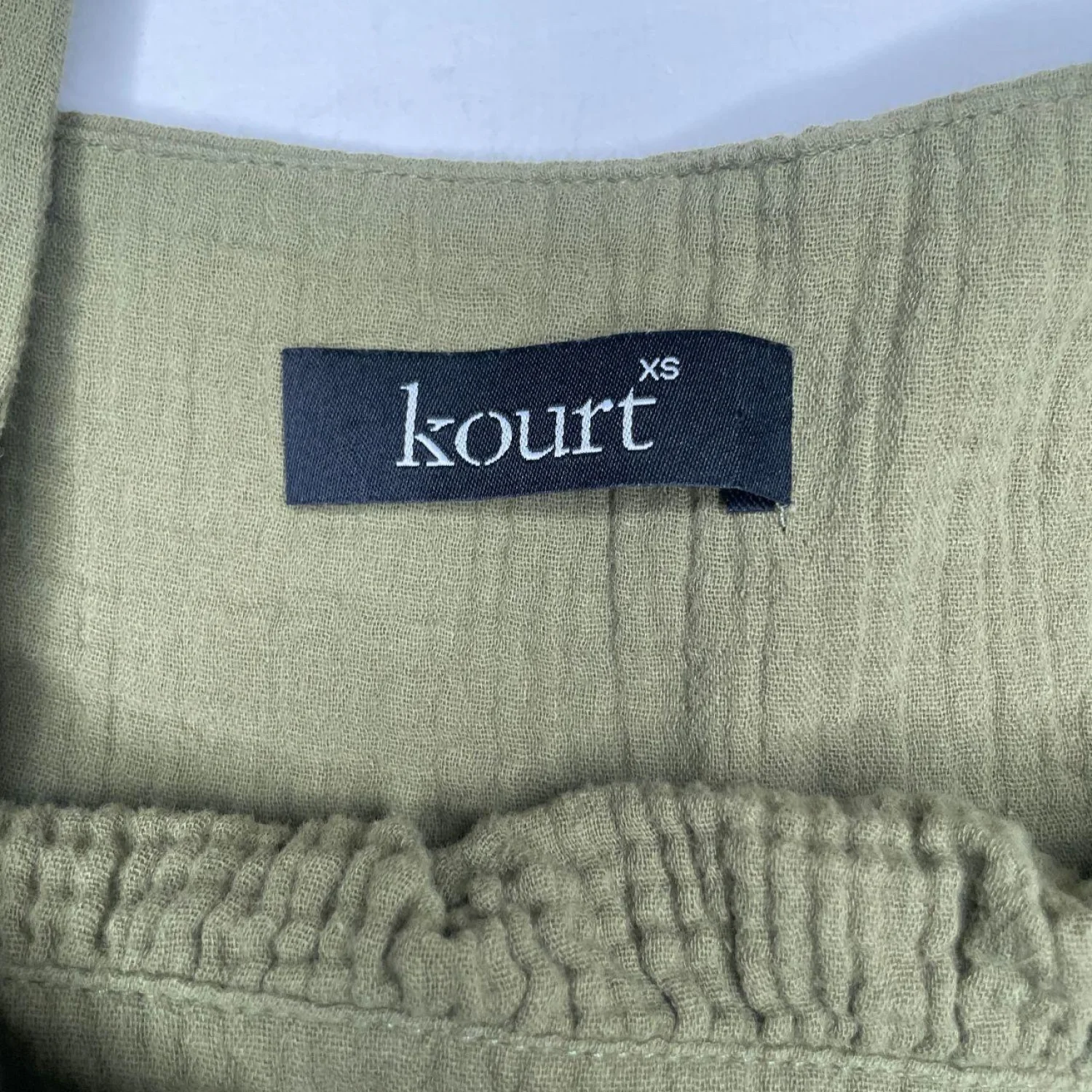 Kourt Sage Green Cotton Gauze Babydoll Top XS Cottagecore Ruffle Features: Breathable 100% cotton gauze piece. It features a square neckline and a smocked back panel for a snug, flexible fit through the bust. The double-layered ruffle sleeves add structural volume that balances out the flowy babydoll silhouette. Its crinkled texture means you can skip the iron and keep the relaxed, lived-in look. • Style Profile: cottagecore, prairie, boho, coastal grandmother, minimalist, organic, ethereal, earthy, soft girl, rustic • Flaws: No Holes, stains, or tears (Excellent pre-owned condition) • All measurements are approximate PTP: 15.5" Length: 18.5" Happy to answer your questions! Super Fast Shipper!