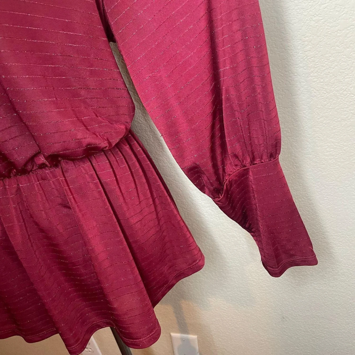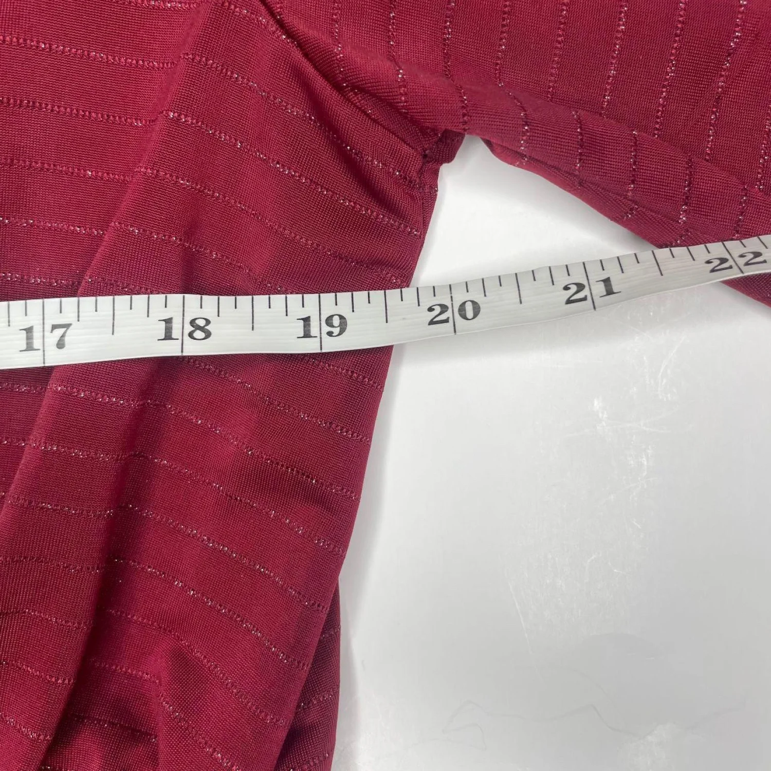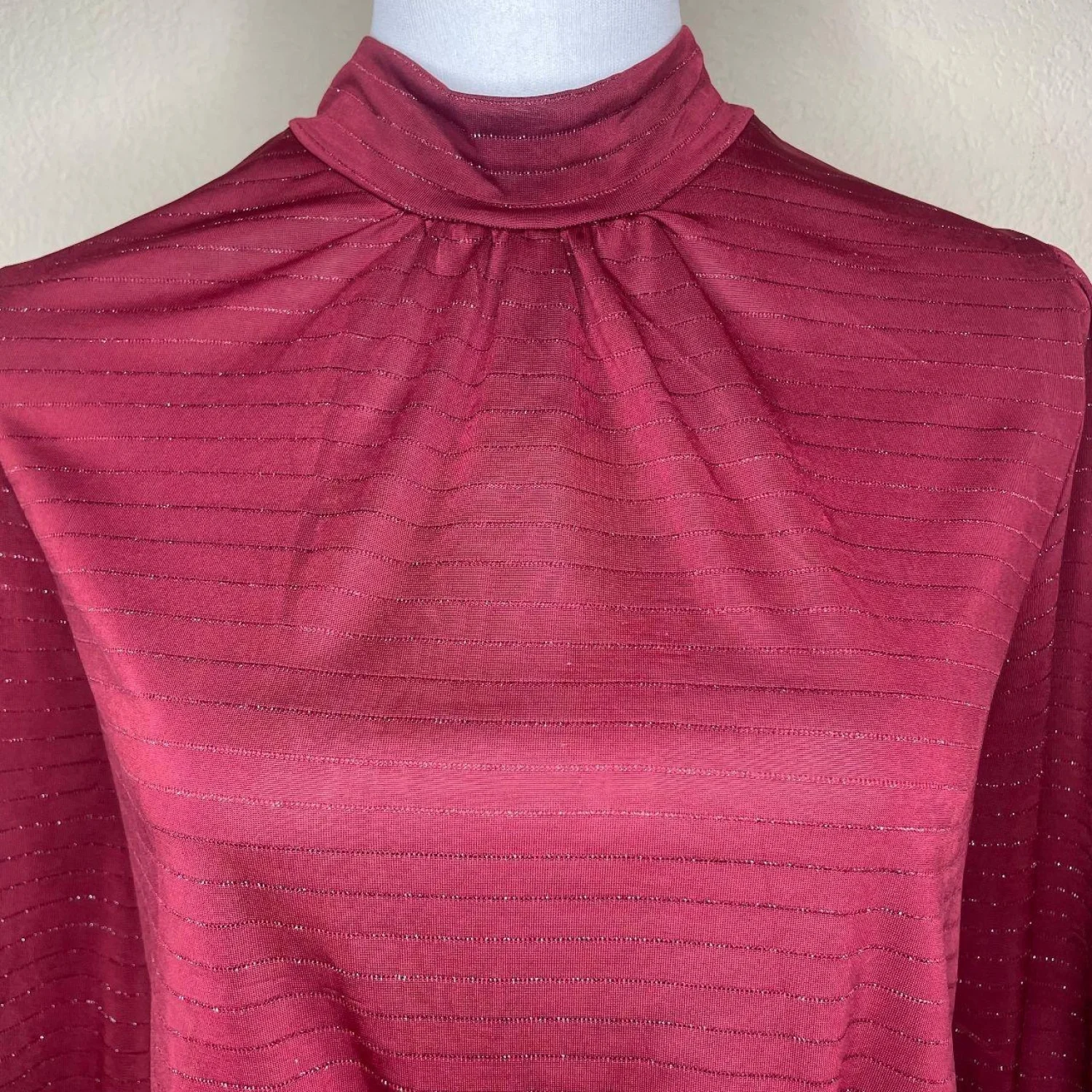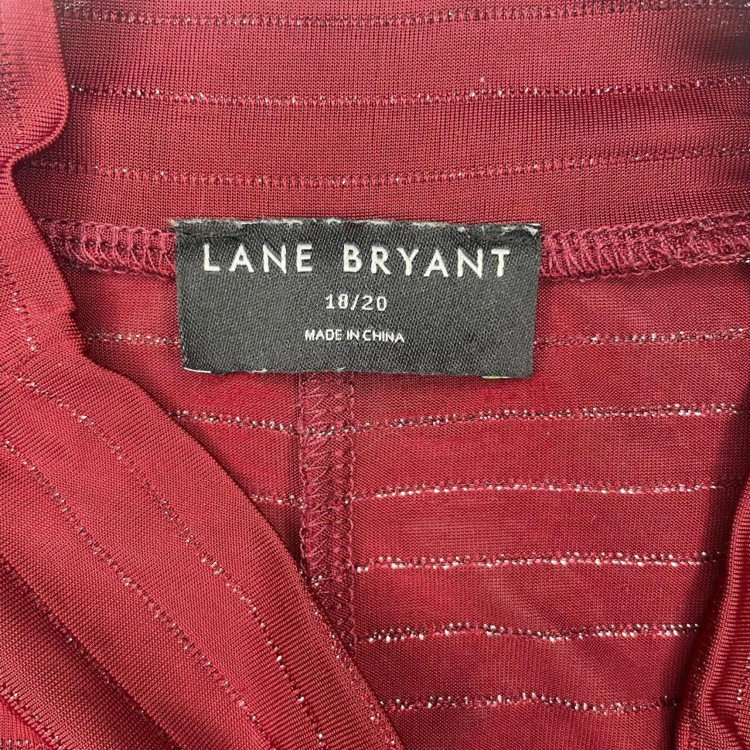 Lane Bryant Burgundy Metallic Shimmer Peplum Top Mock Neck Size 18/20 Features: Elevate your evening look with this stunning Lane Bryant peplum blouse in a rich burgundy wine hue. Featuring delicate metallic silver horizontal stripes, this top offers a subtle shimmer perfect for holiday parties or a night out. The elegant mock neck and smocked elastic waist create a flattering silhouette, while the long sleeves with wide button cuffs add a touch of sophisticated drama. Lightweight, stretchy, and effortlessly chic. • Style Profile: Whimsigoth, Holiday, Party, Festive, Shimmer, Metallic, Peplum, Business Casual, Coquette, Romantic, Evening Wear, Plus Size Fashion • Flaws: No Holes, stains, or tears (Excellent pre-owned condition) • All measurements are approximate PTP: 19.5" Length: 27.5" Sleeve Length: 23" Happy to answer your questions! Super Fast Shipper!