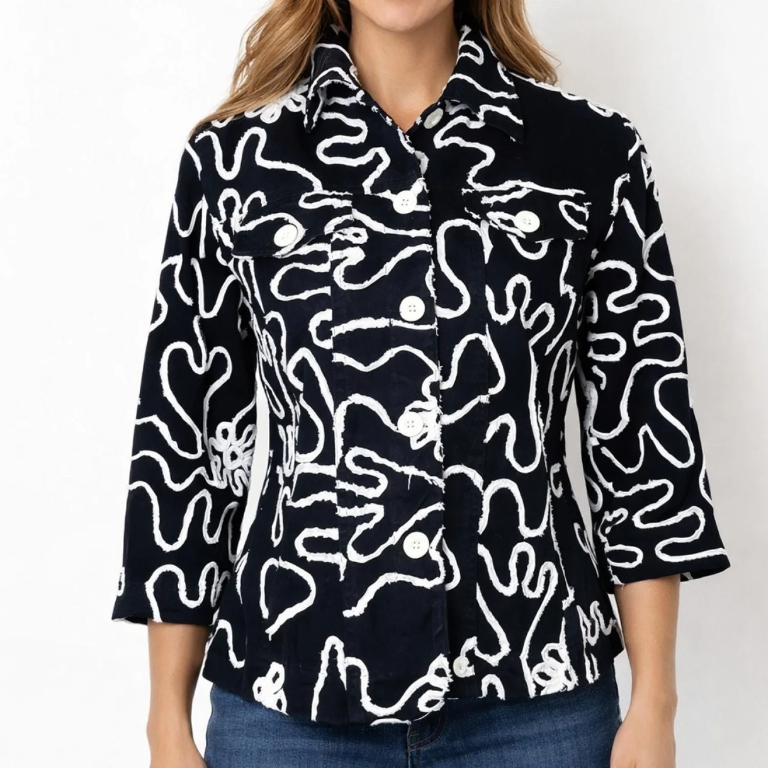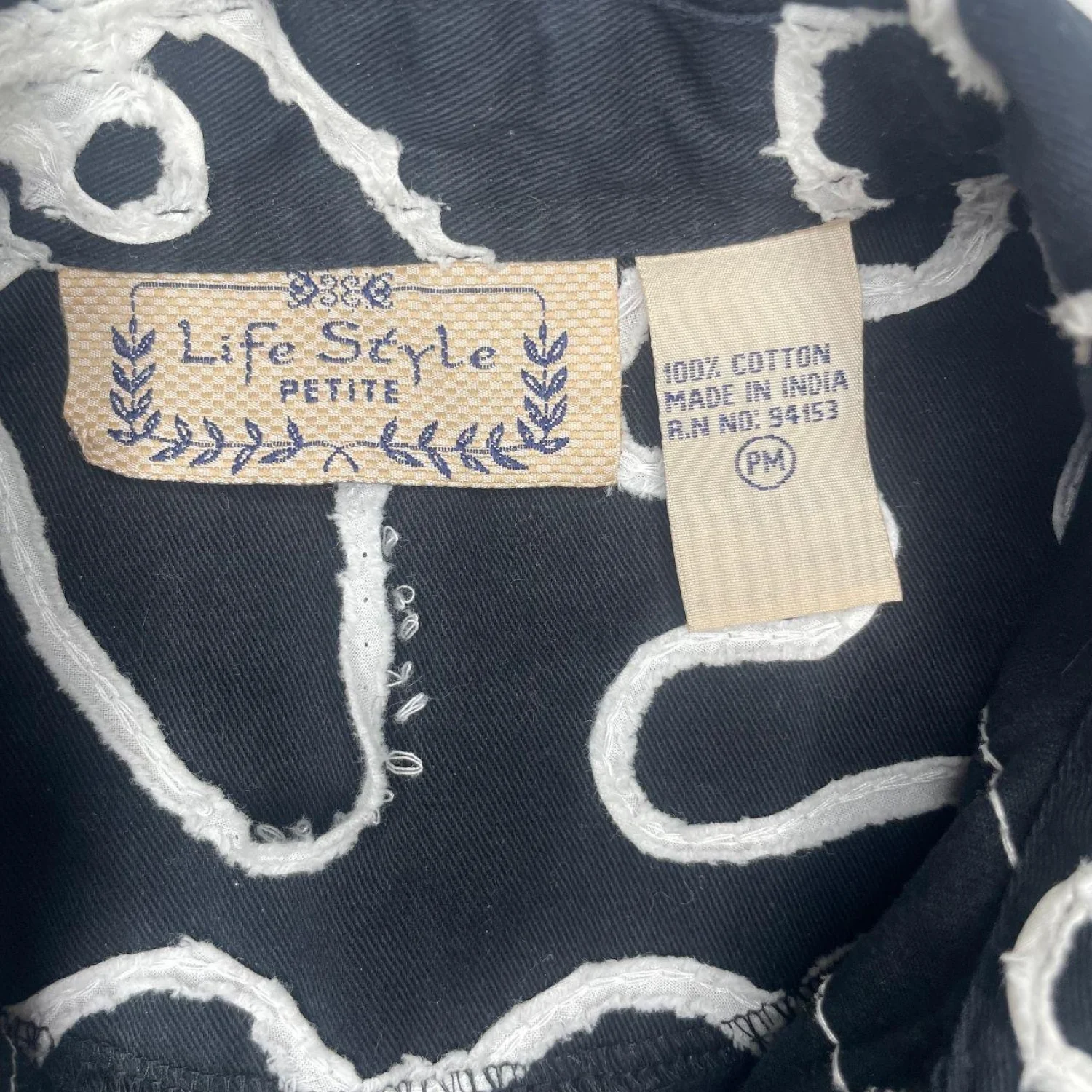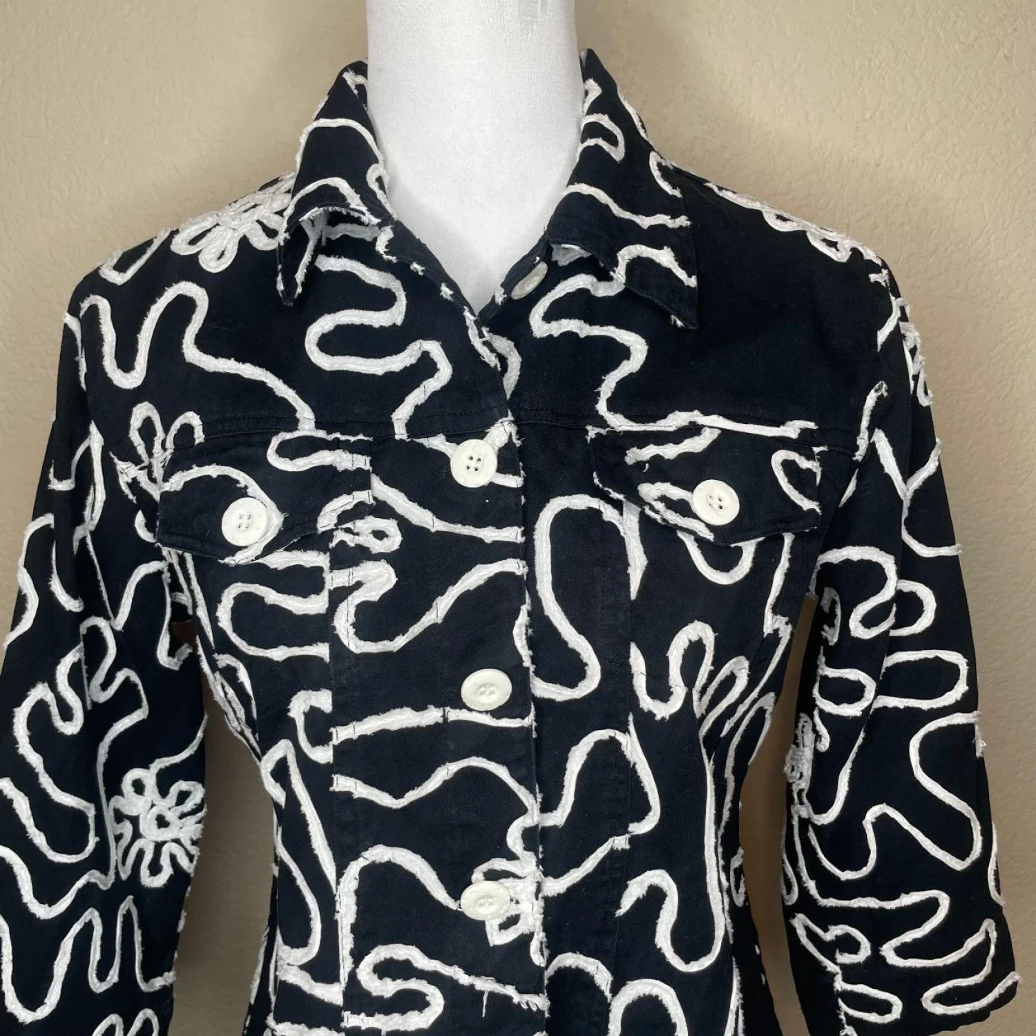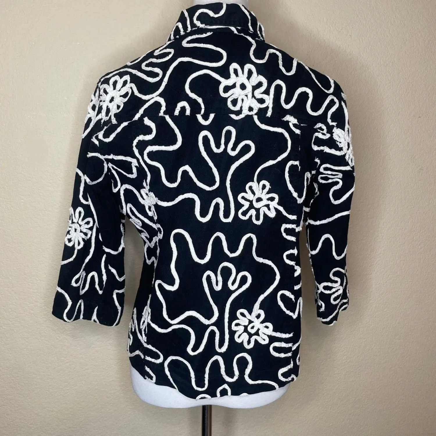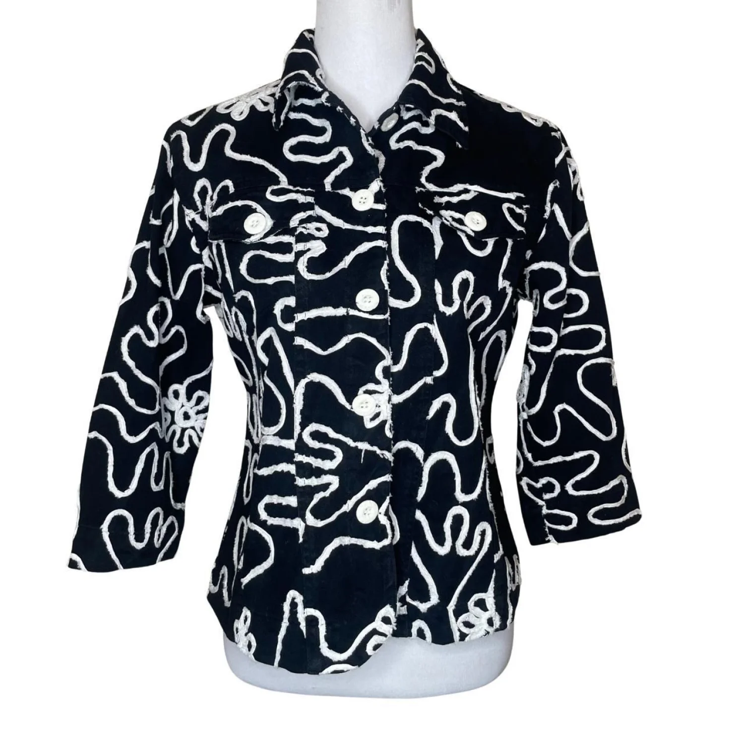 Life Style Petite Black & White Abstract Squiggle Embroidered Cotton Jacket PM Features: A bold, monochrome abstract "squiggle" pattern with raised, textured embroidery throughout, giving it a unique 3D effect. Crafted from 100% cotton, this lightweight jacket is perfect for layering. It includes a classic collar, button-front closure, and 3/4 sleeves for a modern, flattering silhouette. • Style Profile: Artsy, Boho, Minimalist, Monochrome, 90s Vintage, Whimsigoth, Abstract, Eclectic, Geometric, Textured, Lightweight, Casual, Boutique, Indie, Funky • Flaws: No Holes, stains, or tears (Excellent pre-owned condition) • All measurements are approximate PTP: 19.5" Length: 22" Sleeve Length: 16" Happy to answer your questions! Super Fast Shipper!