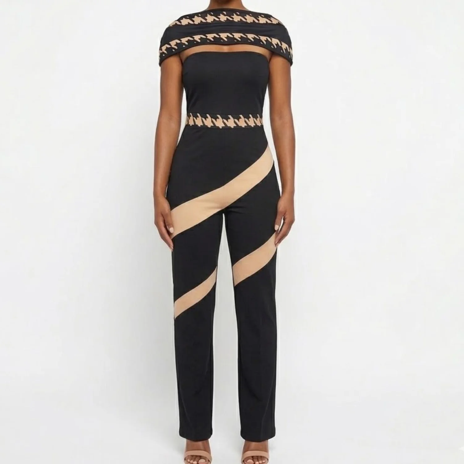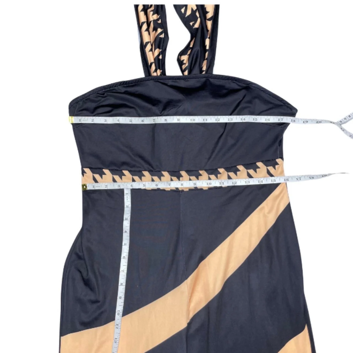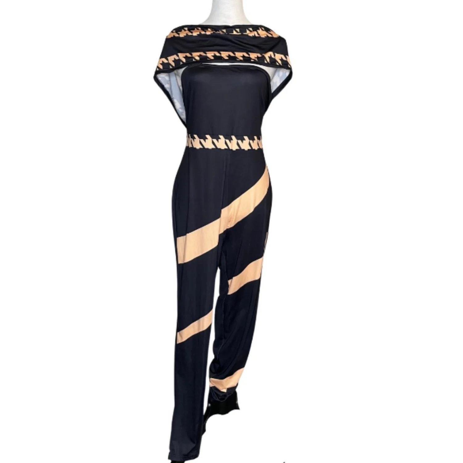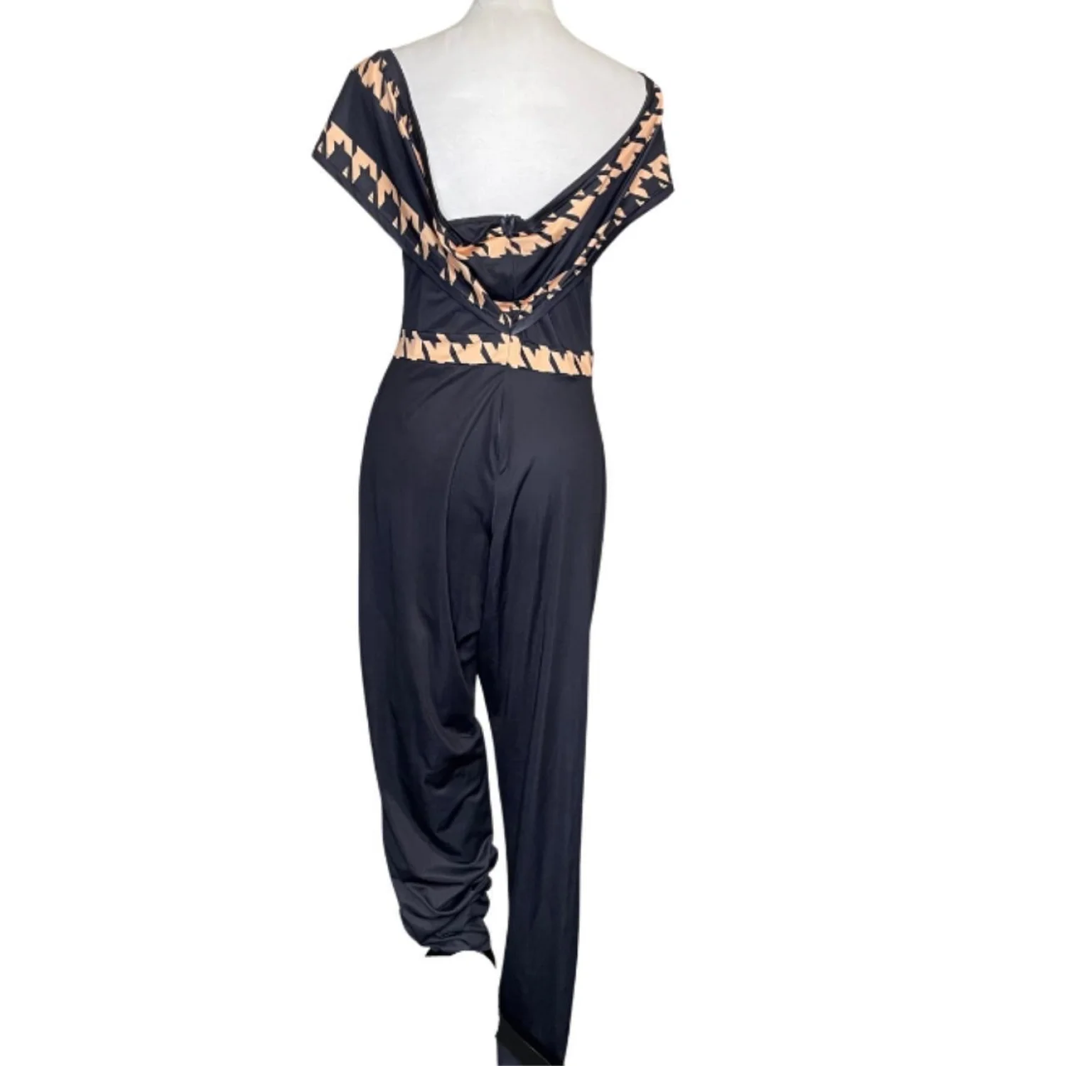 Loragal Baddie Houndstooth Colorblock Cold Shoulder Jumpsuit XL Features: Graphic baddie energy. This Loragal jumpsuit features a sharp cold-shoulder silhouette with an attached wrap-style neckline. The black bodycon fit is broken up by bold, diagonal tan stripes and a high-contrast houndstooth trim at the bust and waist. It’s a slinky, high-stretch jersey that hugs every curve while the tapered leg keeps the lines clean. Perfect for a night out when you want to look expensive without the effort. • Style Profile: Baddie, Streetwear, Graphic, Colorblock, Clubwear, Bodycon, Houndstooth, Edgy, Night Out, Curve-hugging • Flaws: No Holes, stains, or tears • Please see photos for measurements (in inches). PTP: 18' Waist: 16' Length: 42.5' • Happy to answer your questions! Super Fast Shipper!