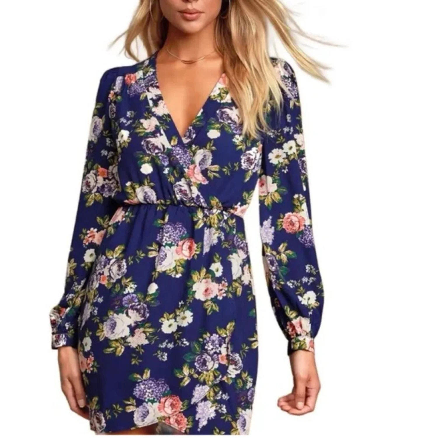 Lulus That's a Wrap Navy Blue Floral Mini Summer Dress Feminine Romantic Size Med Features: • Style Profile: feminine flowy soft modern boho event occasion spring fall brunch, date night • Flaws: No Holes, stains, or tears • Please see the photos for measurements (in inches). PTP: 17' Length:31.5-34 ' Sleeve Length: 23.5' Happy to answer your questions! Super Fast Shipper! Bundle items for discounts!