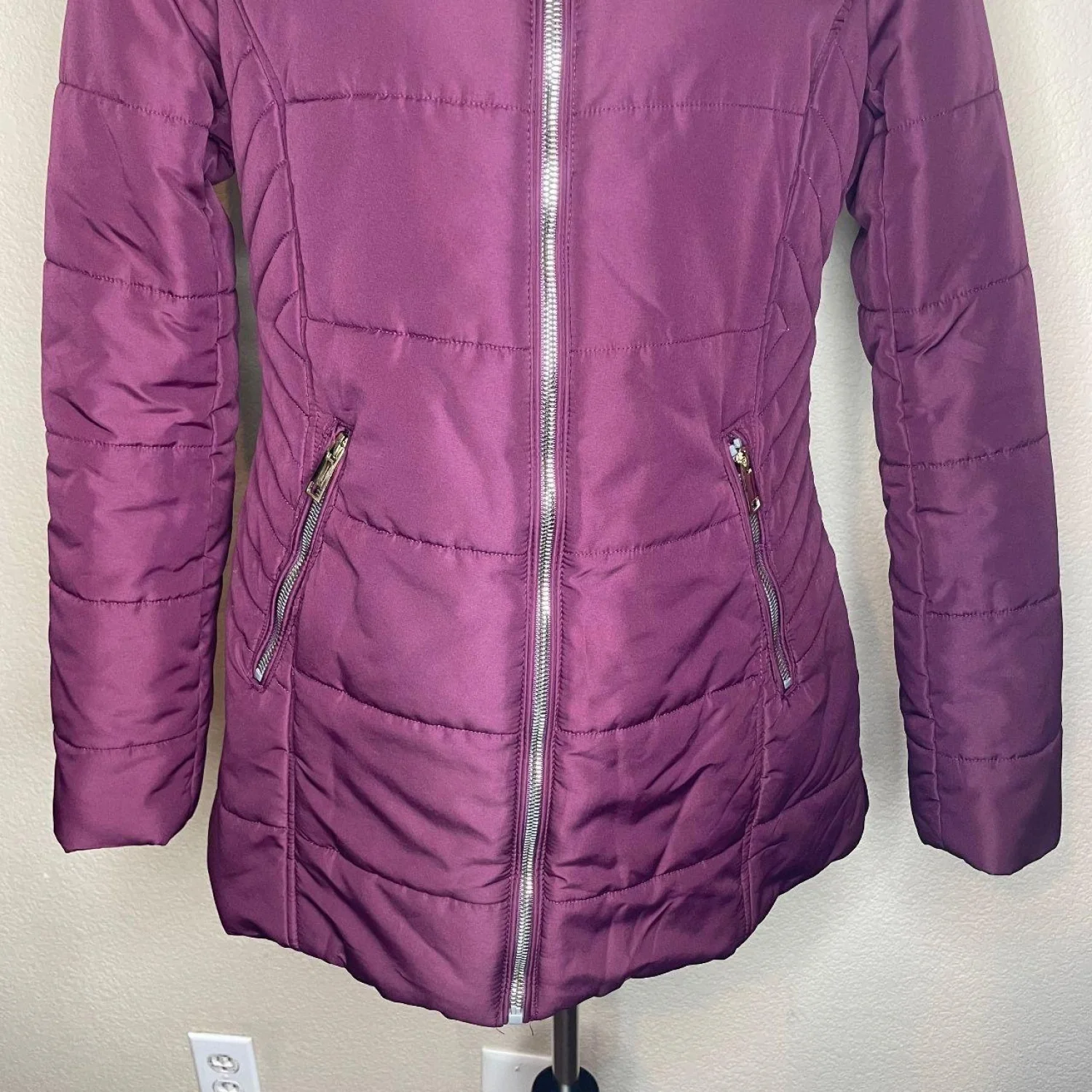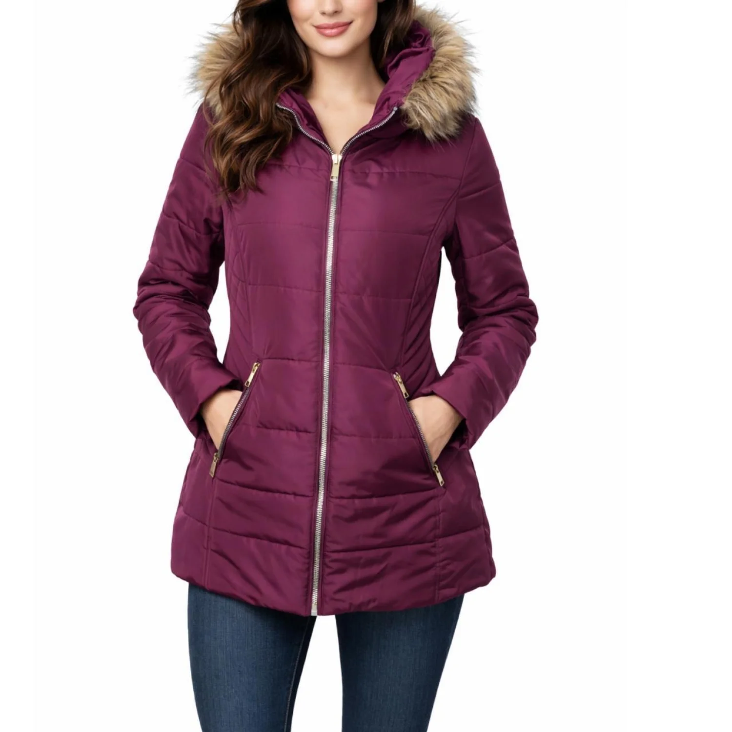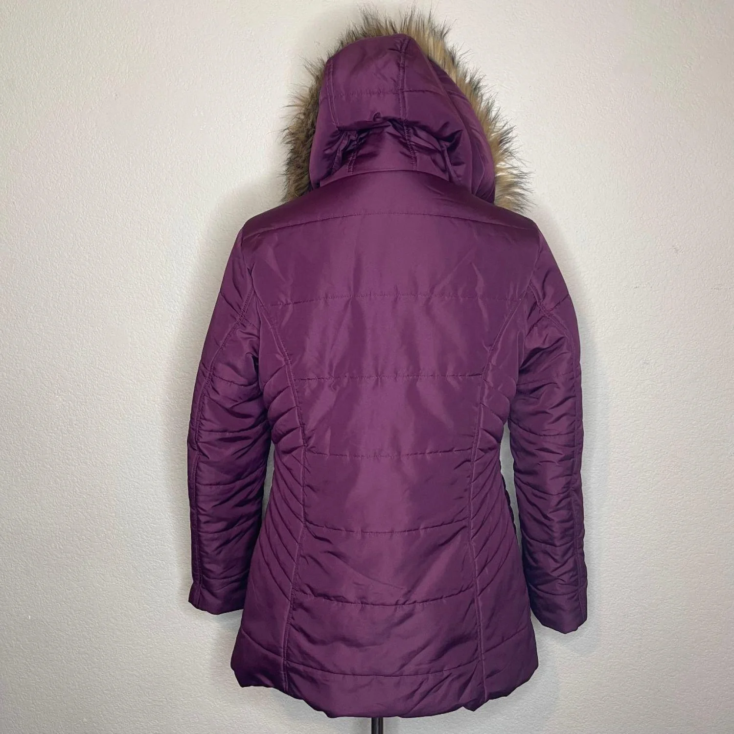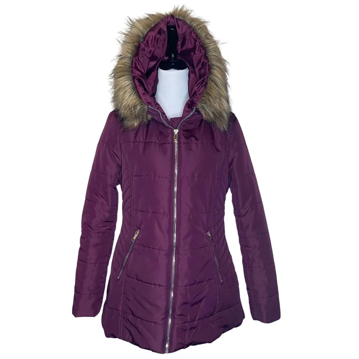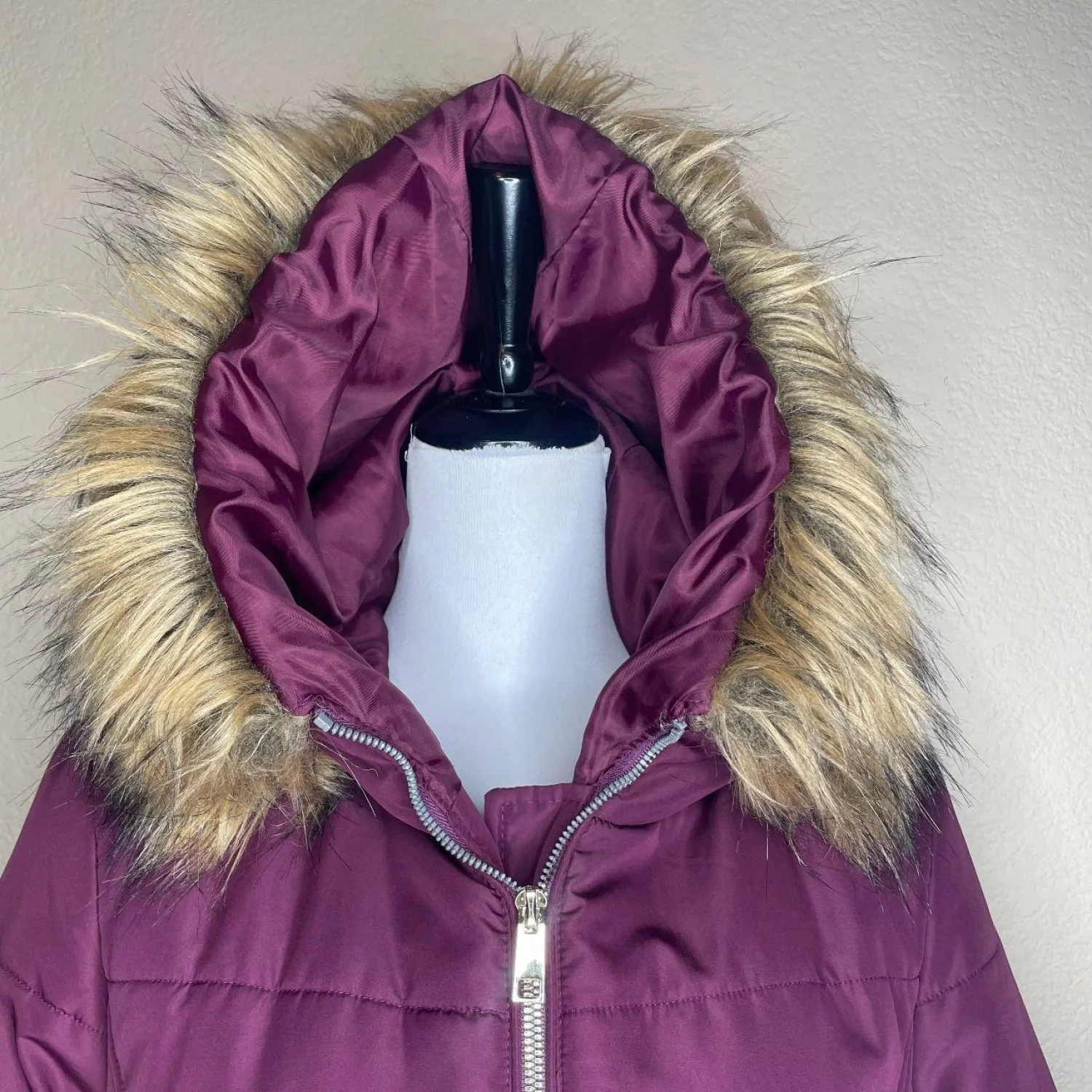 Maralyn & Me Dressed to Impress Puffer Jacket Maroon Purple Faux Fur Hood Large