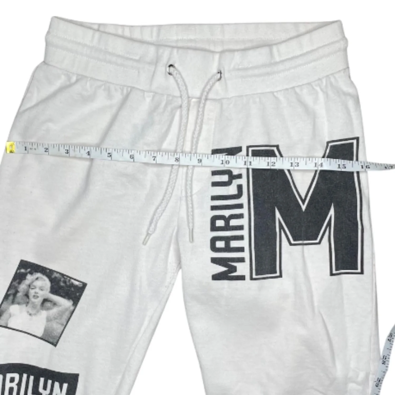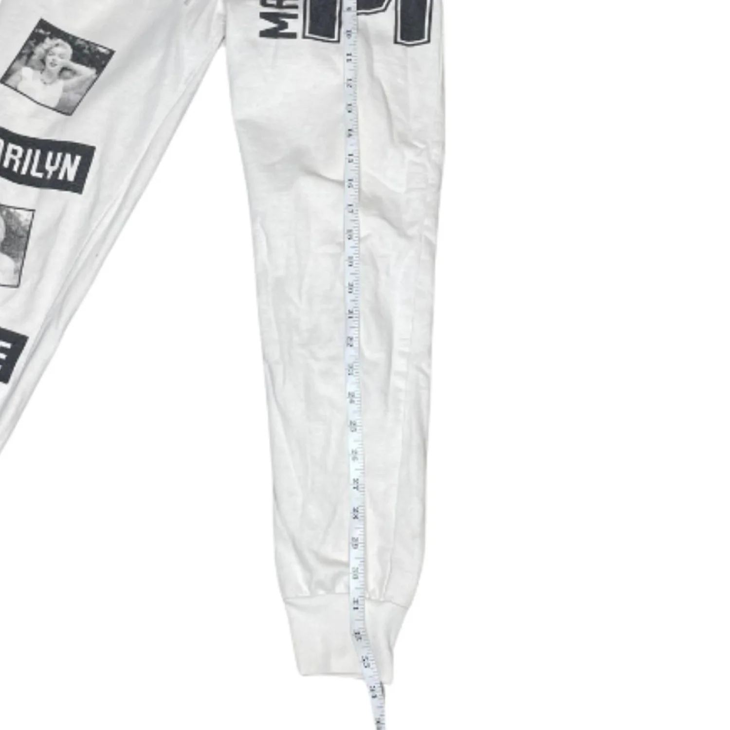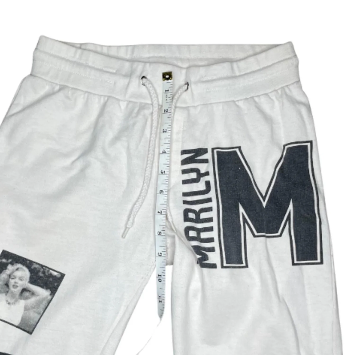 Features: Iconic Marilyn Monroe graphic sweatpants in a crisp white colorway. These joggers feature a vertical collage of black and white Marilyn photos on one leg and a large "M" varsity-style graphic on the hip. Perfect for a streetwear or Y2K-inspired look! • Style Profile: Y2K, Streetwear, Grunge, Indie, Vintage-Inspired, Retro, Old Hollywood, Cinephile, Coquette, Soft Grunge, Graphic, Aesthetic, Loungewear, Mob Wife, 90s Style • Flaws: No Holes, stains, or tears • Please see photos for measurements (in inches). Waist: 15-16' Length: 33.5 ' • Happy to answer your questions! Super Fast Shipper!