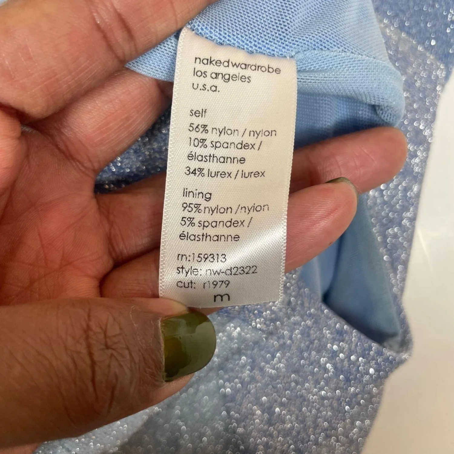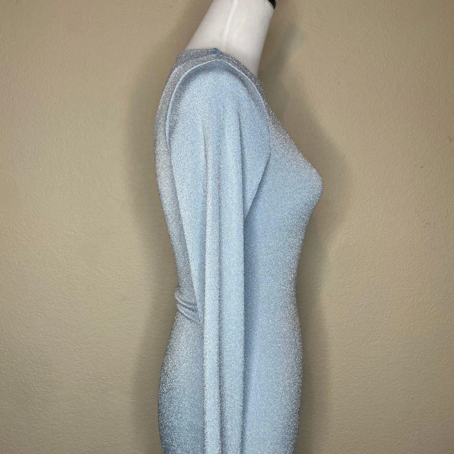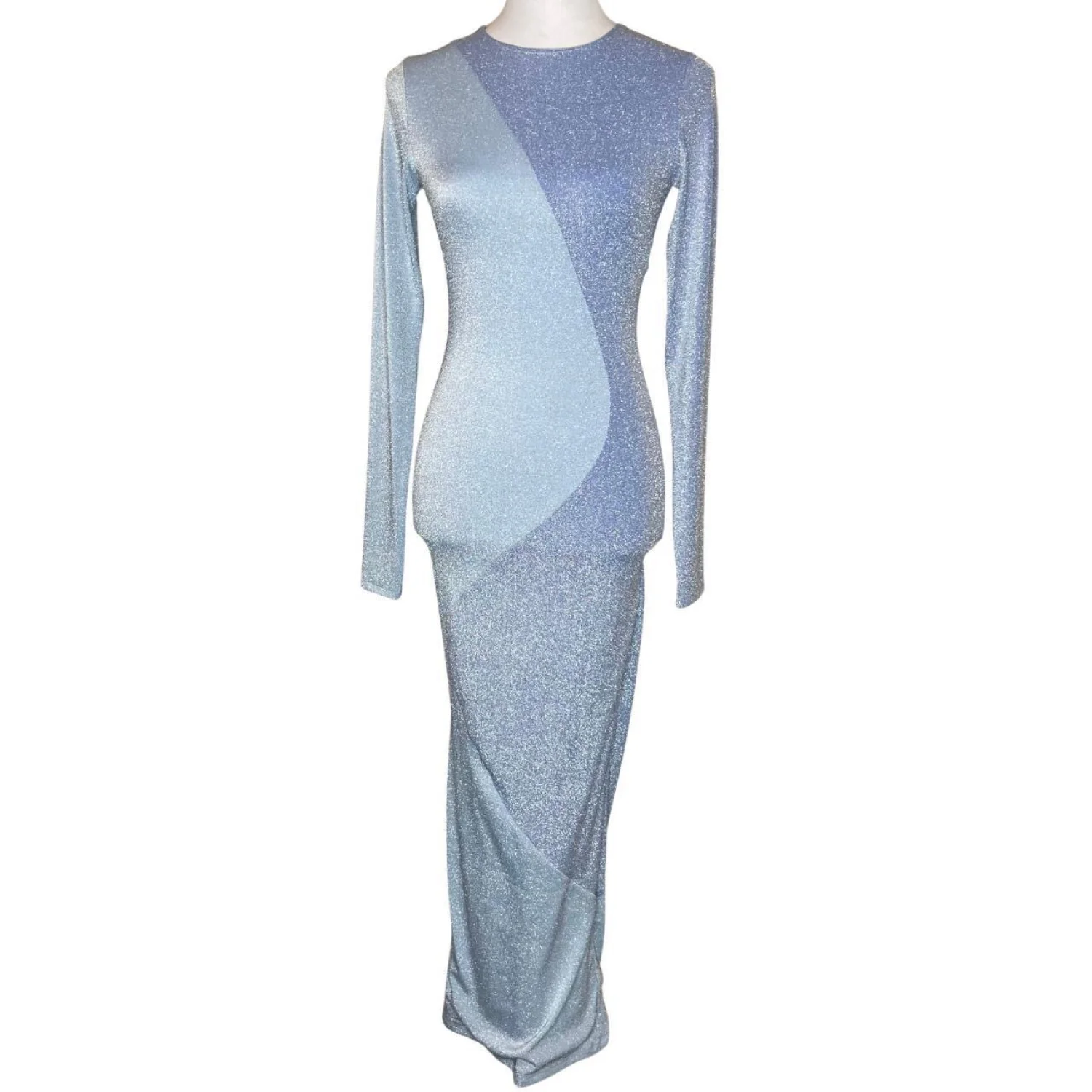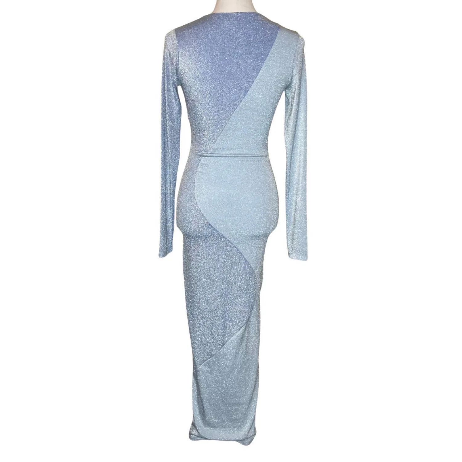 Naked Wardrobe Blue Shimmer Glow For It Maxi Dress Two Tone M Features: Step into the spotlight with this stunning "Glow For It" maxi dress. Featuring a curve-hugging bodycon silhouette, this dress showcases a unique two-tone diagonal shimmer design in icy and deep blue. The long sleeves and crew neckline offer a sleek, sophisticated look, while the Lurex-infused fabric provides a brilliant sparkle that catches every light. Double-lined for a smooth fit and ultimate comfort. Perfect for birthdays, formals, or any event where you want to glow! • Style Profile: glam, sparkly, bodycon, mermaidcore, night out, bachelorette, evening wear, shimmer, futuristic, chic, event dress, party, blue aesthetic, high shine, form fitting • Flaws: There is a small, faint snag/pull in the shimmer fabric which is pictured. It is very subtle due to the glittery texture and does not affect the integrity of the dress • All measurements are approximate PTP: 13.5" Length: 54" Sleeve Length: 24"