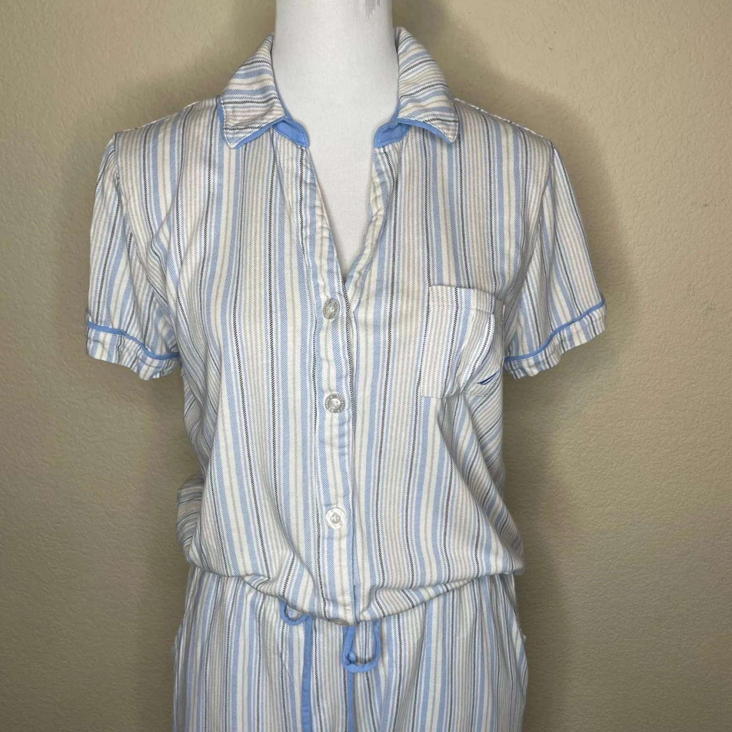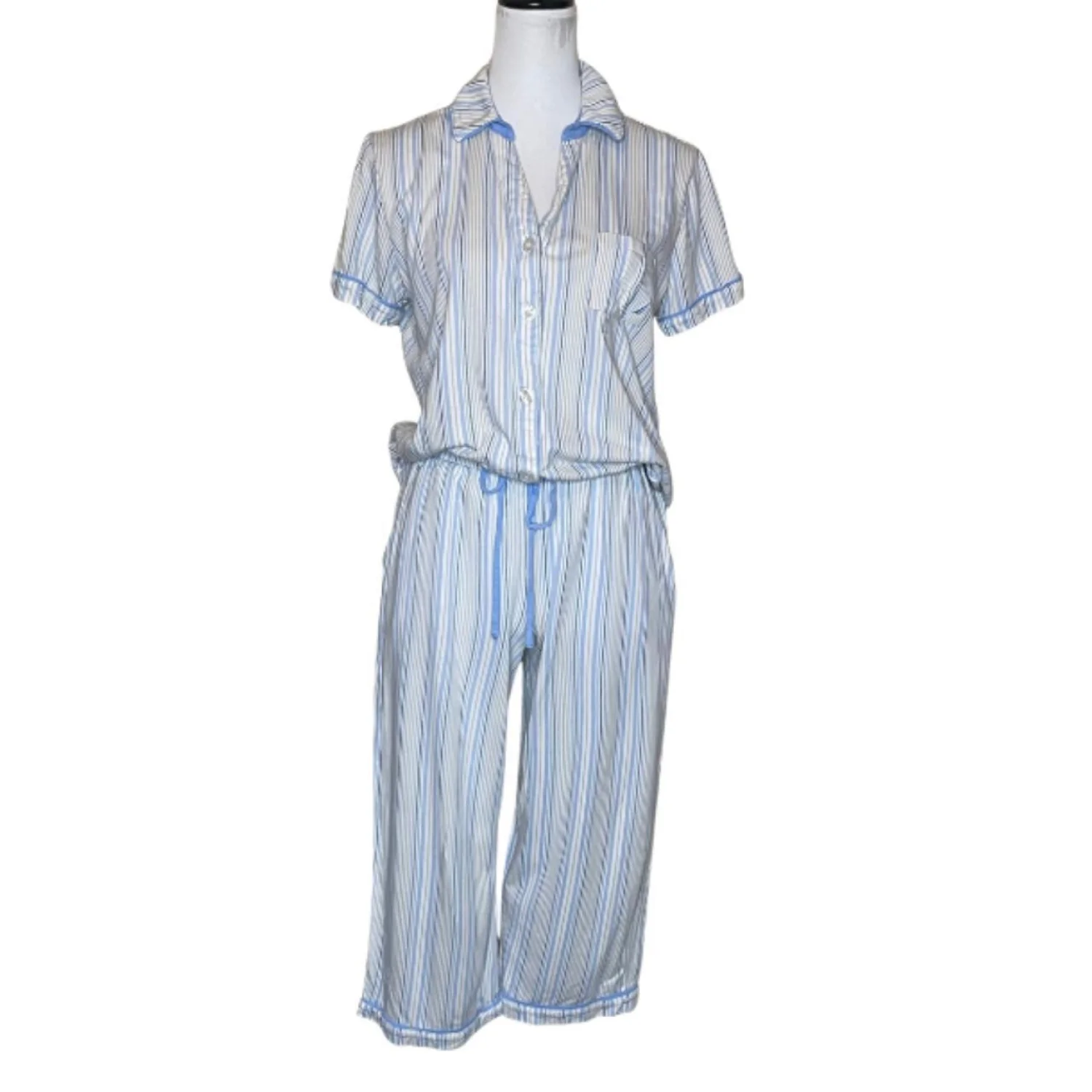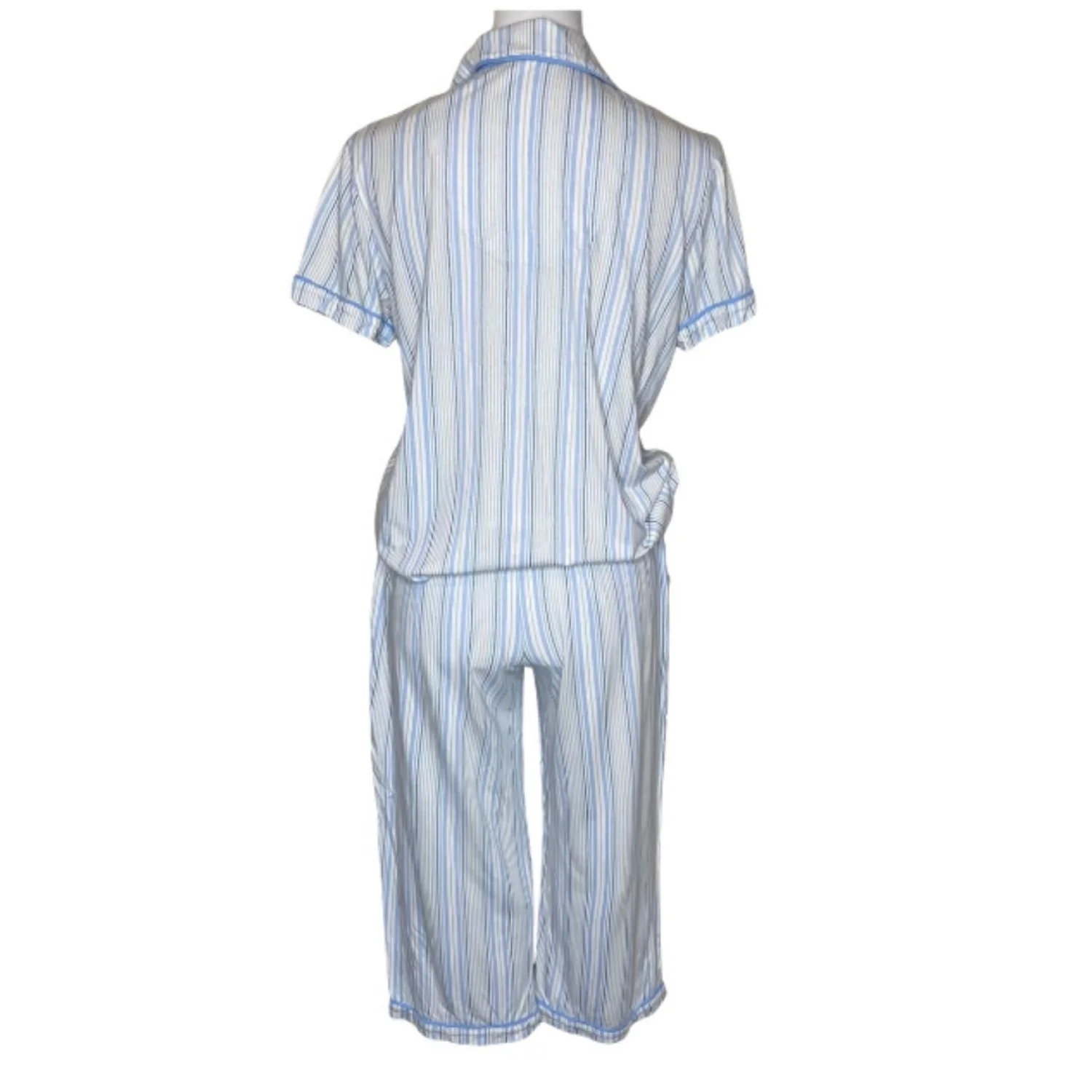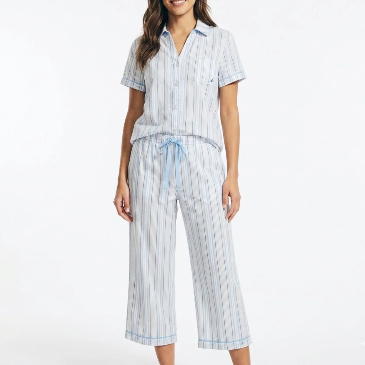 Nautica Coastal Grandma Blue Striped Button-Down Crop Pajama Set Sz Small