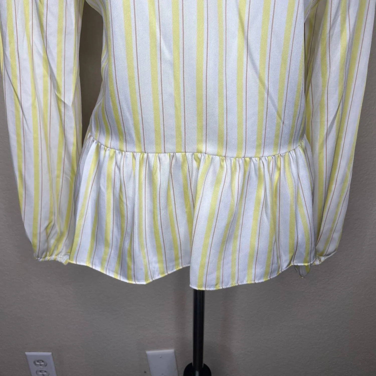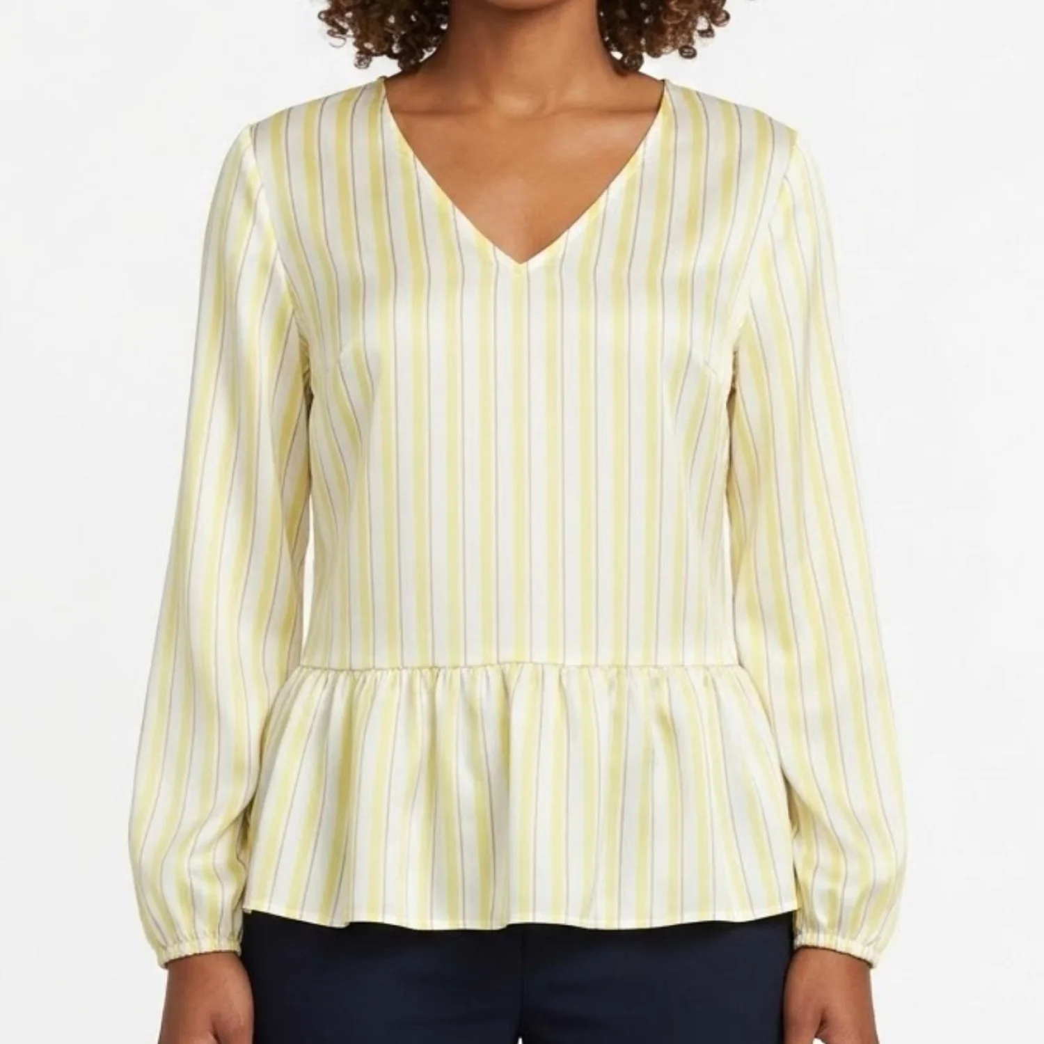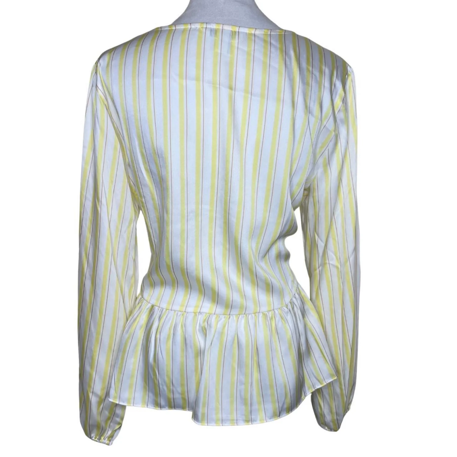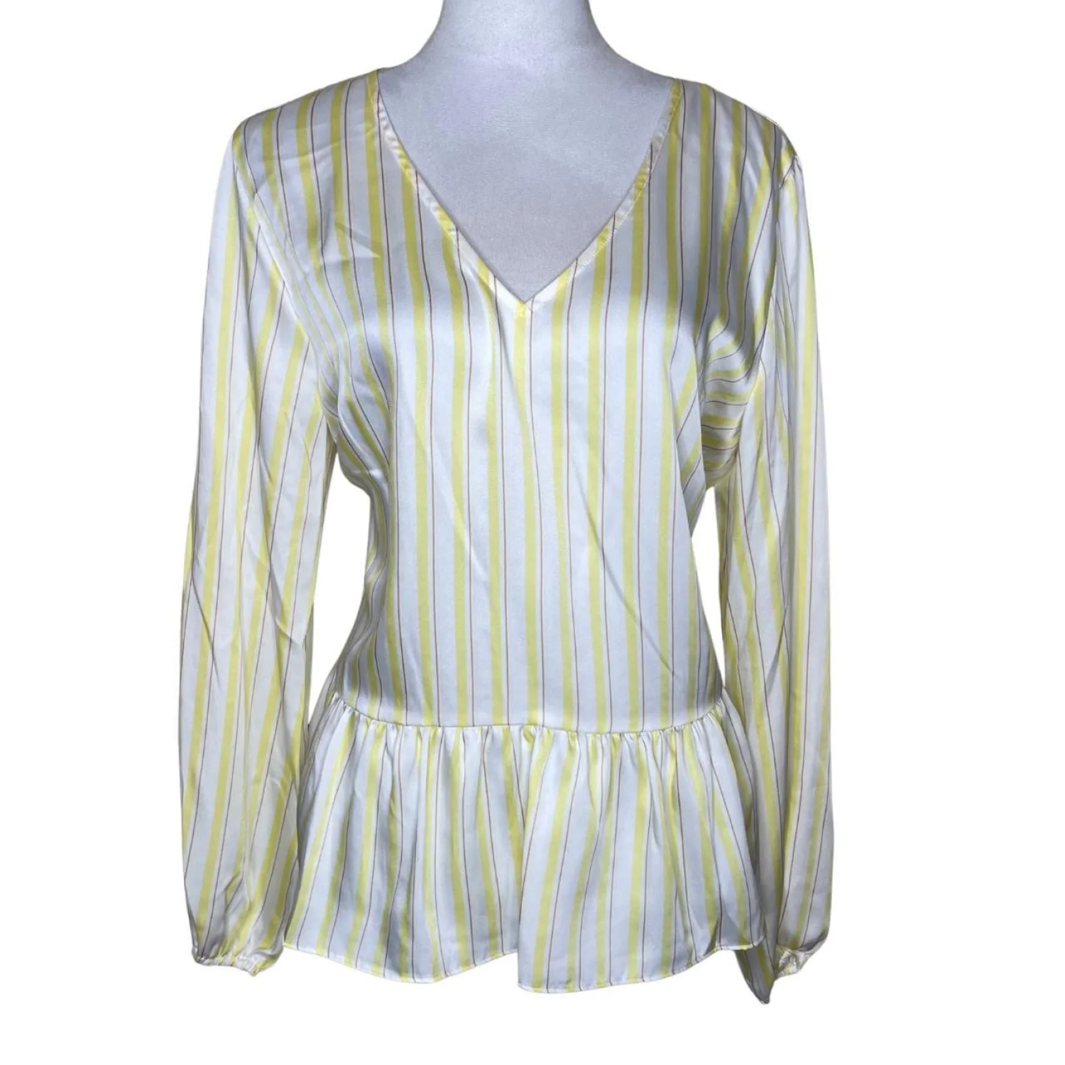 Nine West Yellow White Striped V-Neck Peplum Blouse Long Sleeve Size L